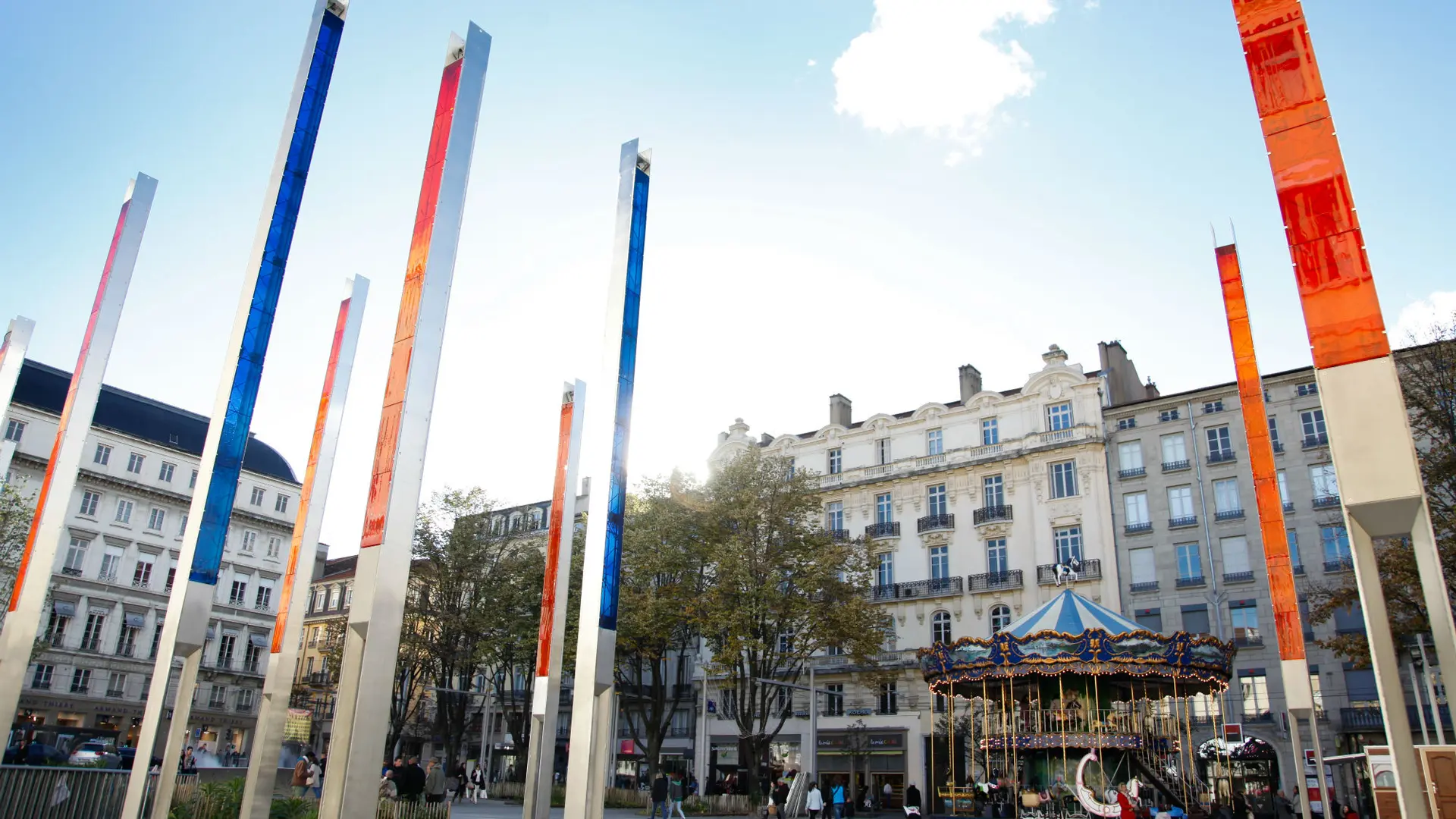Here, coloured blown glass and sheet metal work are not mere skills: they are the ingredients of a metamorphosis. Gone is the frozen square, designed to frame institutional buildings. These glass and metal masts will bring it to life.