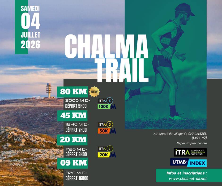 En 2025 : Chalma'Bref 9km/ D+370 - Chalma'Classique 20km/D+780 - Chalma'Rude 30km/ D+1170 - Chalma'Rathon 45km / D+1840