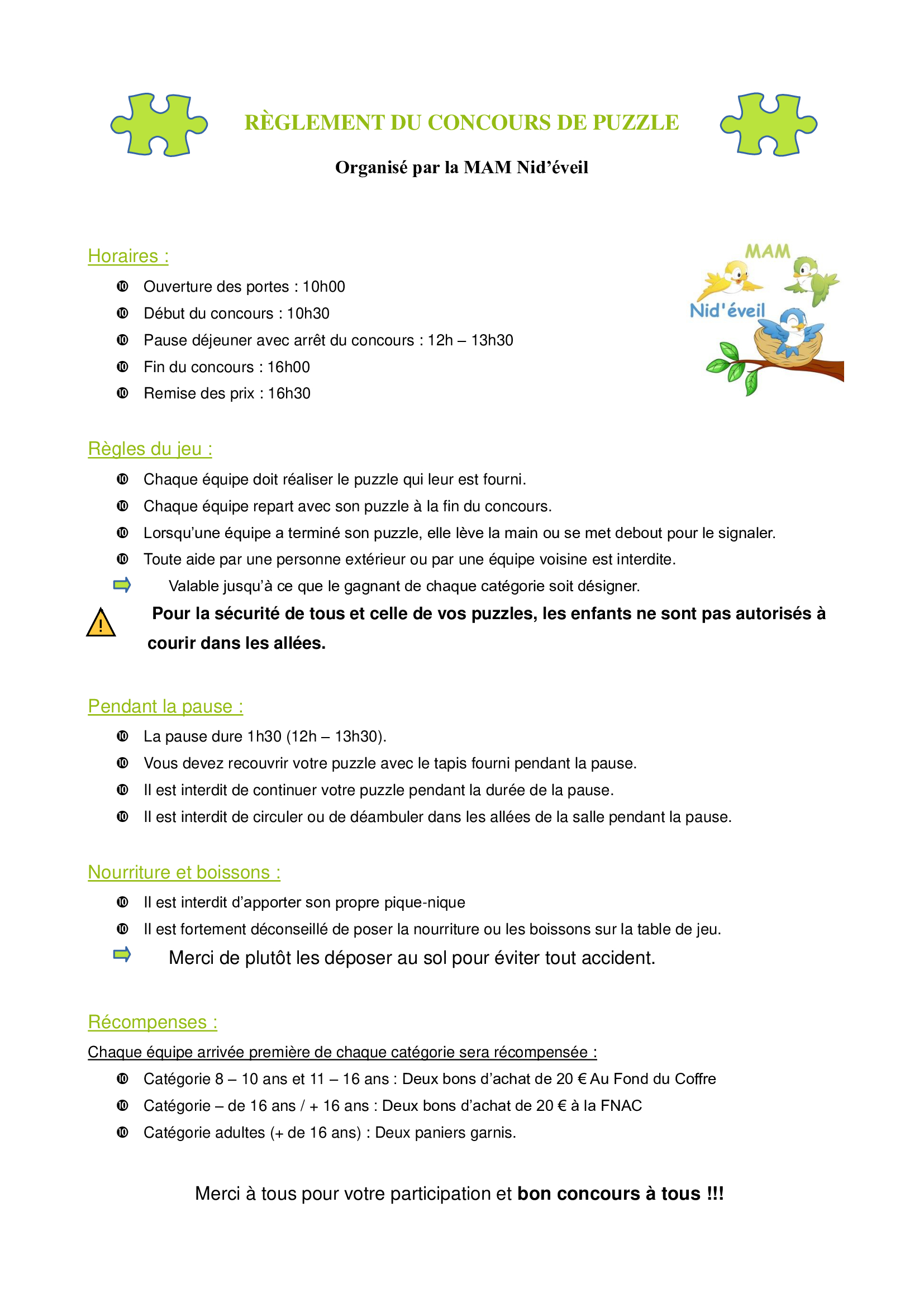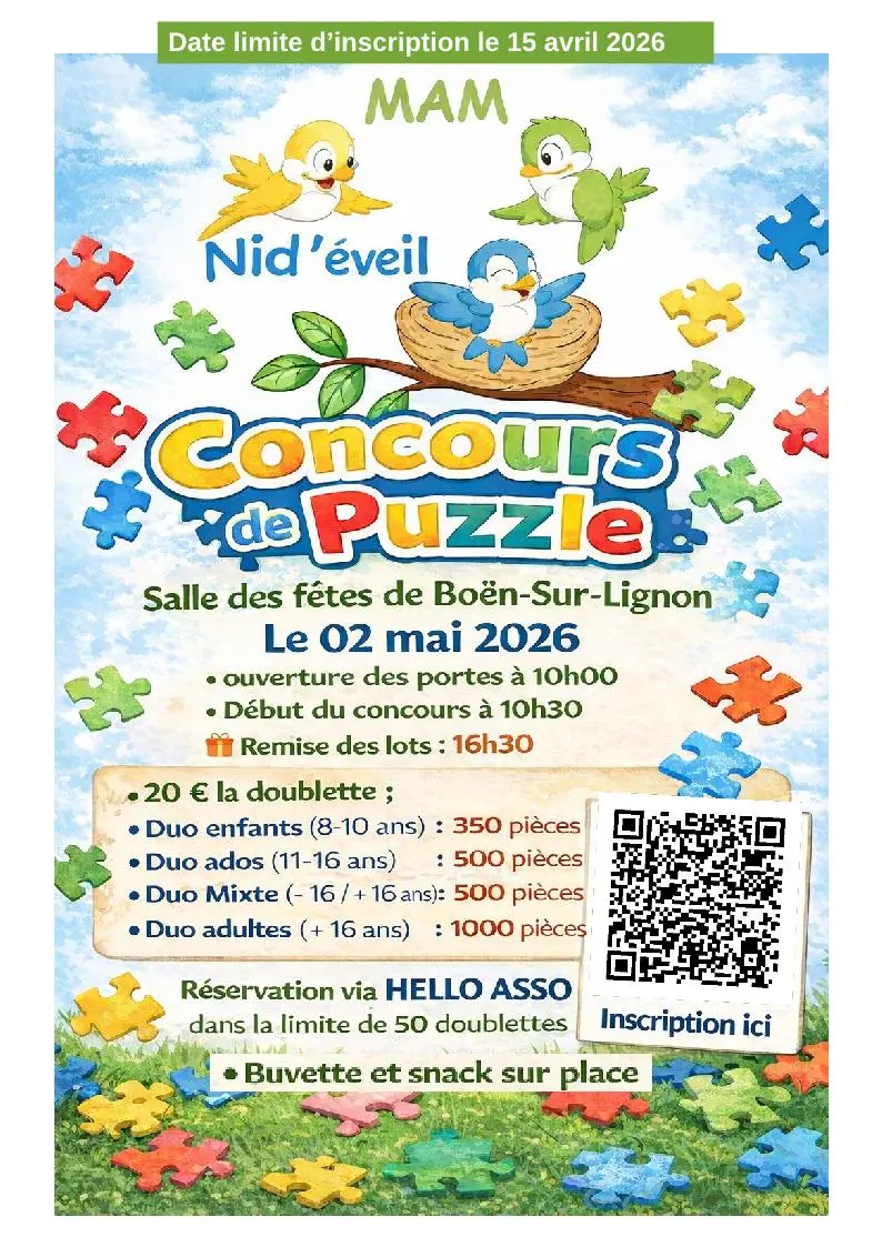 La MAM Nid'éveil organise son premier concours de puzzle ! Le concours se fait uniquement sur réservation et avec paiement à la réservation. Chaque équipe repart avec son puzzle à fin du concours. Date limite d'inscription : 15 avril 2026