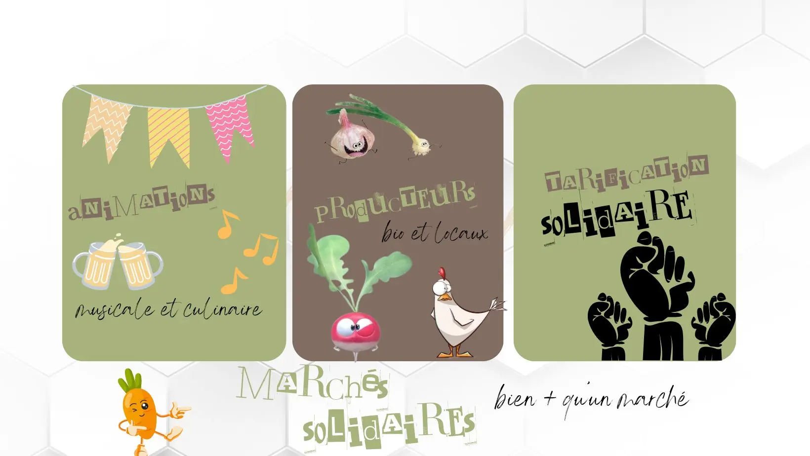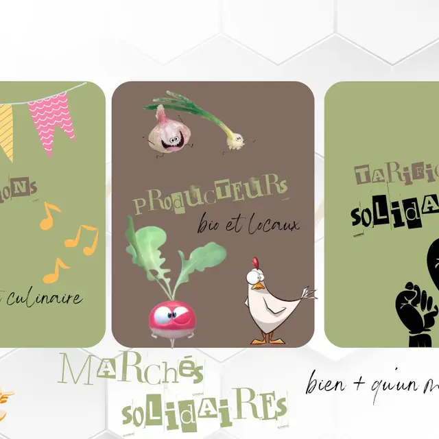 Des producteurs locaux et bio ainsi que des structures locales se sont associés pour proposer des marchés itinérants. Le but est de rendre accessible une alimentation saine et locale et de retrouver la joie de cuisiner. 3 tarifs sont suggérés aux clients : un prix juste, un prix attractif et un prix solidaire pour que chacun puisse avoir accès aux bons produits. Bien plus qu'un marché, c'est aussi un moment convivial proposé avec des animations, de la musique et une buvette !
