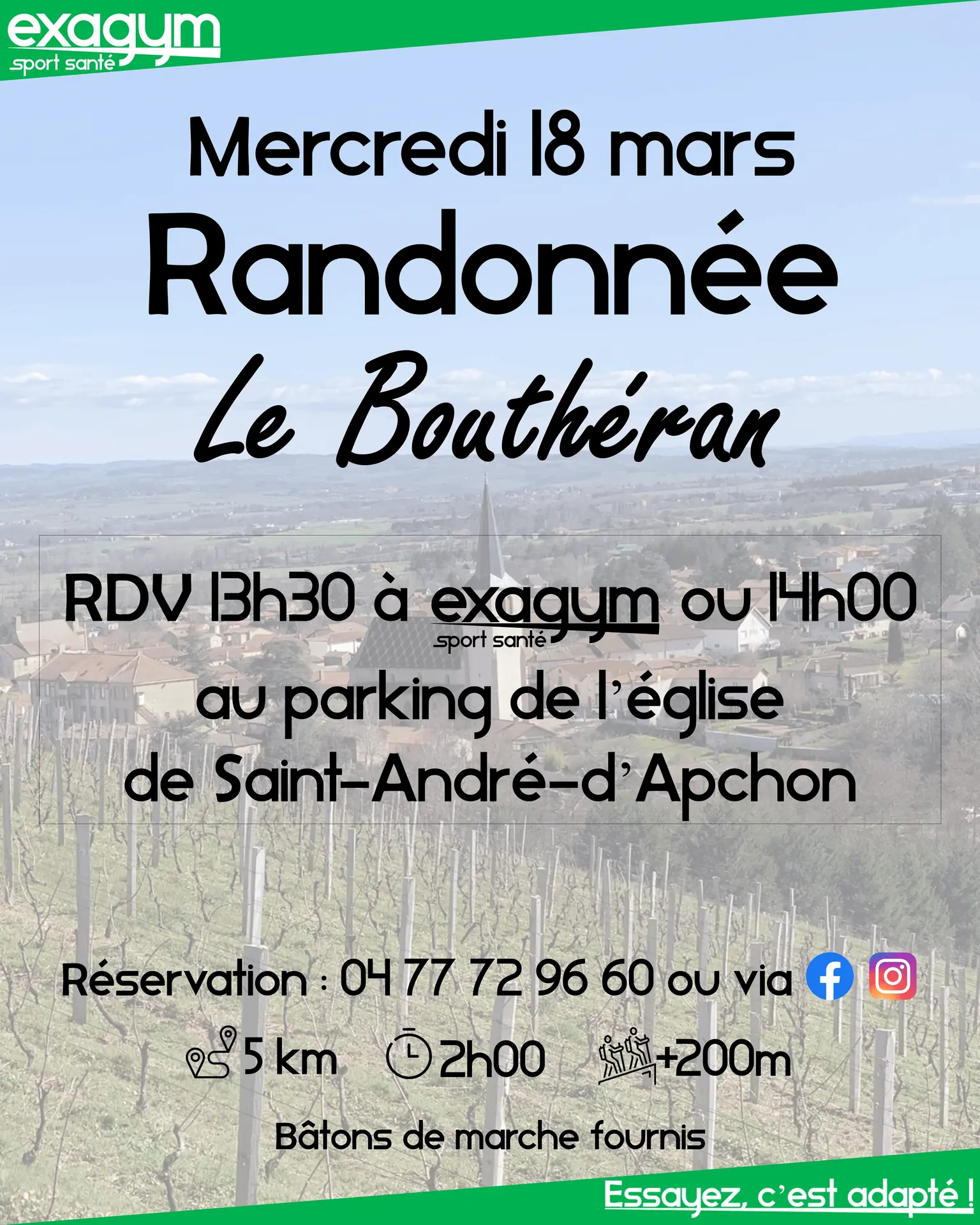 Cette randonnée est organisée par la salle de sport adapté Exagym Sport-Santé. Elle est gratuite pour toutes les personnes souhaitant s'y essayer. Nous organisons ces sorties aux détours des plus beaux sentiers du Roannais un mercredi sur deux. Des bâtons de marche peuvent vous être fournis. Cette randonnée de 5 km compte 200 m de dénivelé positif, environ 50% de chemin pour une durée approximative de 2h00. Nous offrons la possibilité de se donner rendez-vous à 13h30 devant la salle Exagym Sport-Santé, située dans la rue piétonne, au 15 Rue Charles de Gaulle à Roanne, pour un départ groupé en covoiturage.