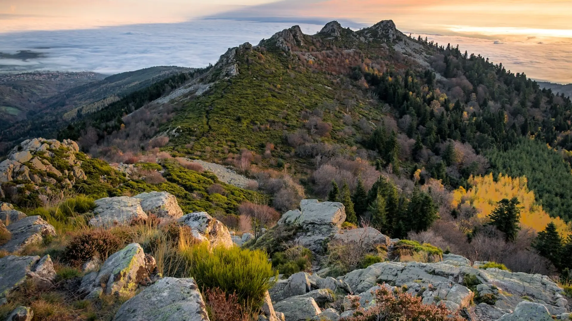 Au cœur du massif, là où les roches métamorphiques et magmatiques se sont élevées il y a des centaines de millions d’années, une échine minérale composée de multiples sommets s’est dessinée du Nord-est au Sud-ouest pour un patrimoine naturel surprenant et unique, à plus de 1000m au-dessus des vallons et plaines, entre la Loire et le Rhône.
