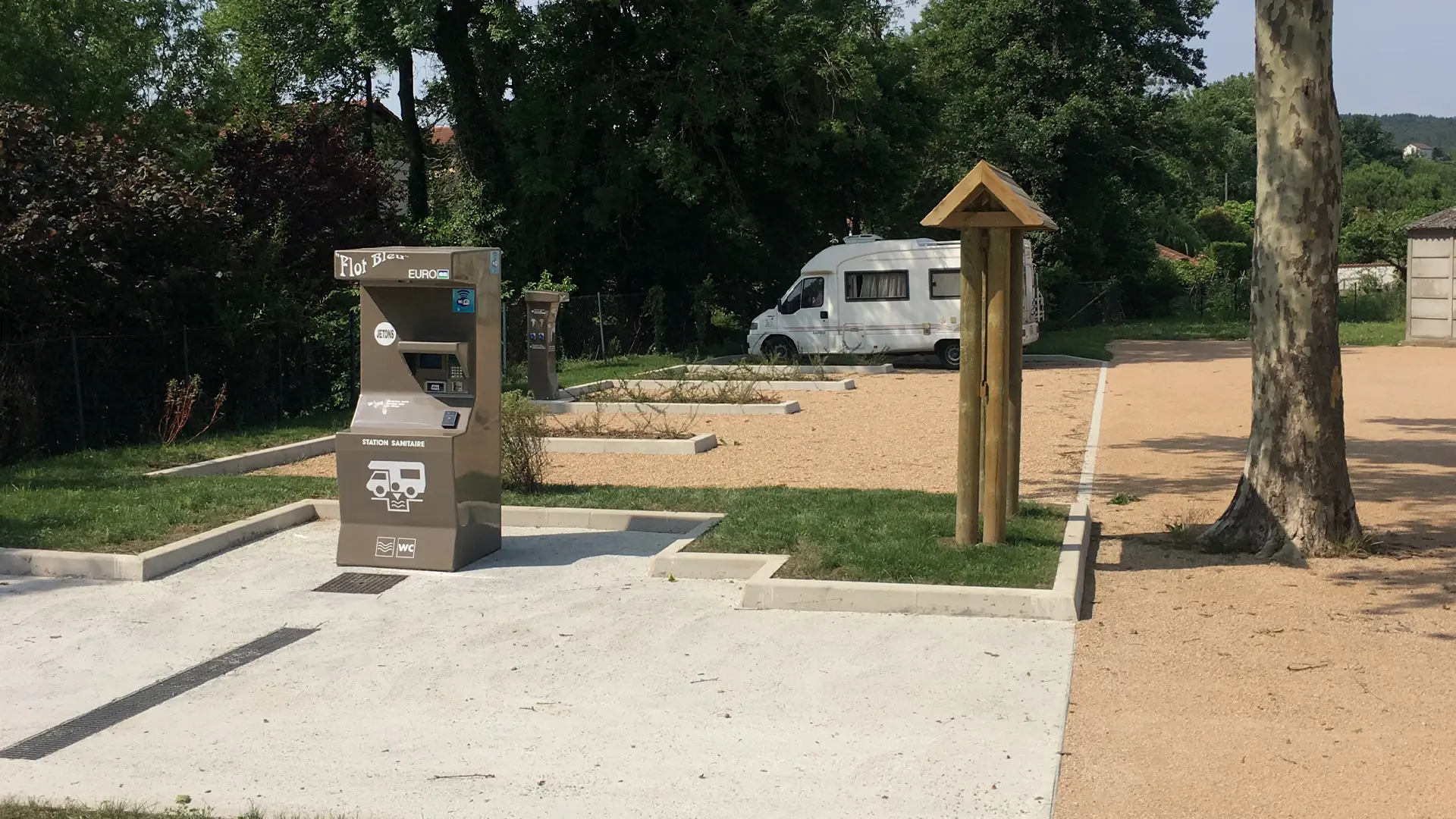 Service- und Parkbereich mit Stellplätzen für 5 Wohnmobile und einer Säule für Wasser, Strom und Entleerung.
