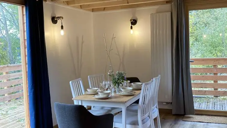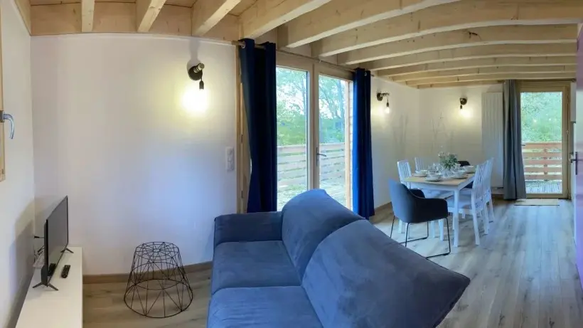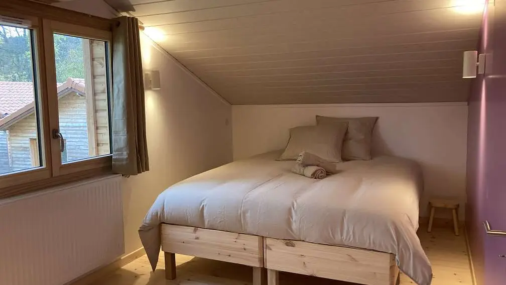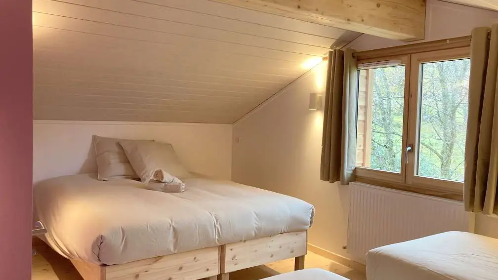 Dachgeschoss-Holzchalet von 43 m², im Erdgeschoss und im ersten Stock. Dies öffnet sich zum hübschen Wohnzimmer, das aus einer integrierten und ausgestatteten Küche besteht, die zum Ess- und Ruhebereich hin offen ist. Sie werden den direkten Zugang zur Terrasse mit Gartenmöbeln zu schätzen wissen, auf der Sie draußen speisen und die umliegende Natur genießen können. Auf dieser Ebene sind das Badezimmer (italienische Dusche und Waschbecken) und ein separates WC eingerichtet. Das komplette Dachgeschoss besteht aus zwei hübschen Schlafzimmern, der Raum ist funktional und die sehr bequeme Bettenart flexibel: ein Doppelzimmer mit 1 Doppelbett 160x200 oder 2 Einzelbetten 80x200 und ein Vierbettzimmer mit 2 Doppelbetten 160x200 oder 4 Einzelbetten 80x200 nach Ihren Wünschen. Auf Anfrage: gemeinsamer Waschraum mit den Eigentümern. Um Ihren Aufenthalt noch angenehmer zu gestalten, sind Nebenkosten und Heizung im Preis inbegriffen, die Betten sind bei Ihrer Ankunft bezogen und Handtücher werden Diese authentische Hütte auf Stelzen befindet sich an einem privilegierten Ort inmitten der Natur, ideal zum Entspannen und Auftanken. Top-Lage für Natur- und Sportliebhaber, in der Nähe: zahlreiche Wanderwege, Radwege, Bockwege, im Winter sogar Schneeschuhwanderungen oder Langlauf! Bei der völlig neuen Unterkunft handelt es sich um ein komfortabel eingerichtetes und ausgestattetes Holzchalet. Sie werden die wunderschönen, gemeinschaftlich genutzten Außenbereiche des ca. 1000 m² großen Anwesens genießen: einen Garten mit Bäumen und Blumen, ein Permakultur-Labyrinth, Spiele für Kinder (Trampolin, Rutsche usw.) und eine hübsche, intime und private Terrasse von 20 m². Der Zugang zum Wellnessbereich, einem echten nordischen Bad und einer kosmischen Sauna, ist unabhängig und nicht im Preis der Unterkunft inbegriffen. Um Zugang zu erhalten, abonnieren Sie bitte das Zusatzpaket von 25 €/h pro Person.