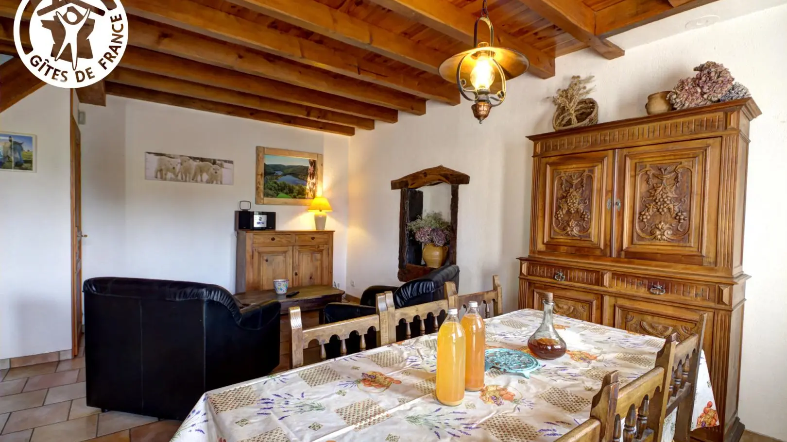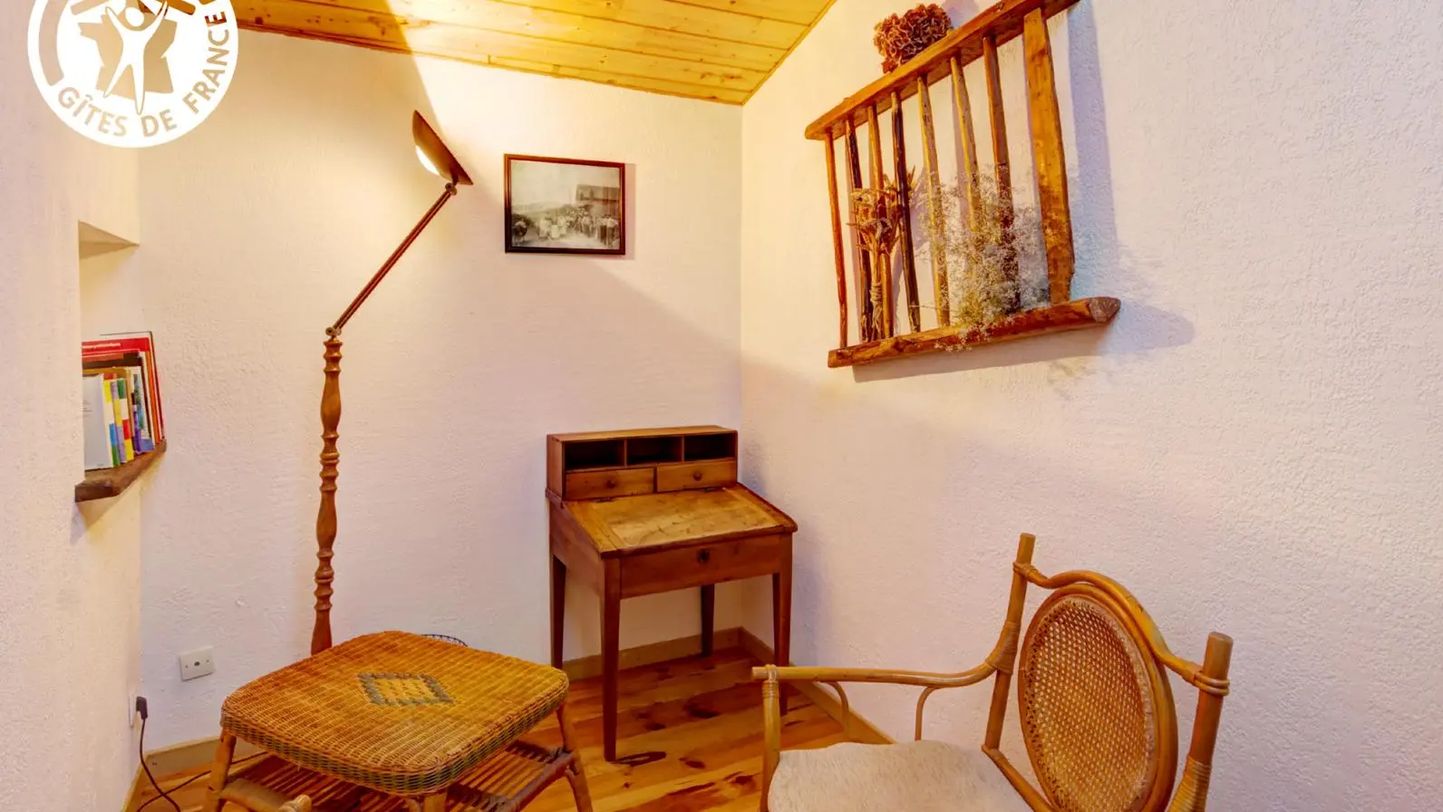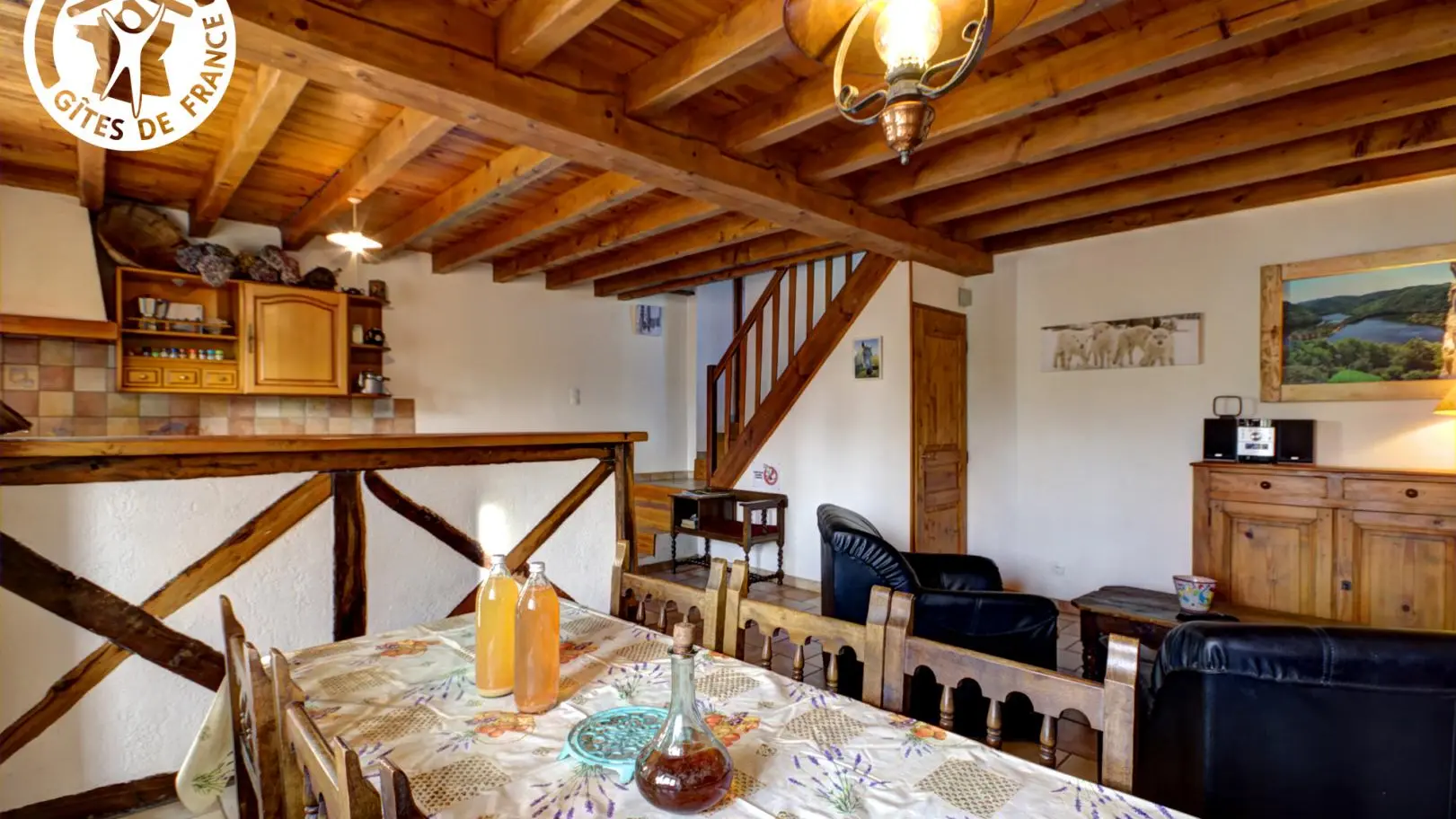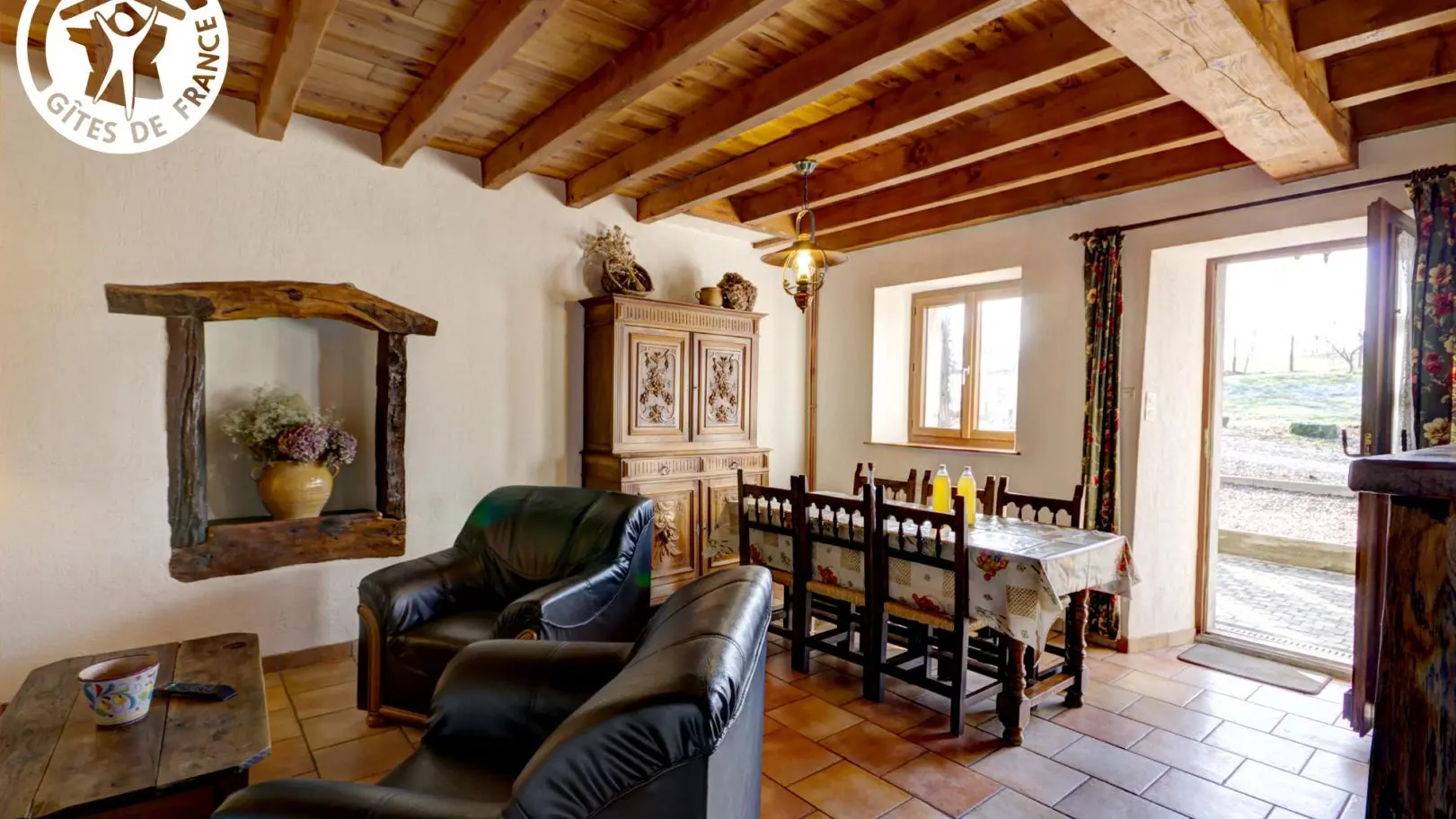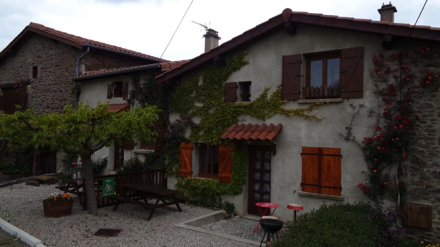 Gîte (80 m²) auf einer Etage, Wohnzimmer mit Sitzecke und Küchenzeile, 2 Schlafzimmer, Entspannungsecke im Zwischengeschoss. Die Einrichtung ist antik mit viel Holz. Zentralheizung. Privates Grundstück, Parkplatz. In der Nähe von St Jean Bonnefond und Sorbiers.