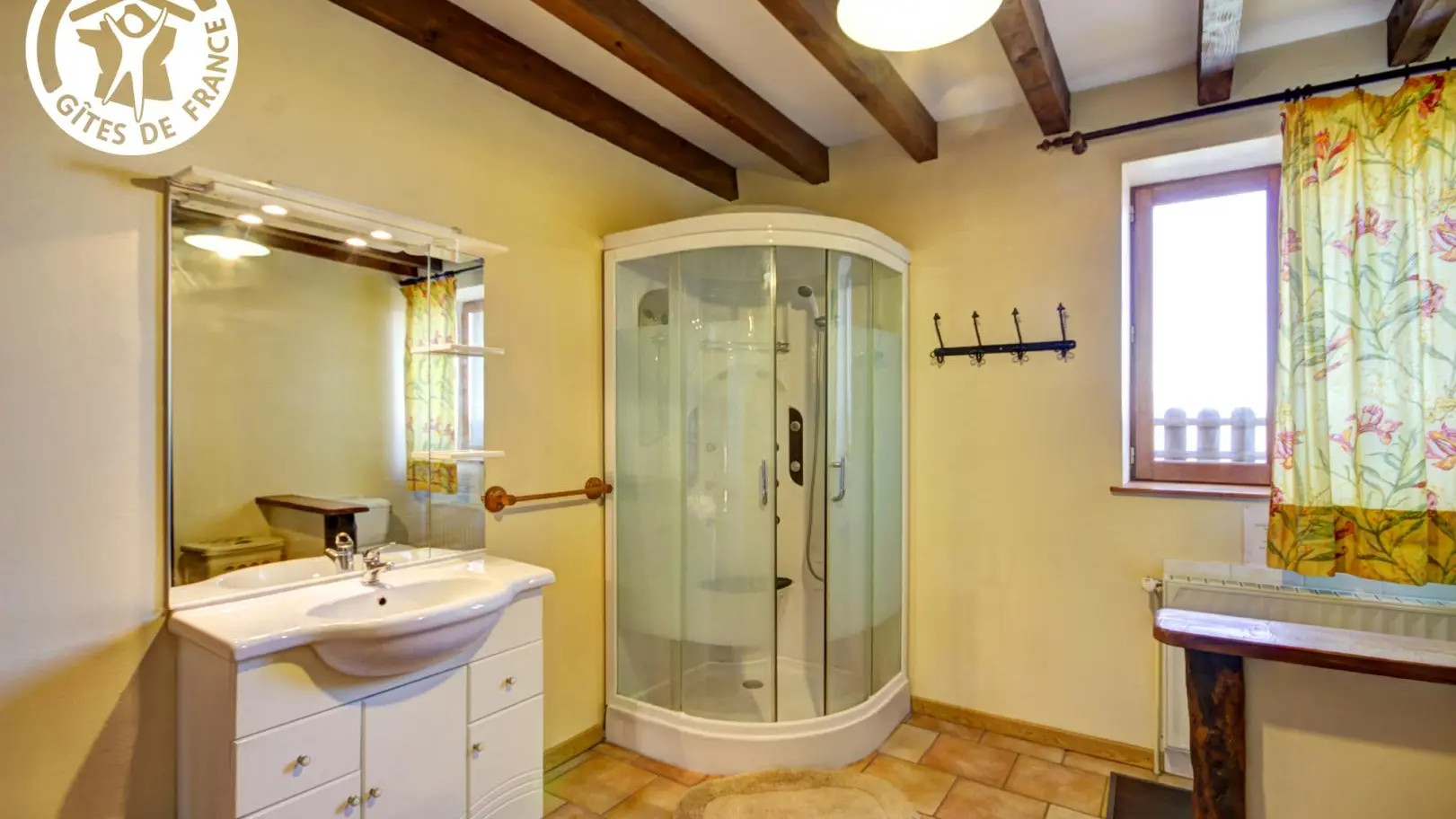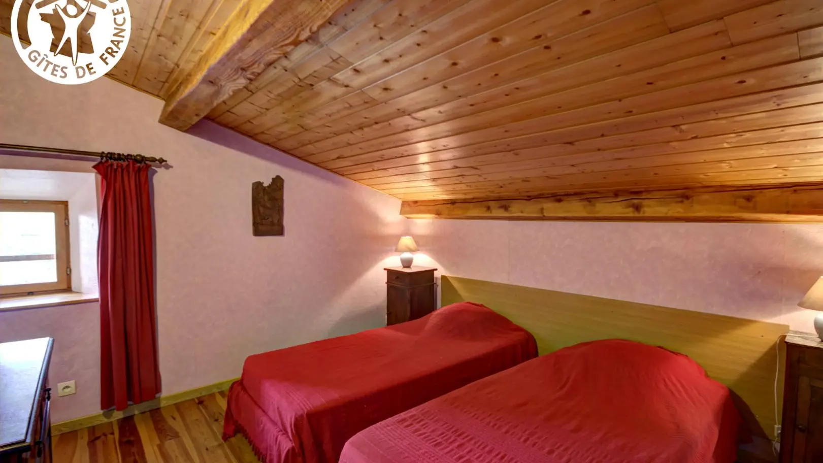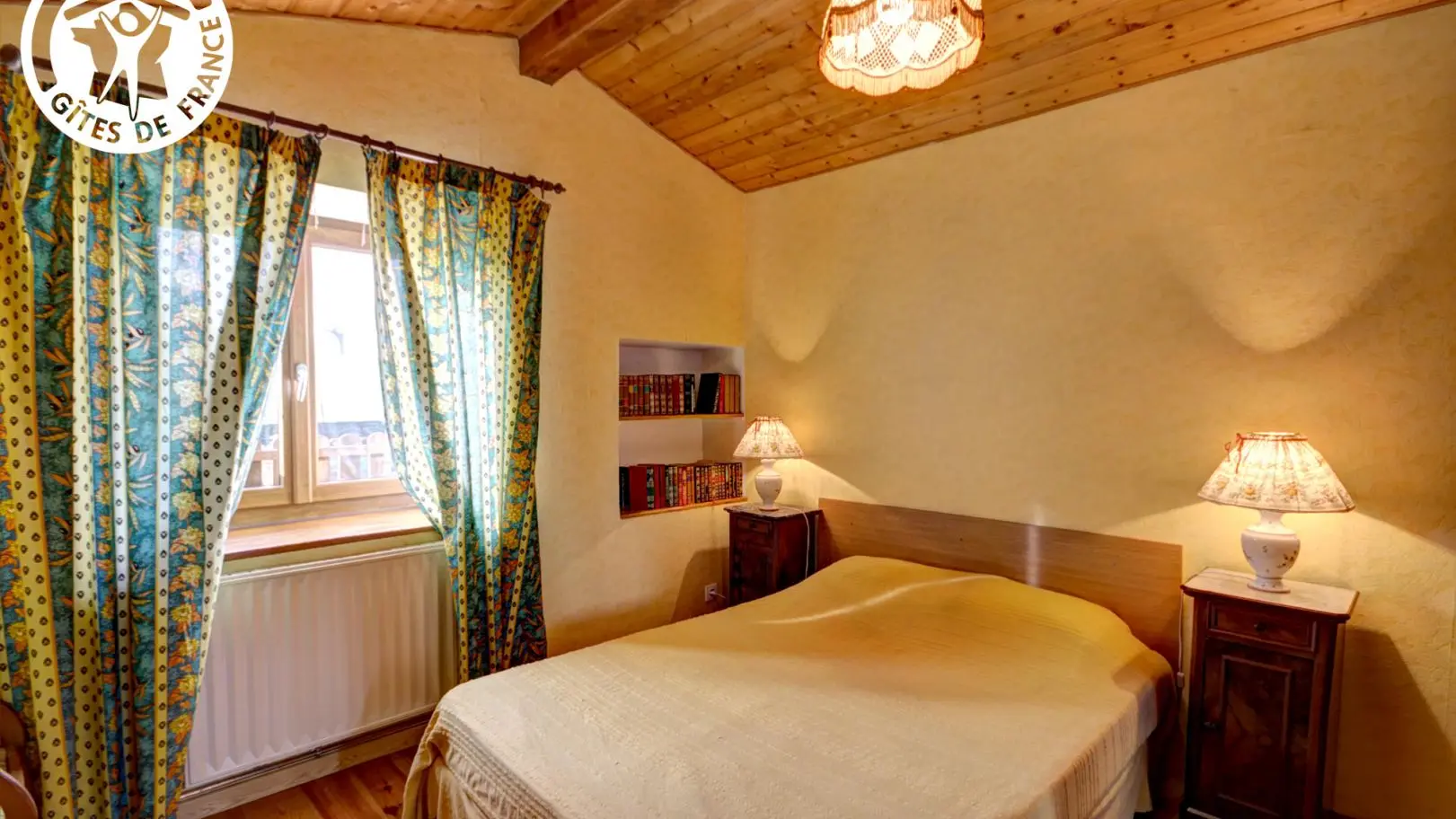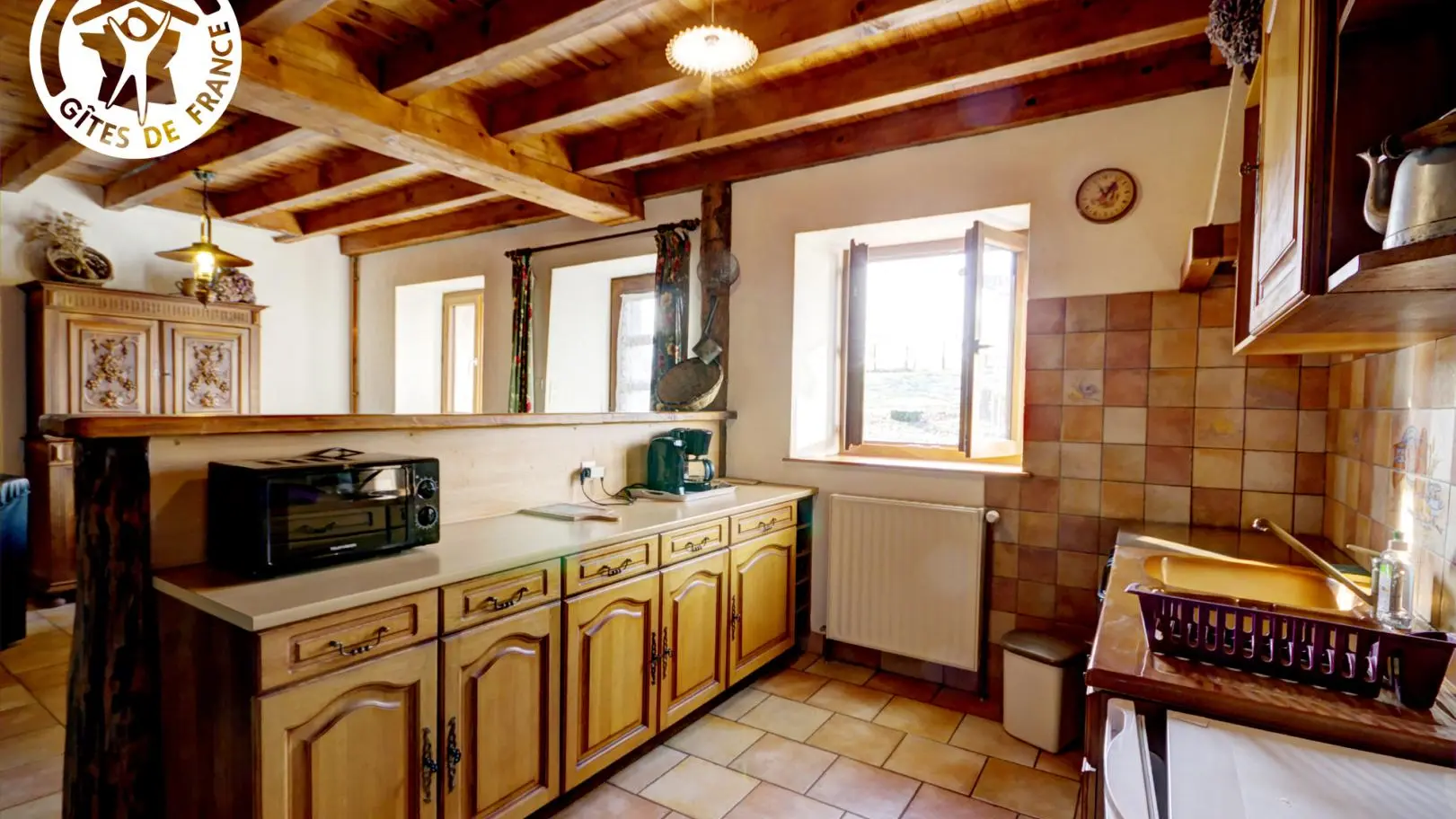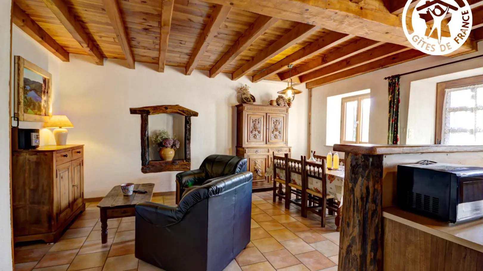Gîte (80 m²) auf einer Etage, Wohnzimmer mit Sitzecke und Küchenzeile, 2 Schlafzimmer, Entspannungsecke im Zwischengeschoss. Die Einrichtung ist antik mit viel Holz. Zentralheizung. Privates Grundstück, Parkplatz. In der Nähe von St Jean Bonnefond und Sorbiers.