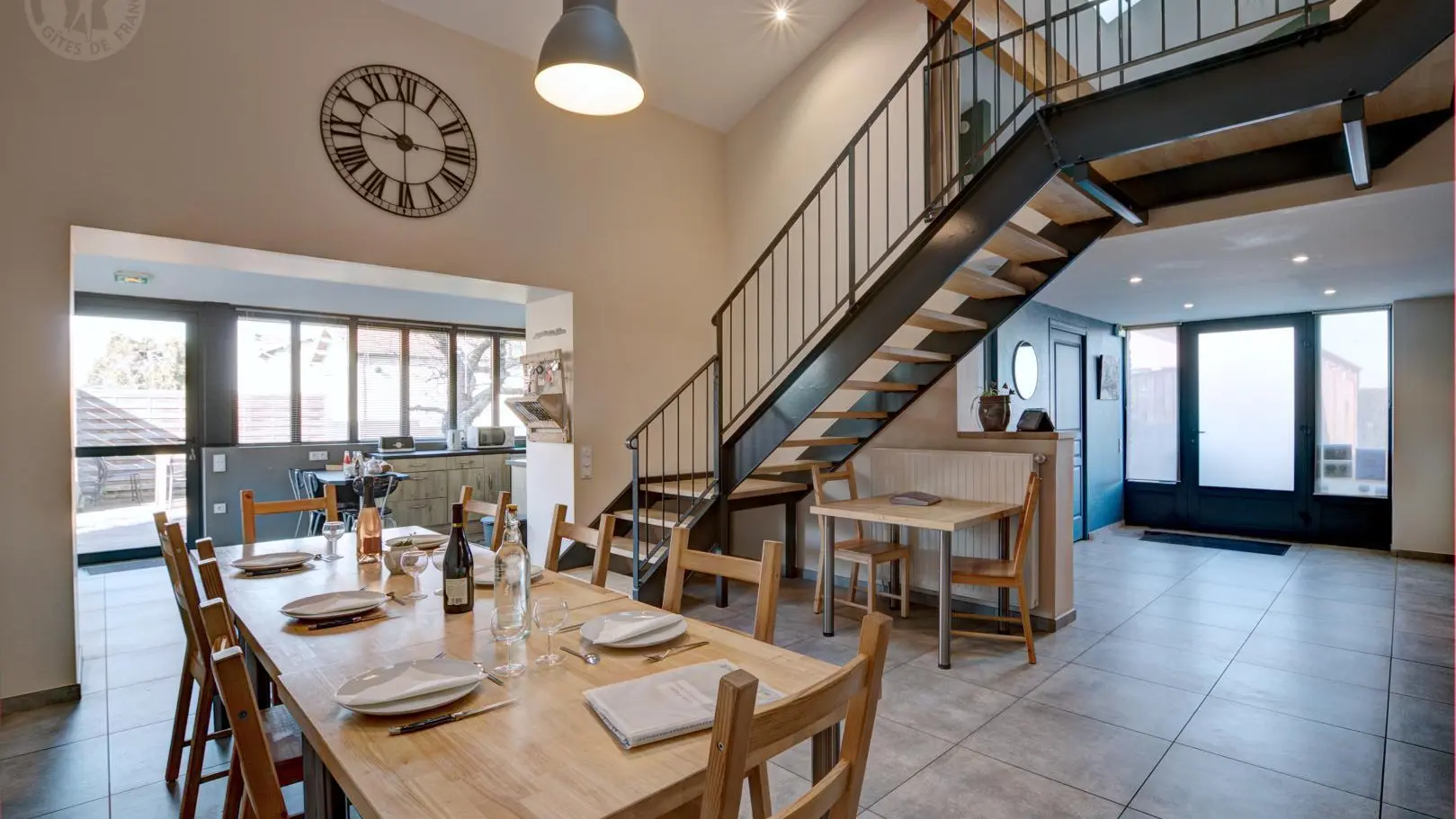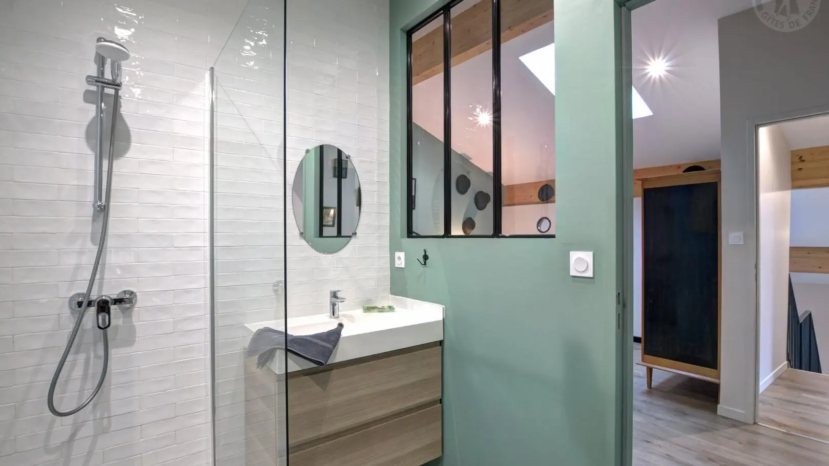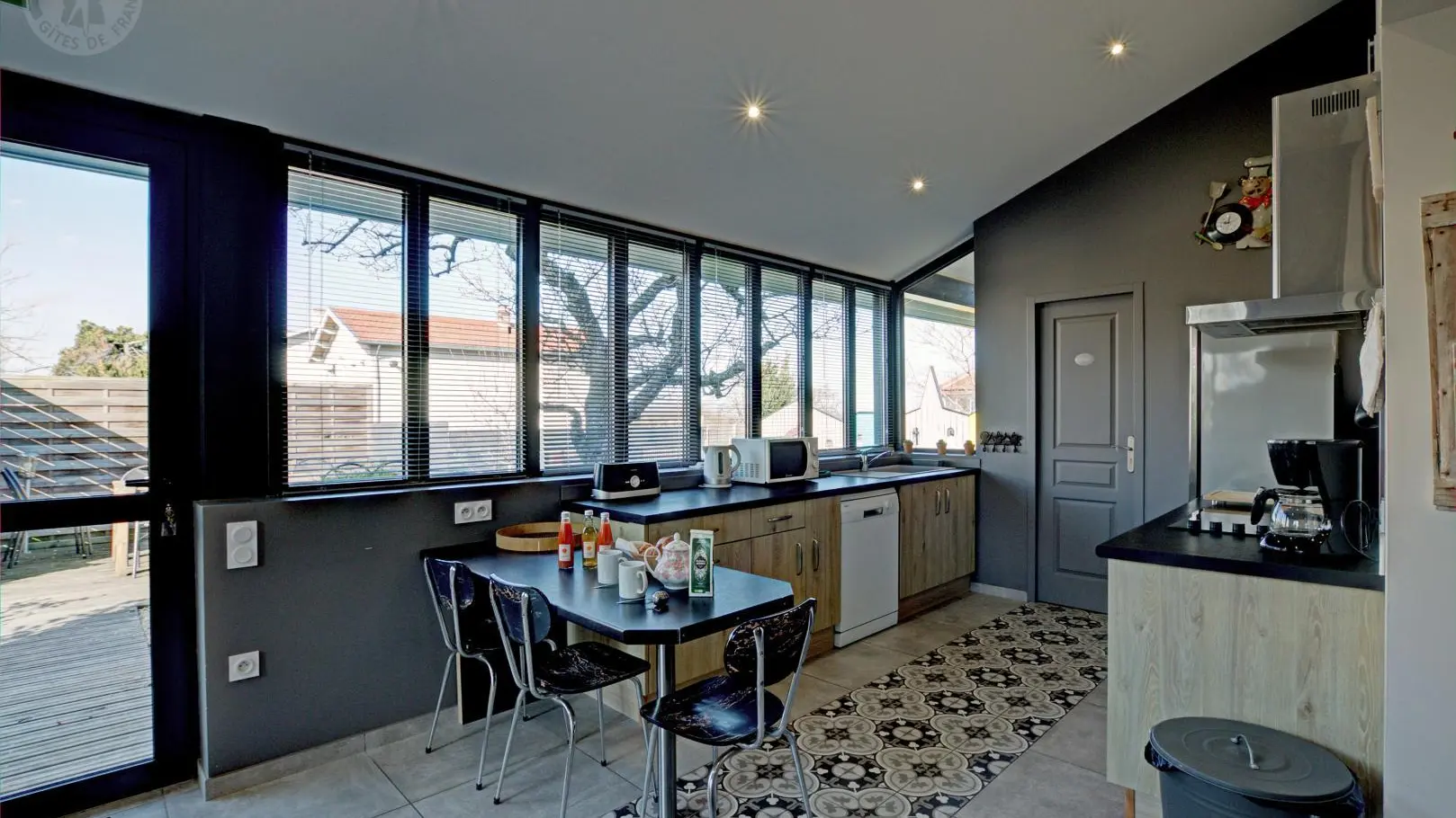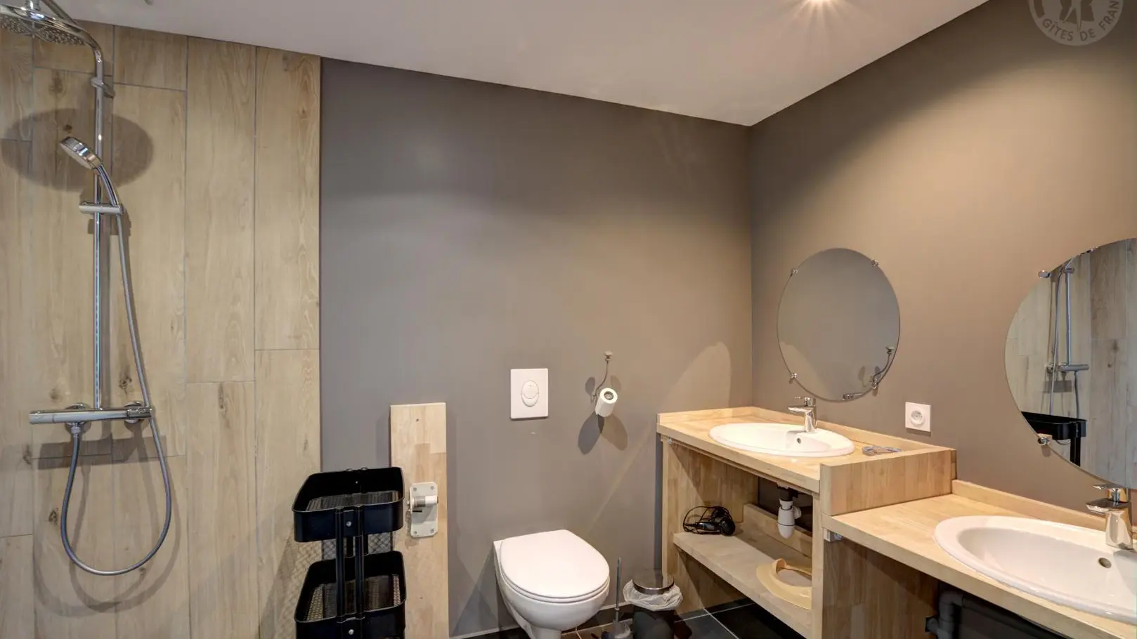 Cottage von 200 m² im Erdgeschoss + Obergeschoss mit einem 73 m² großen Wohnzimmer mit offener und heller Küche dank seines Glasdachs mit Blick auf den Garten. Im Erdgeschoss befinden sich auch ein Schlafzimmer und ein komplettes Badezimmer, das für Personen mit eingeschränkter Mobilität zugänglich ist, sowie ein Waschraum. Im Obergeschoss befinden sich zwei Schlafzimmer mit eigenem Duschbad und WC sowie ein zum Wohnzimmer hin offenes Zwischengeschoss mit zwei Einzelbetten.