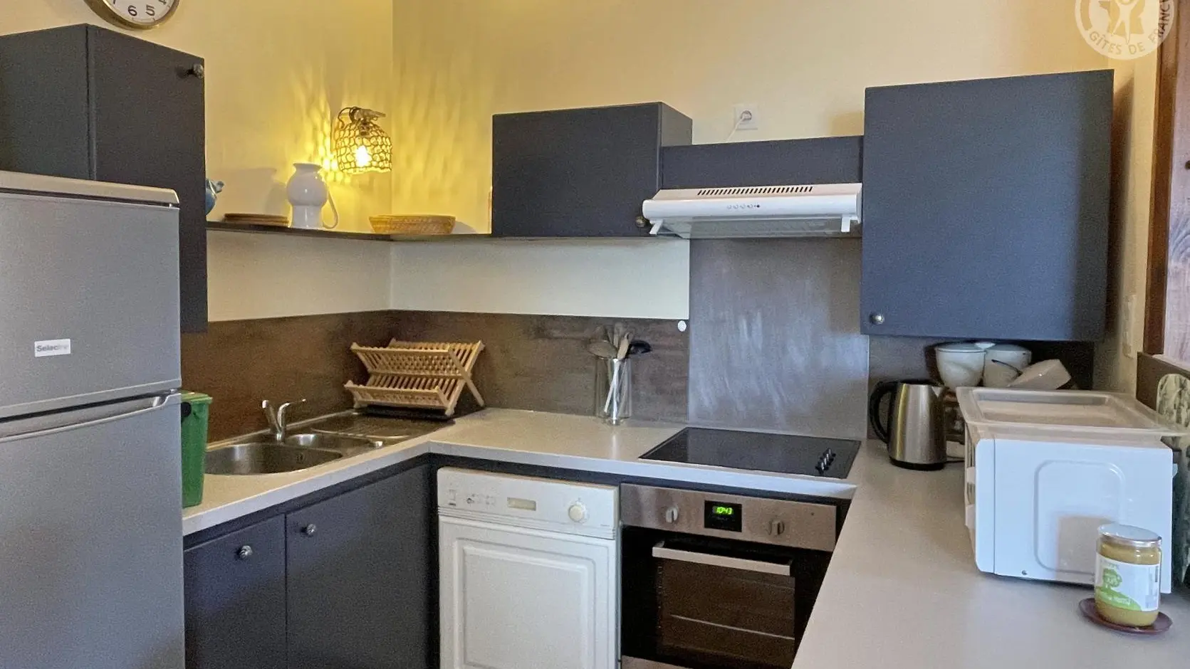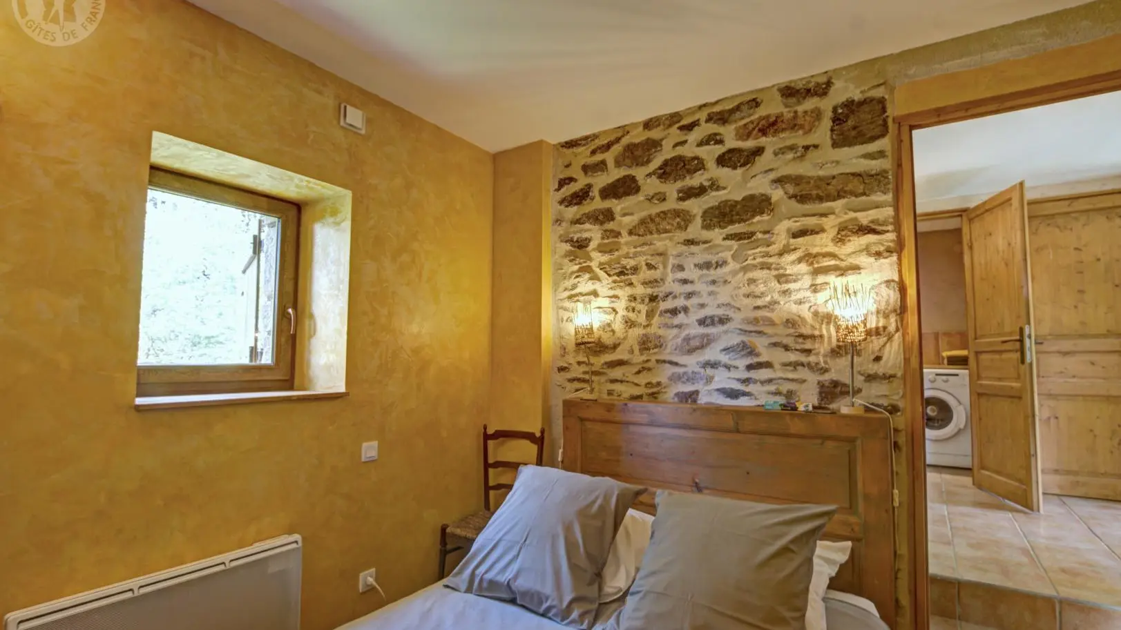 Ferienhaus von 90 m². Auf der 1. Ebene 2 Schlafzimmer: 1 mit einem Doppelbett in 140, das andere mit 2 Einzelbetten in 90. Ein Bürobereich mit einem zusätzlichen Bett in 90, Bad und WC. 2. Ebene: Küche offen zum Wohnzimmer mit Pelletofen. Der Zugang erfolgt über einen asphaltierten Weg für 500 m. Zusätzliche Kosten. Bettwäsche und Handtücher mieten möglich.