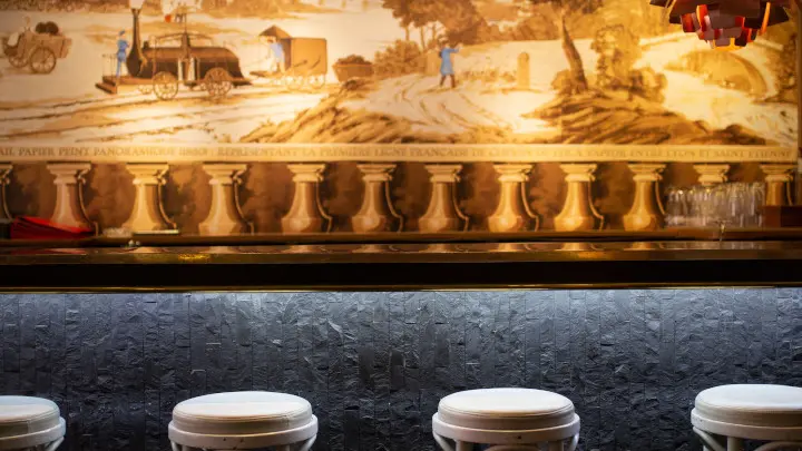 Schieferboden, Wand aus Echtholz, Wandleuchten und Hängeleuchten aus dem 19. Jh. aus Messing und vor allem Dekorpapier der Linie Saint-Etienne / Lyon einerseits.