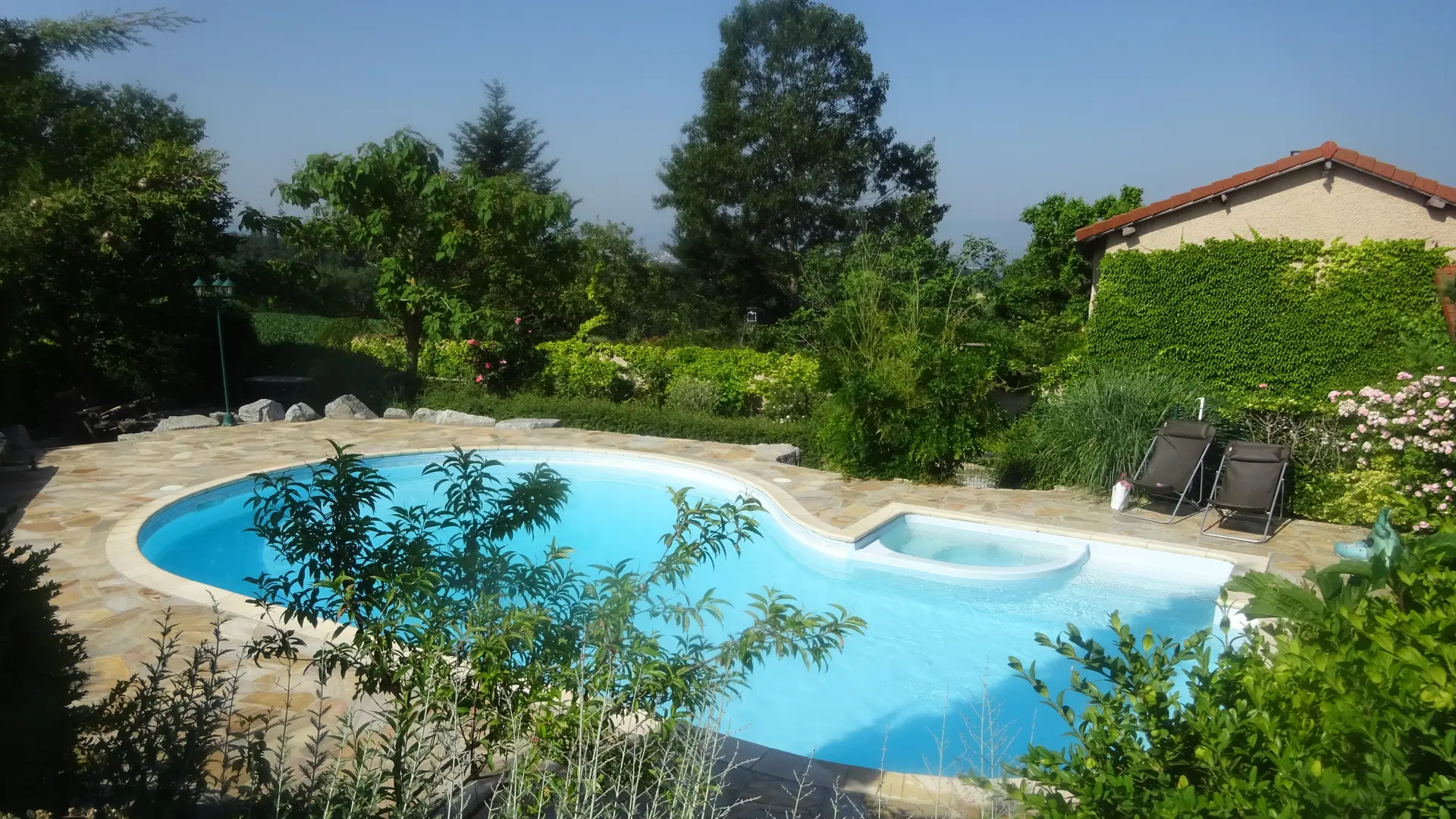 Cottage faces south and west, with a beautiful view of the nearby hills of the Monts du Lyonnais and the Monts du Forez on the horizon. A large living room opens onto a large terrace above an orchard.