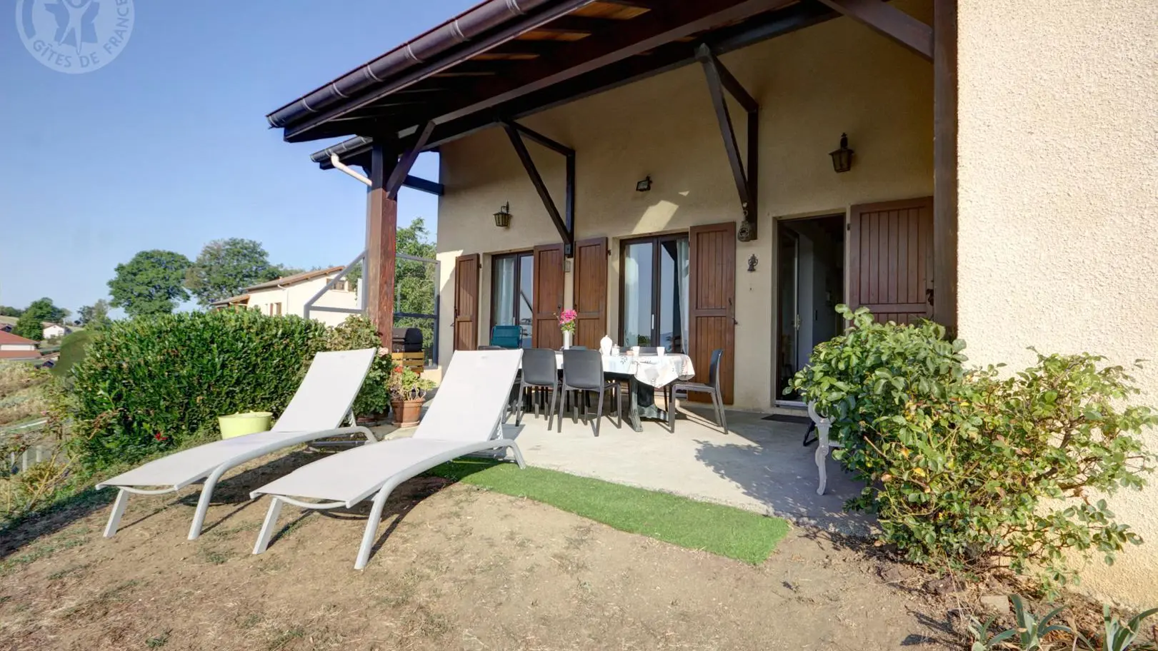 Hélène & Maurice welcomes you to their old villa transformed into a gîte. This independent house has a beautiful garden with trees and flowers of almost 1000m². You will benefit from a covered and sheltered terrace, facing due South, of more than 30m² with landscape view. To make your stay even more comfortable, the beds are made on arrival and the lanyard is provided.