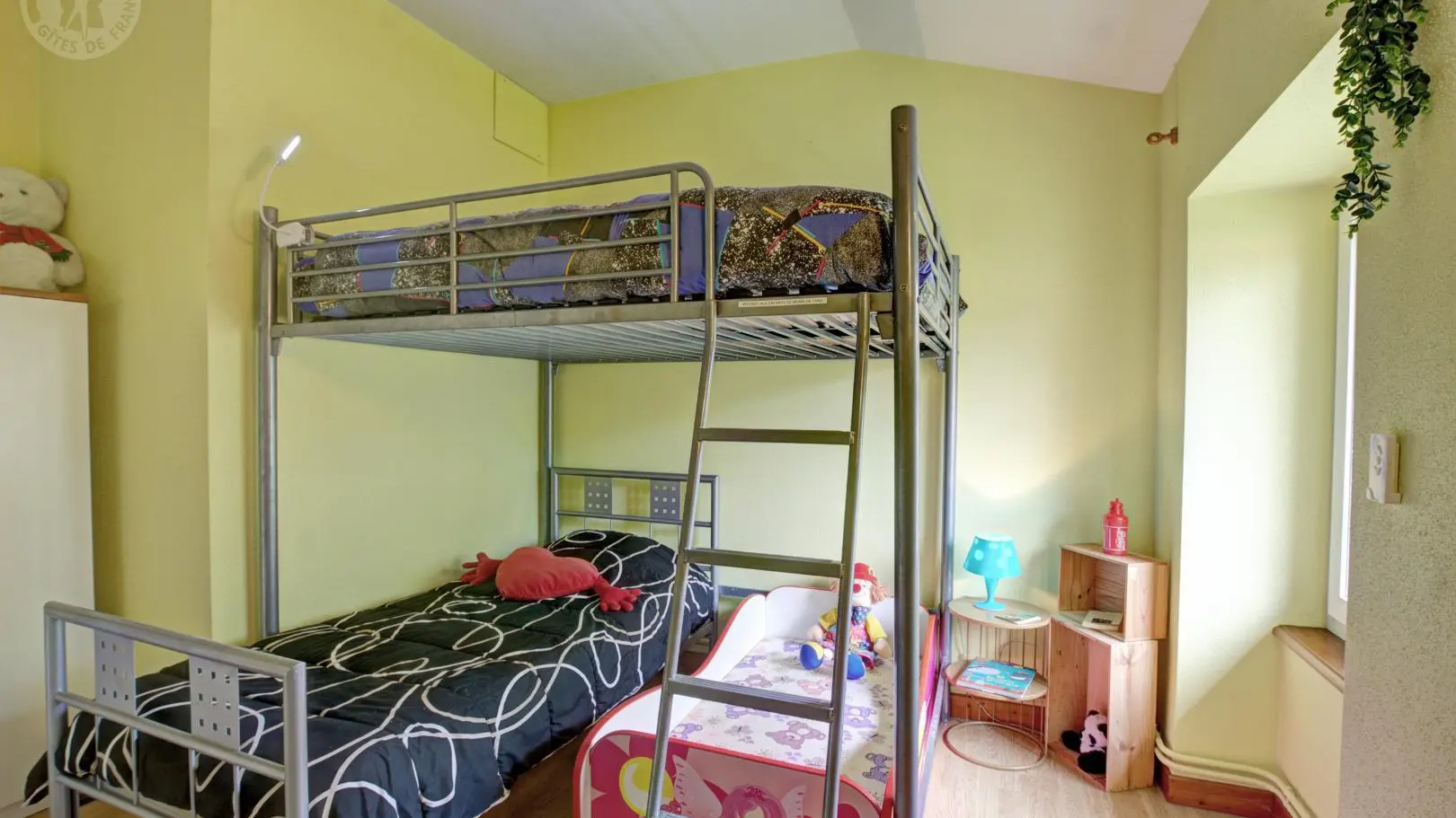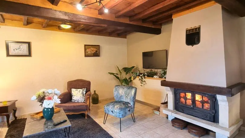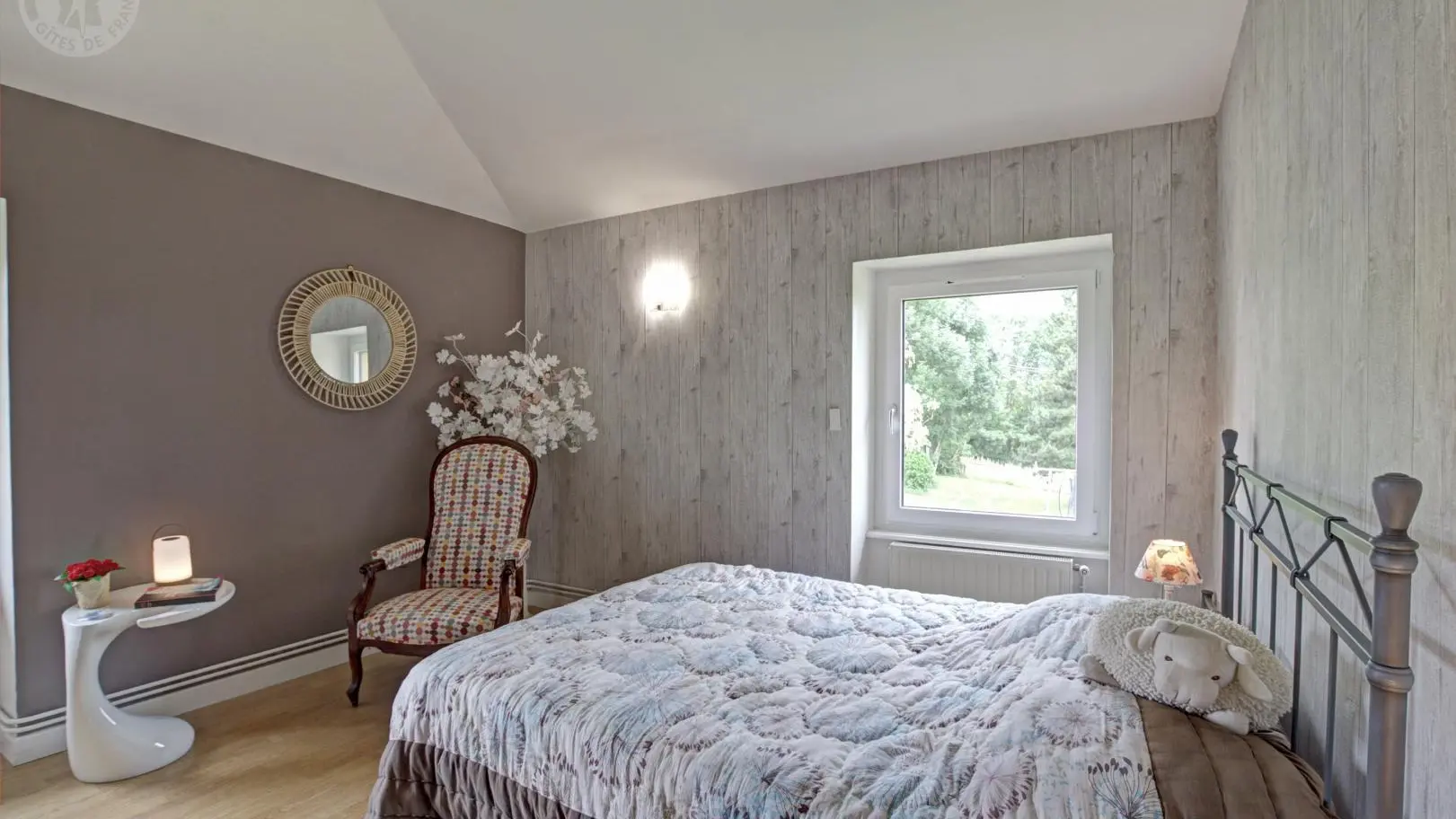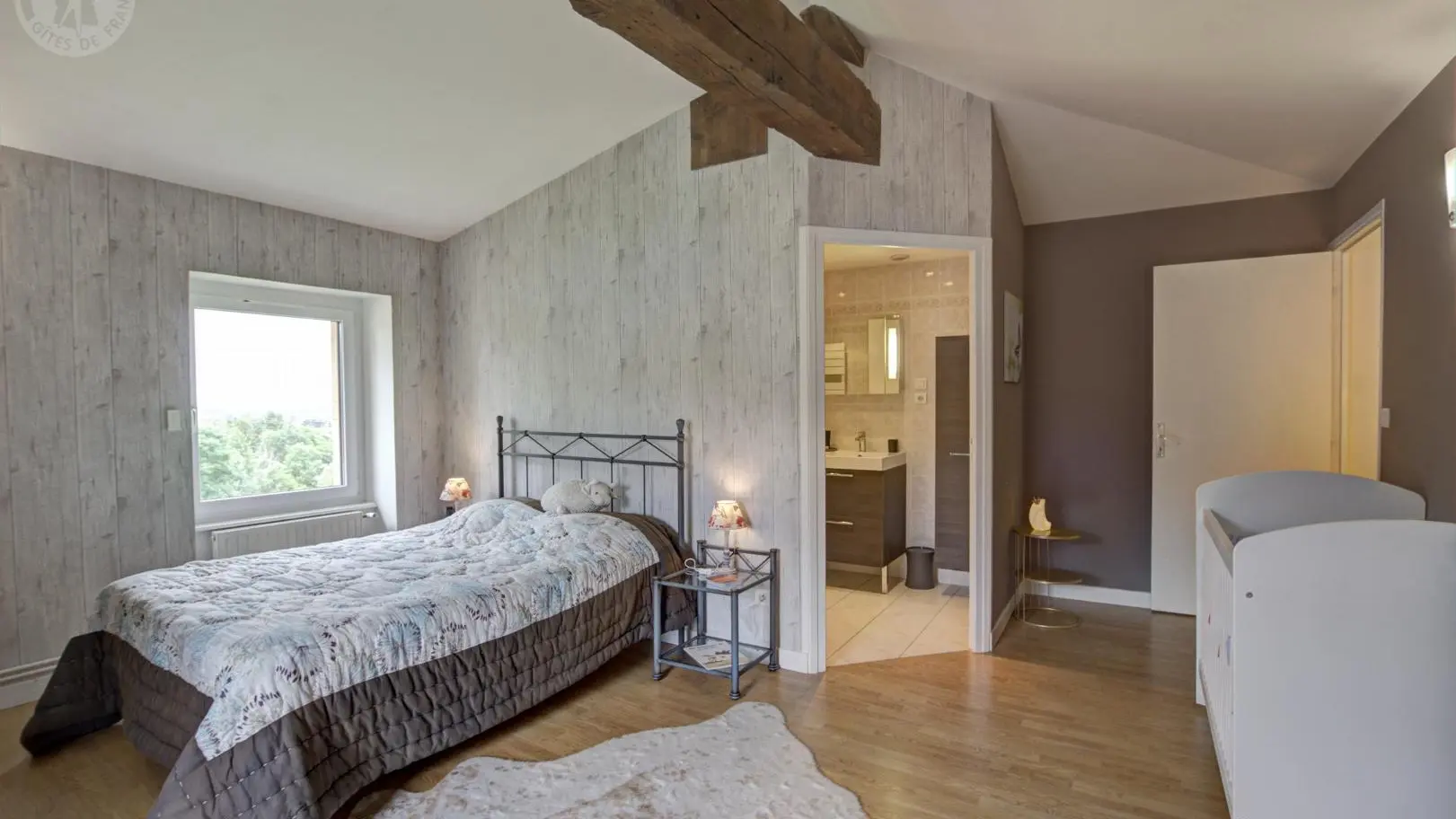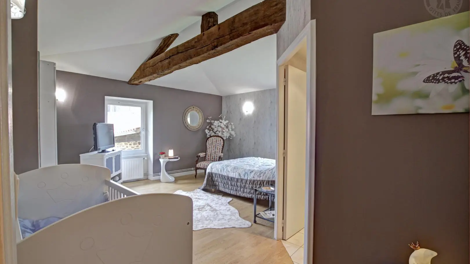 Gîte adjoining the owners' house of 140m² on the ground floor + upper floor. On the ground floor, you enter the integrated and equipped kitchen with dining room. The living room has a wood fireplace for a cozy and rustic atmosphere. On this level there are: a laundry room and a bathroom with WC. Upstairs, we find the 3 bedrooms. A master bedroom with a 140 bed & a baby bed and a private bathroom / a bedroom with a 140 bed and a child's bed / a bedroom with a 90 bed and a 140 high bed. On this level, there is a separate toilet and a bathroom (balneotherapy shower).