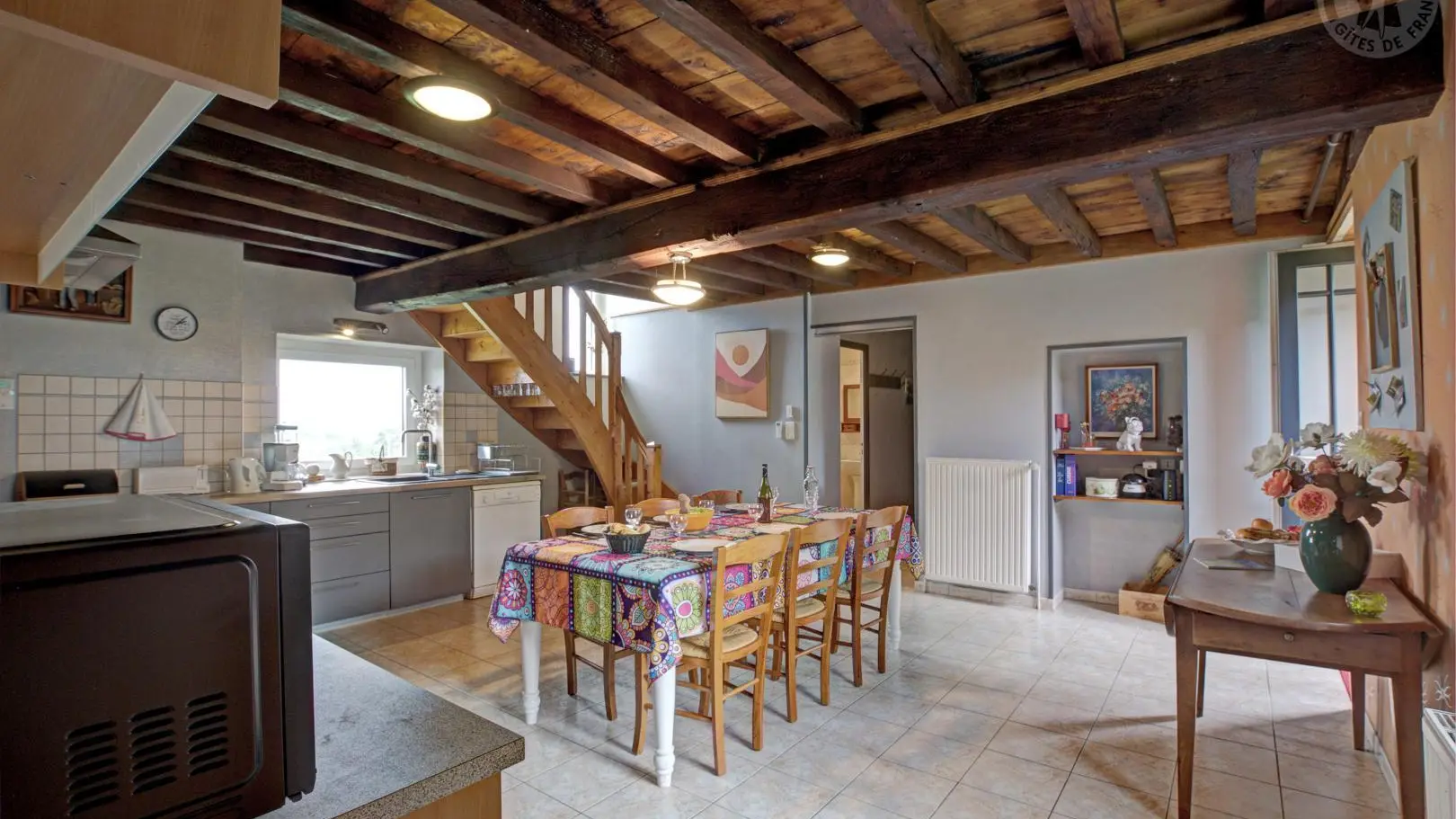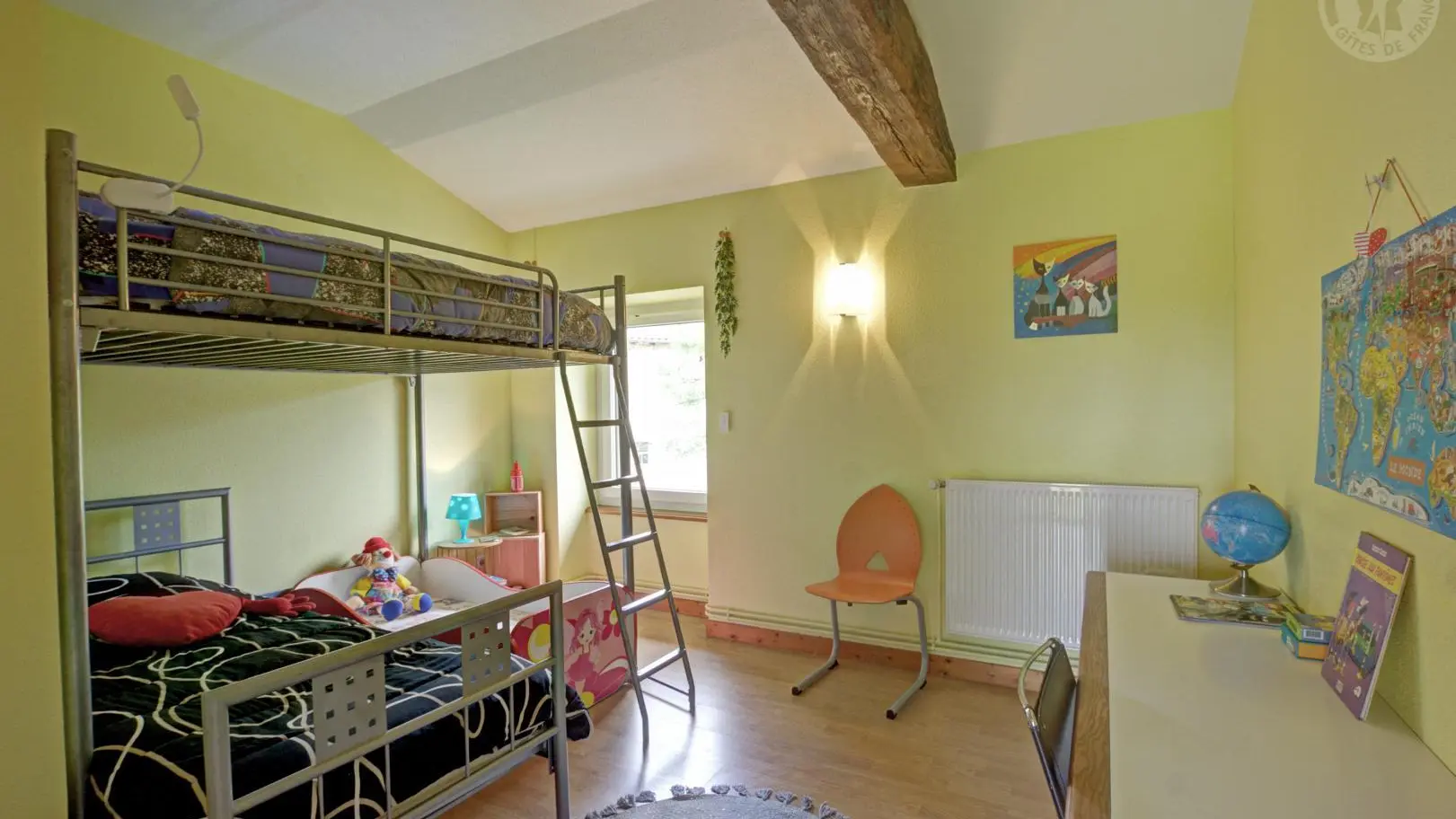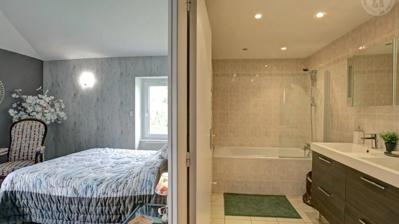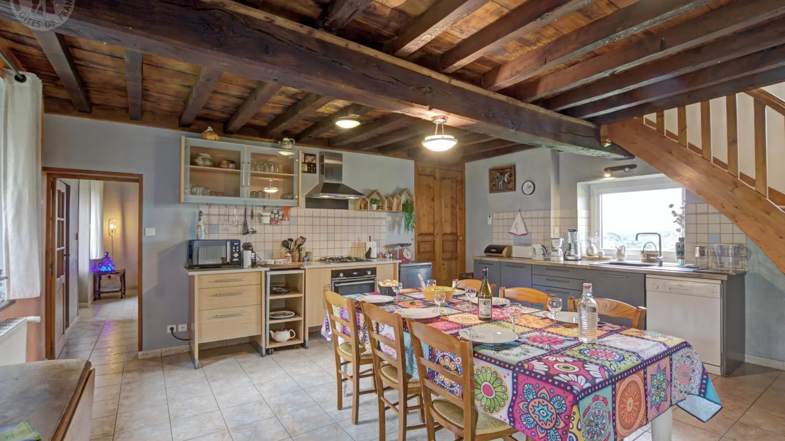 Gîte adjoining the owners' house of 140m² on the ground floor + upper floor. On the ground floor, you enter the integrated and equipped kitchen with dining room. The living room has a wood fireplace for a cozy and rustic atmosphere. On this level there are: a laundry room and a bathroom with WC. Upstairs, we find the 3 bedrooms. A master bedroom with a 140 bed & a baby bed and a private bathroom / a bedroom with a 140 bed and a child's bed / a bedroom with a 90 bed and a 140 high bed. On this level, there is a separate toilet and a bathroom (balneotherapy shower).