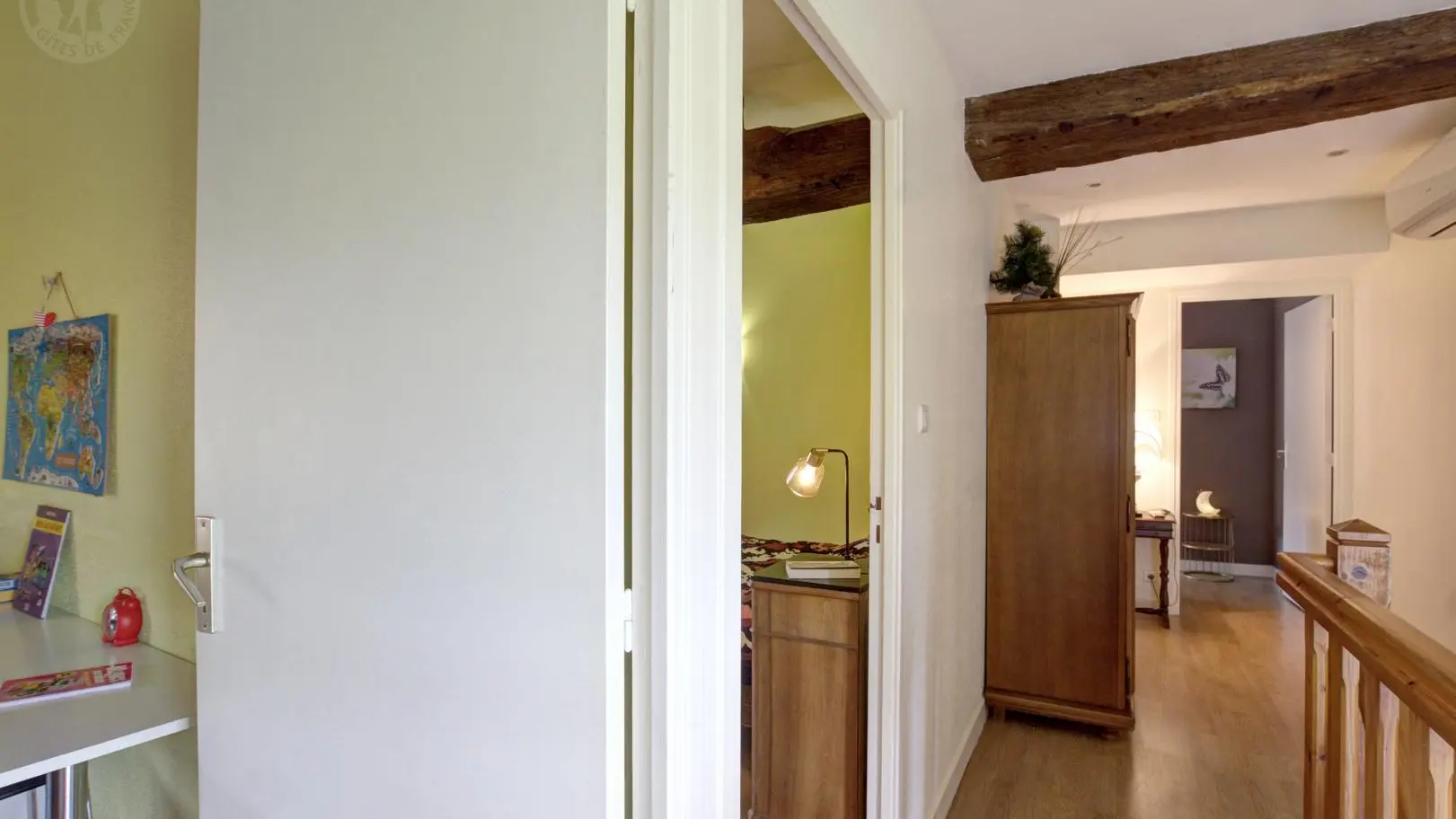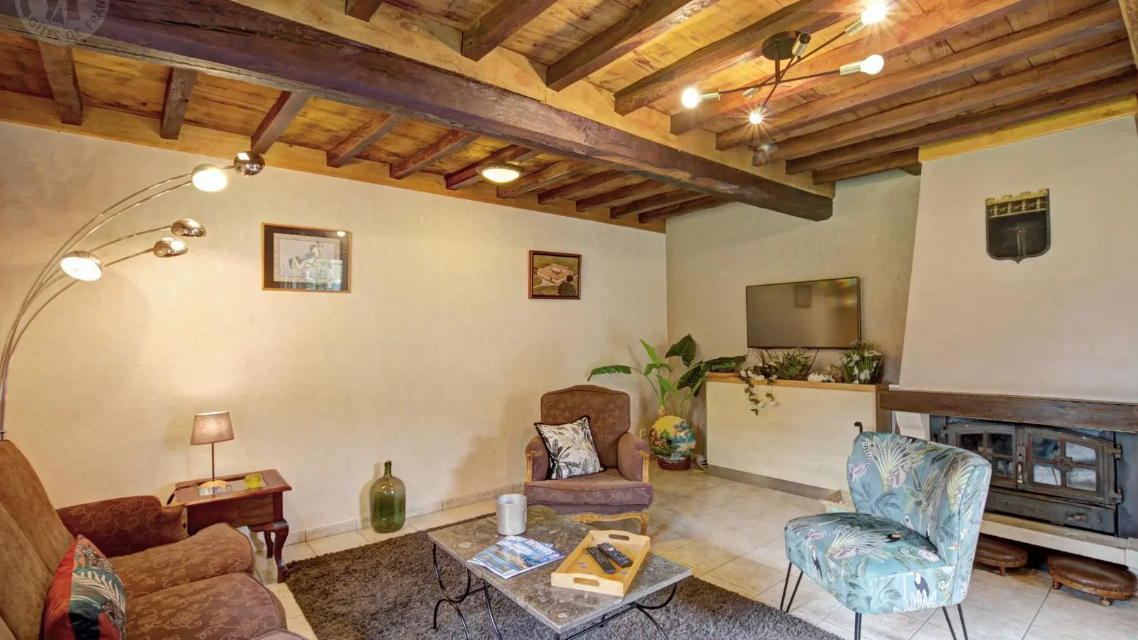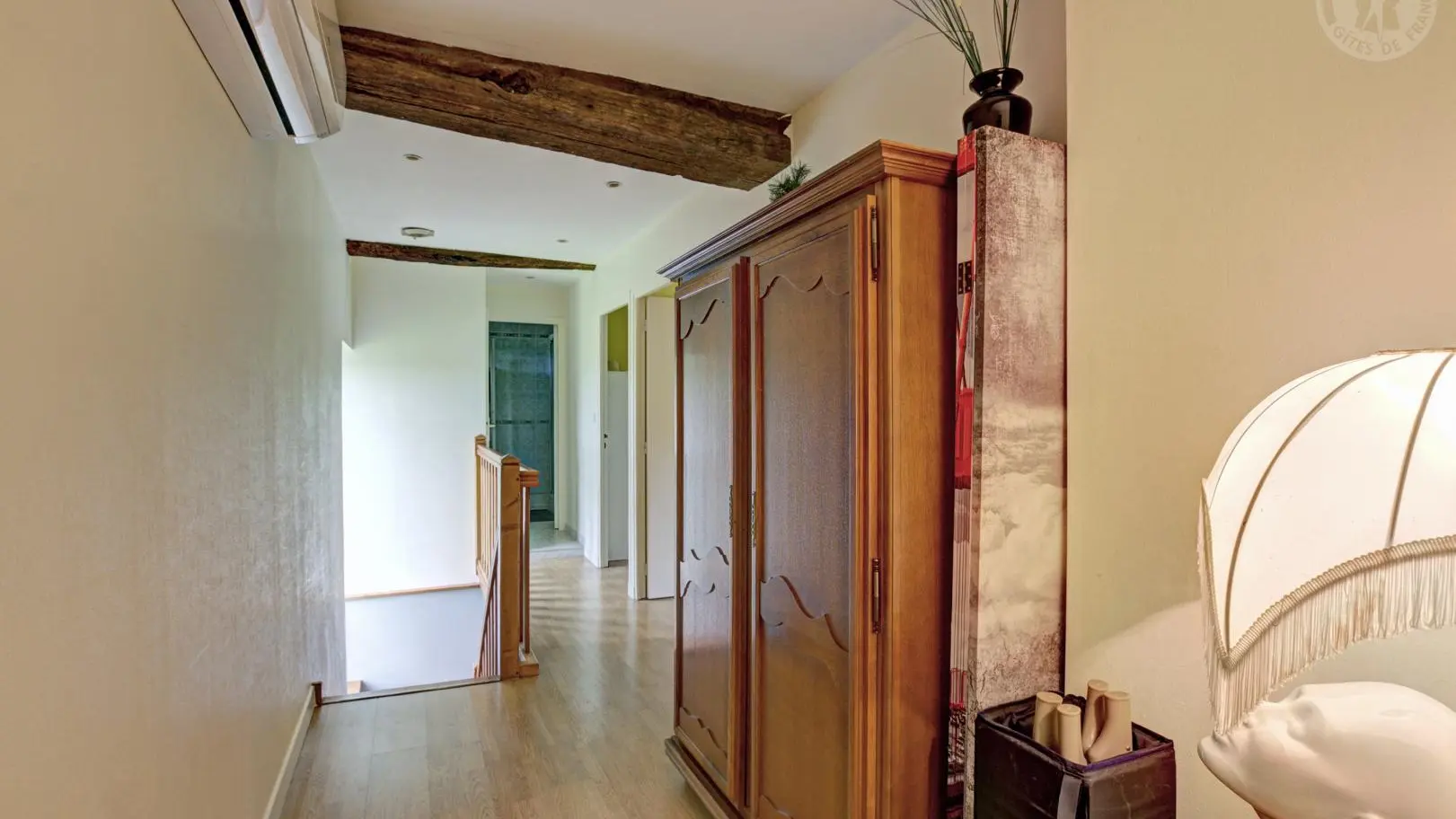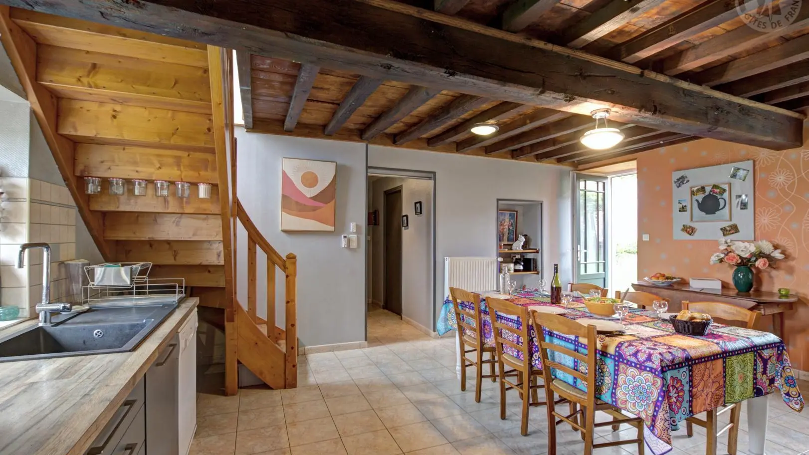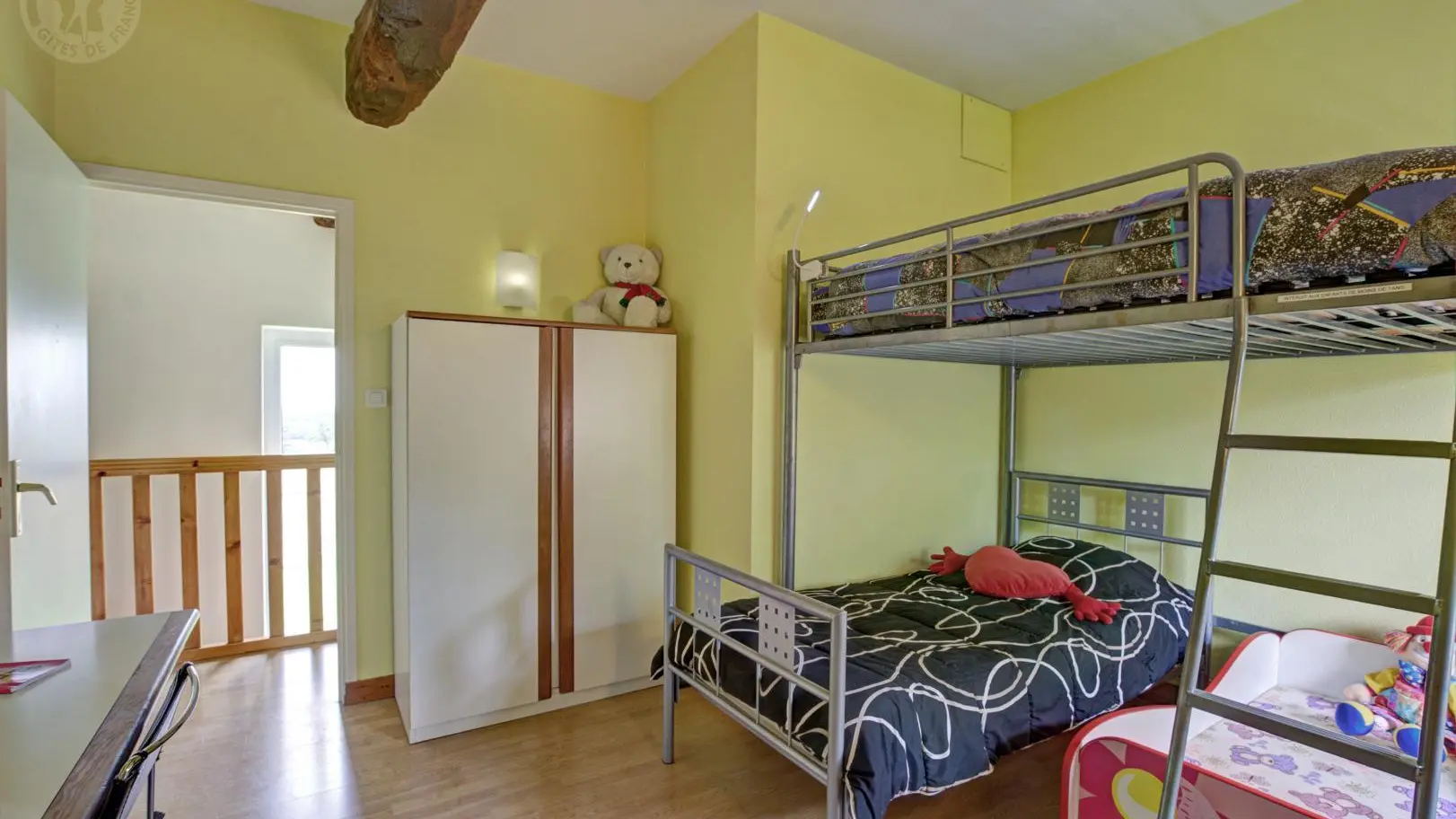 Gîte adjoining the owners' house of 140m² on the ground floor + upper floor. On the ground floor, you enter the integrated and equipped kitchen with dining room. The living room has a wood fireplace for a cozy and rustic atmosphere. On this level there are: a laundry room and a bathroom with WC. Upstairs, we find the 3 bedrooms. A master bedroom with a 140 bed & a baby bed and a private bathroom / a bedroom with a 140 bed and a child's bed / a bedroom with a 90 bed and a 140 high bed. On this level, there is a separate toilet and a bathroom (balneotherapy shower).