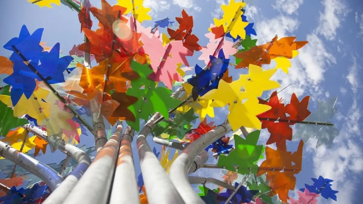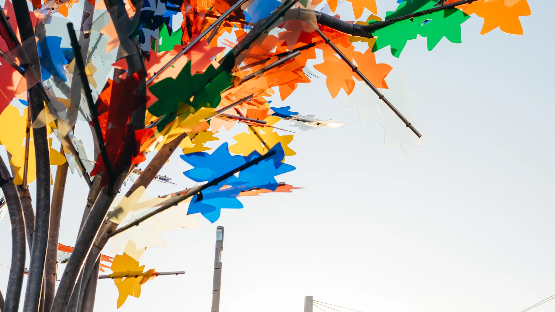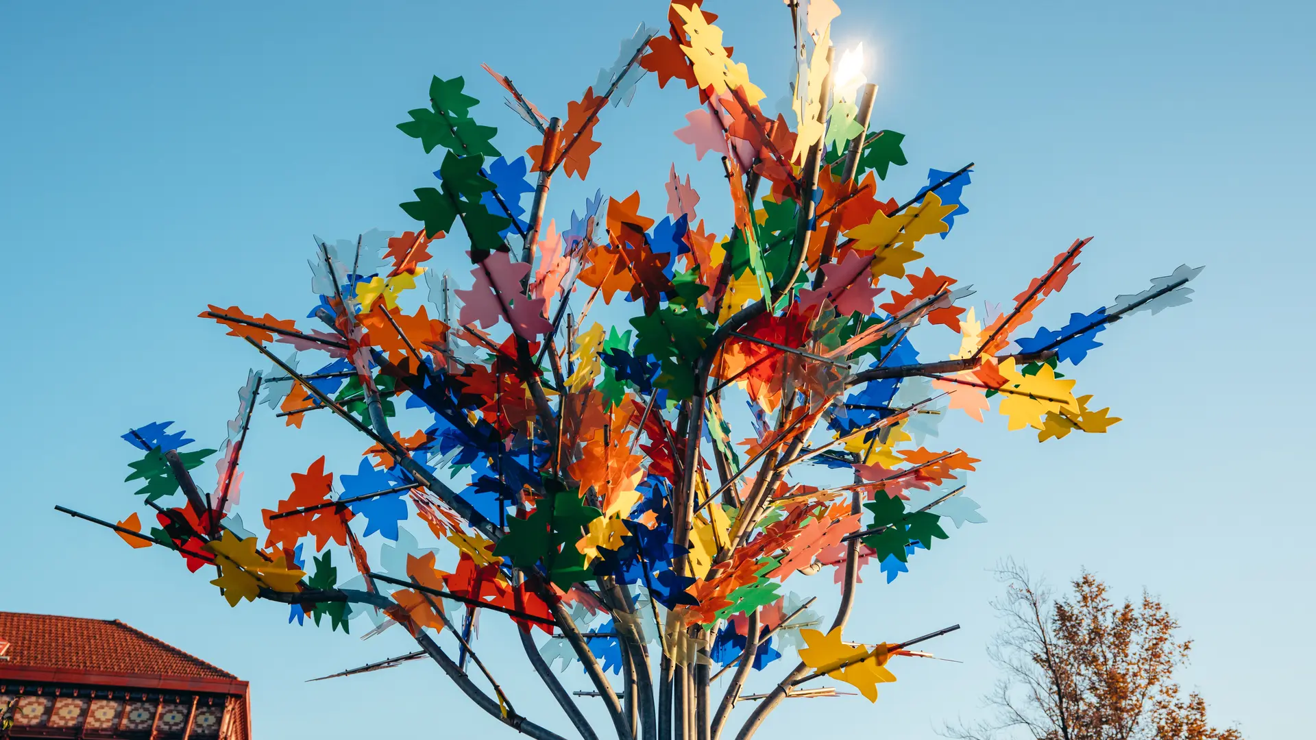 Only the artist knows what kind of tree this is: is it a maple, is it a plane tree...? What is certain is that it's timeless, and playful, with its foliage of blues, reds, yellows and greens.