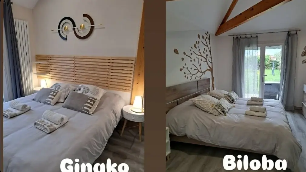 Chambre GINGKO confortable de 26 m², décor moderne et épuré, avec lit double confortable, un clic-clac et coin cuisine pratique et équipé : réfrigérateur, plaques de cuisson, micro-ondes, four et bouilloire, cafetière, parfait pour un séjour autonome.