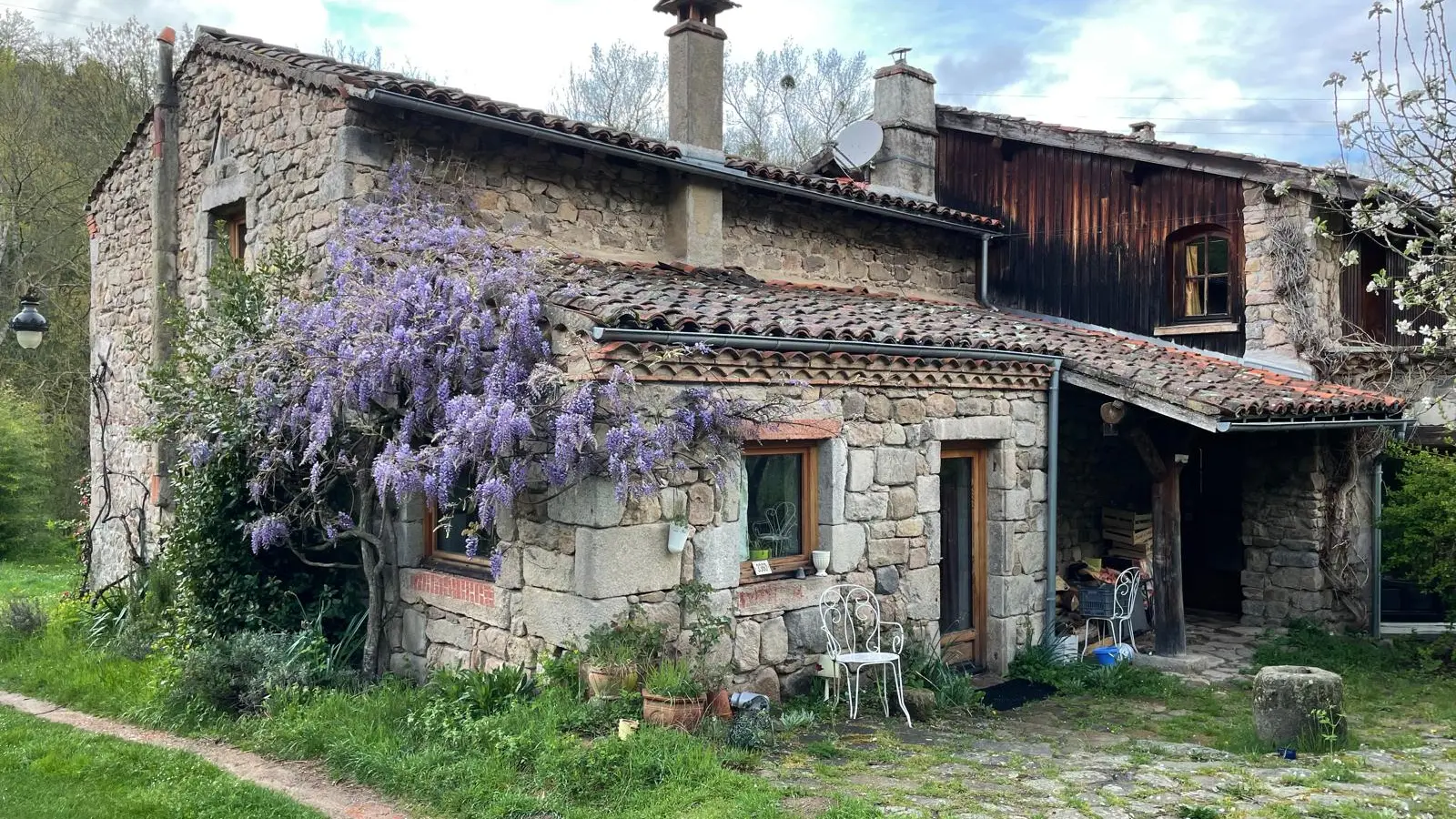 A l’extérieur, des espaces verts arborés entourent la maison, et au milieu coule une rivière.