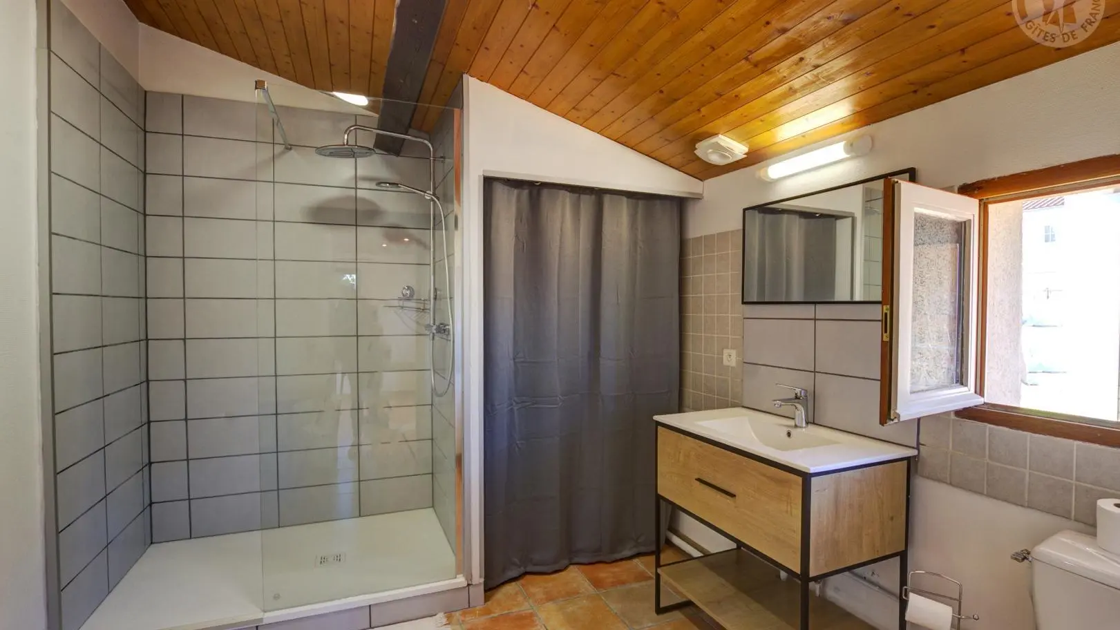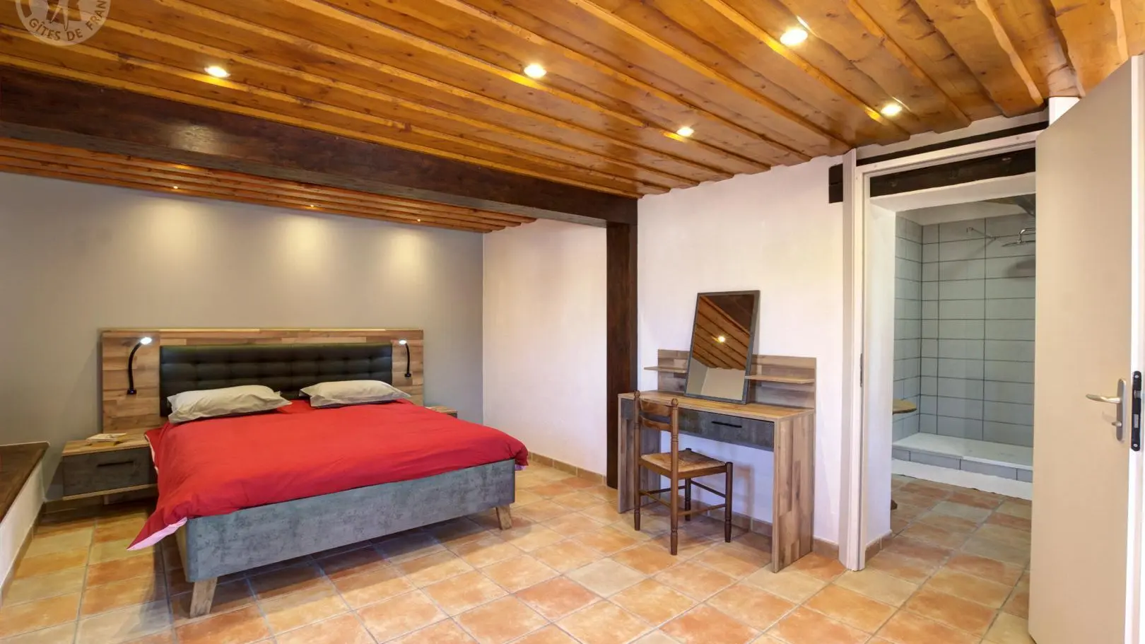 Gîte de 230m² (rdc+étage). En rez-de-chaussée, le gîte s'ouvre sur les pièces à vivre : le séjour avec salle à manger & espace salon détente (TV, baby-foot), la cuisine entièrement équipée disposant d'un piano pour concocter de bons petits plats. A ce niveau, on retrouve une spacieuse chambre avec un lit 160 et un sanitaire complet avec douche & WC. Le 1er étage se compose de deux chambres pour deux personnes (en lit 160), d'un dortoir mansardé (aménagé sous les combles, idéal pour les ados - 2 lits 90 & 1 lit 140), d'une salle de bains et d'un WC indépendant. La mezzanine est équipée d'un BZ convertible pouvant servir de couchage d'appoint. La 5ème chambre du gîte est une suite qui se situe en annexe attenante, disposant d'une entrée indépendante et d'un sanitaire complet et privatif (1 lit 160, douche vasque et WC).