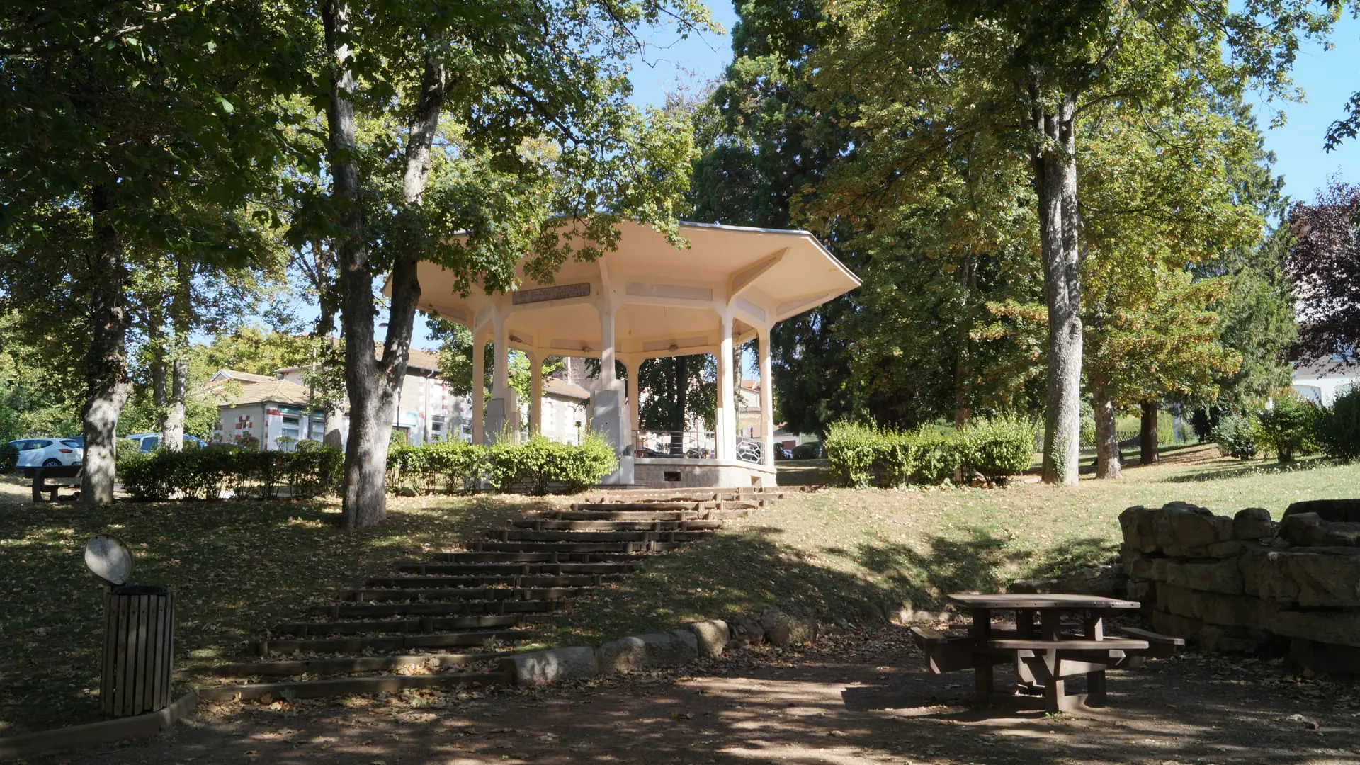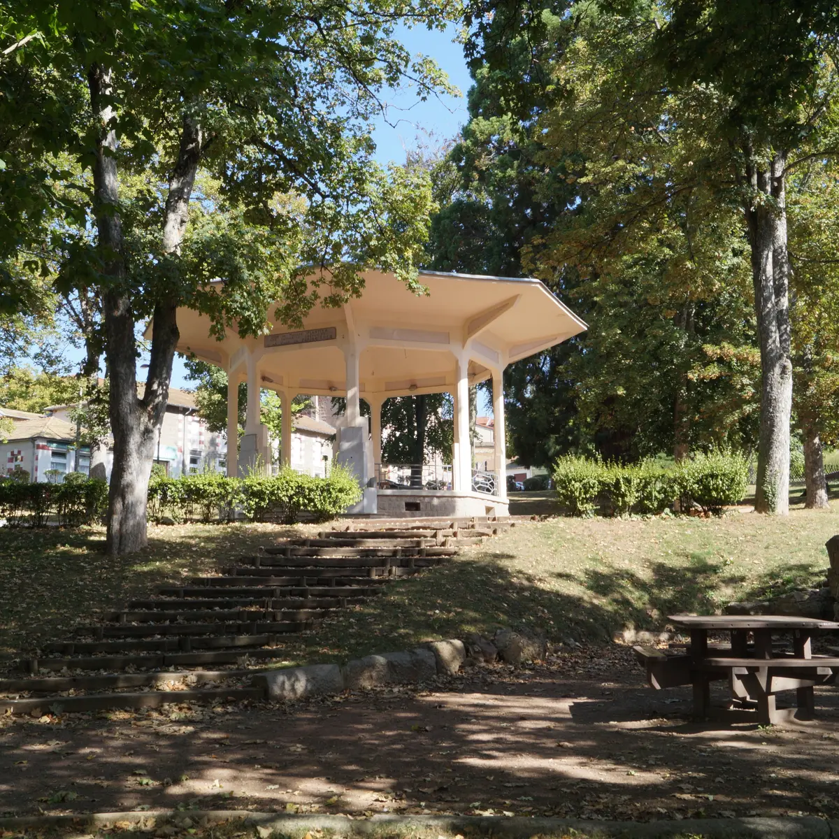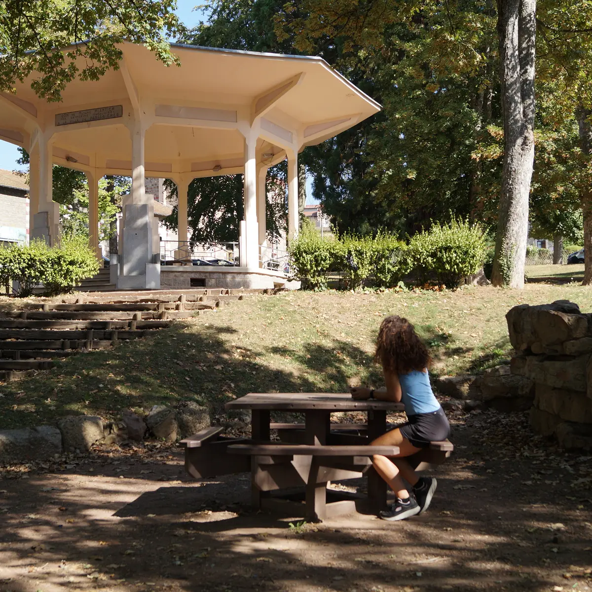 Tables de pique nique située dans le jardin public, à côté du kiosque, jeux pour enfants et petit étang du jardin.