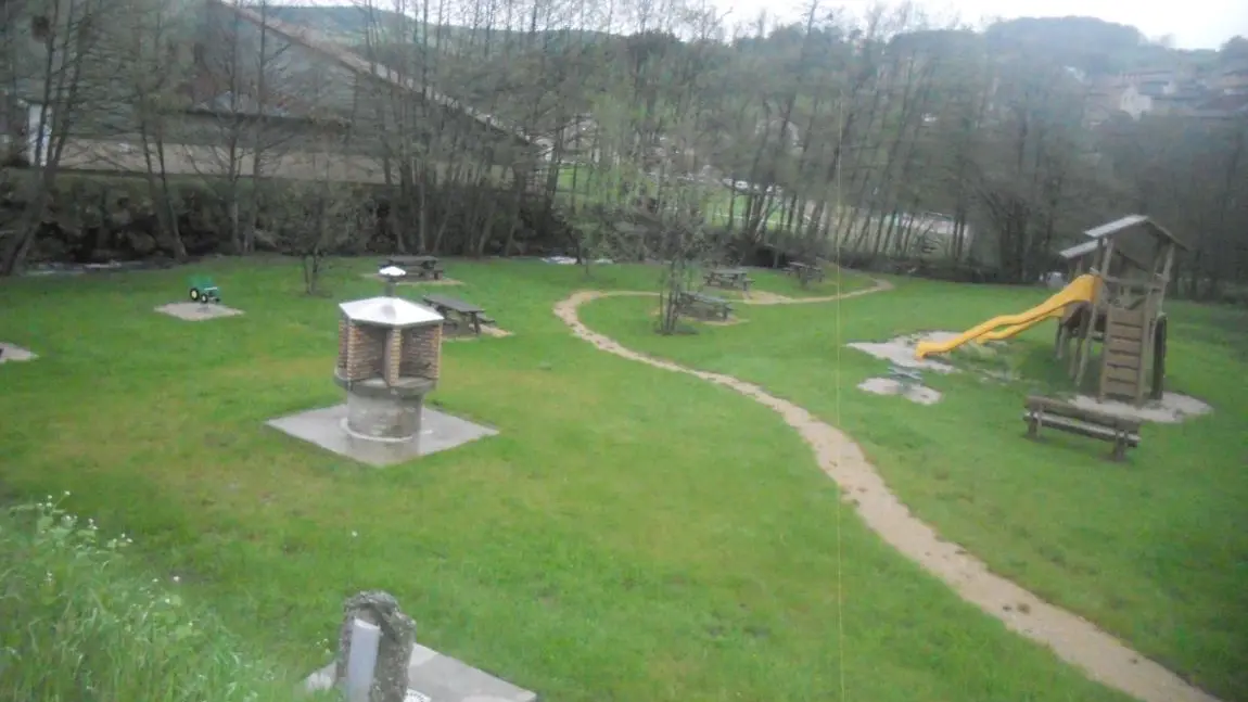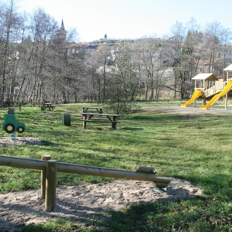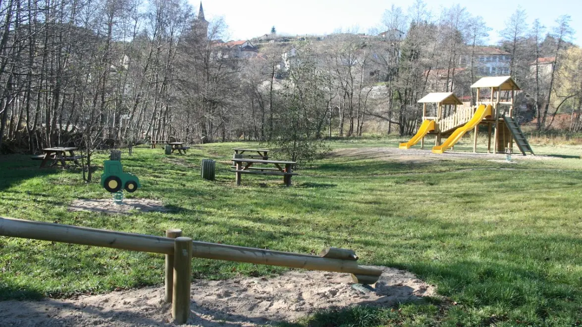 Aire de jeux (tobogan, tyrolienne...) espaces ombragés en bord de rivière.