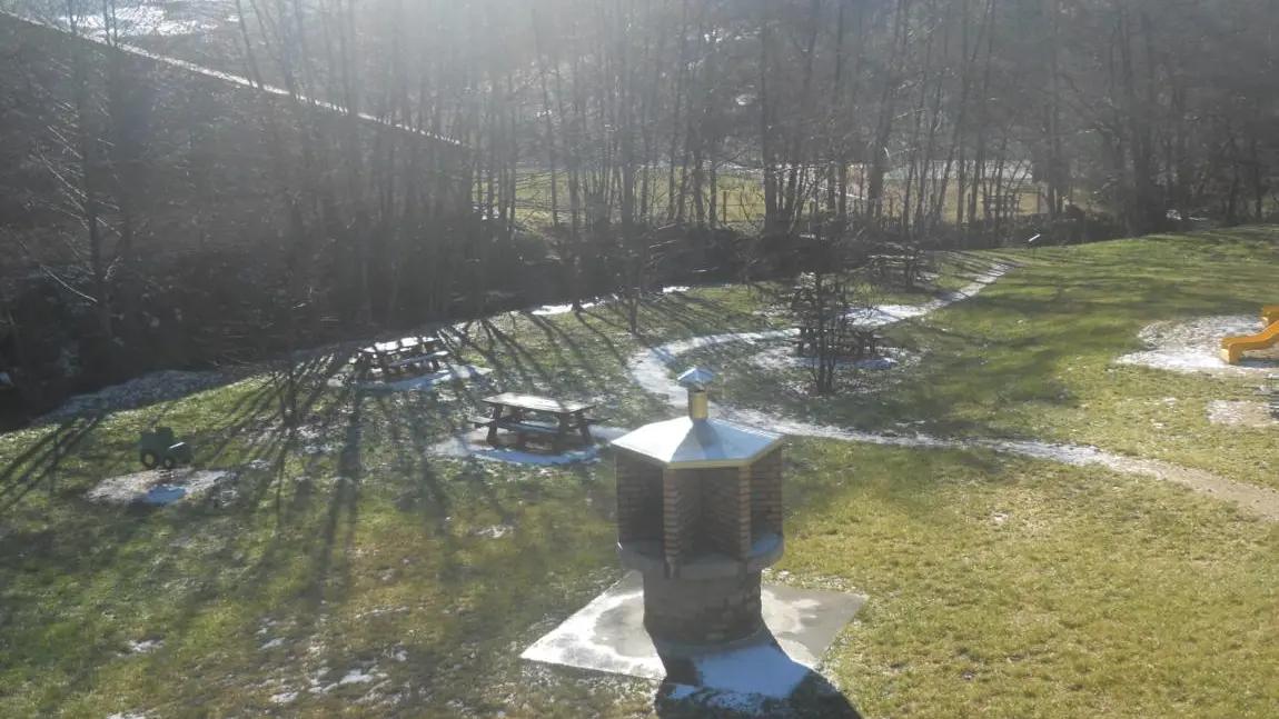 Aire de pique-nique disposant de 5 tables en bois, 1 barbecue, 1 fontaine à eau et 2 bancs.