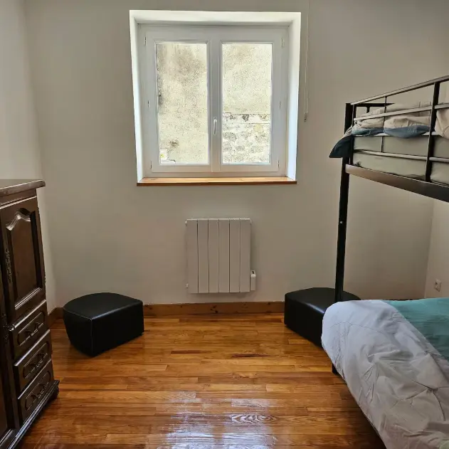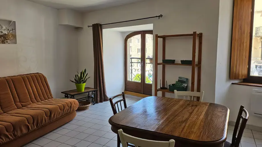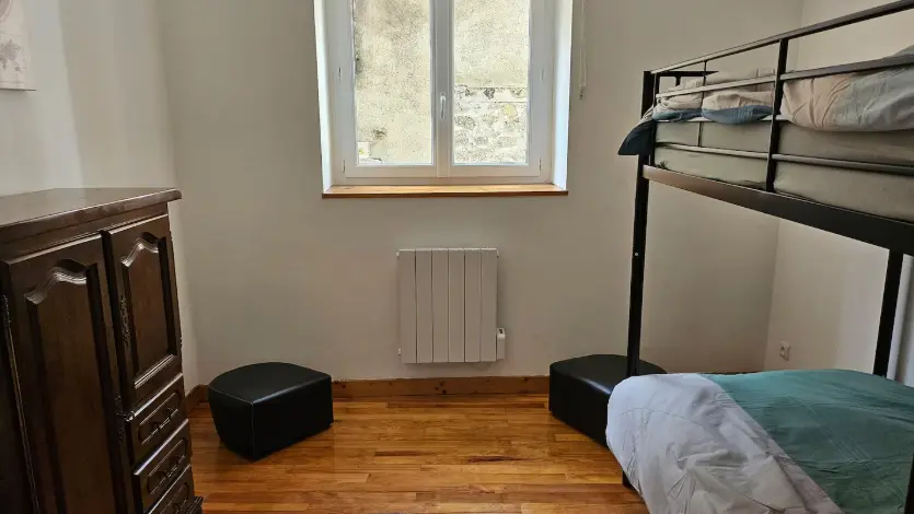 Appartement accueillant 6 personnes au coeur du village d'Usson-en-Forez composé d'une grande pièce à vivre avec canapé convertible, 2 chambres dont une avec un lit en 140 et une seconde avec lit jumeaux, salle de bain et toilettes.
