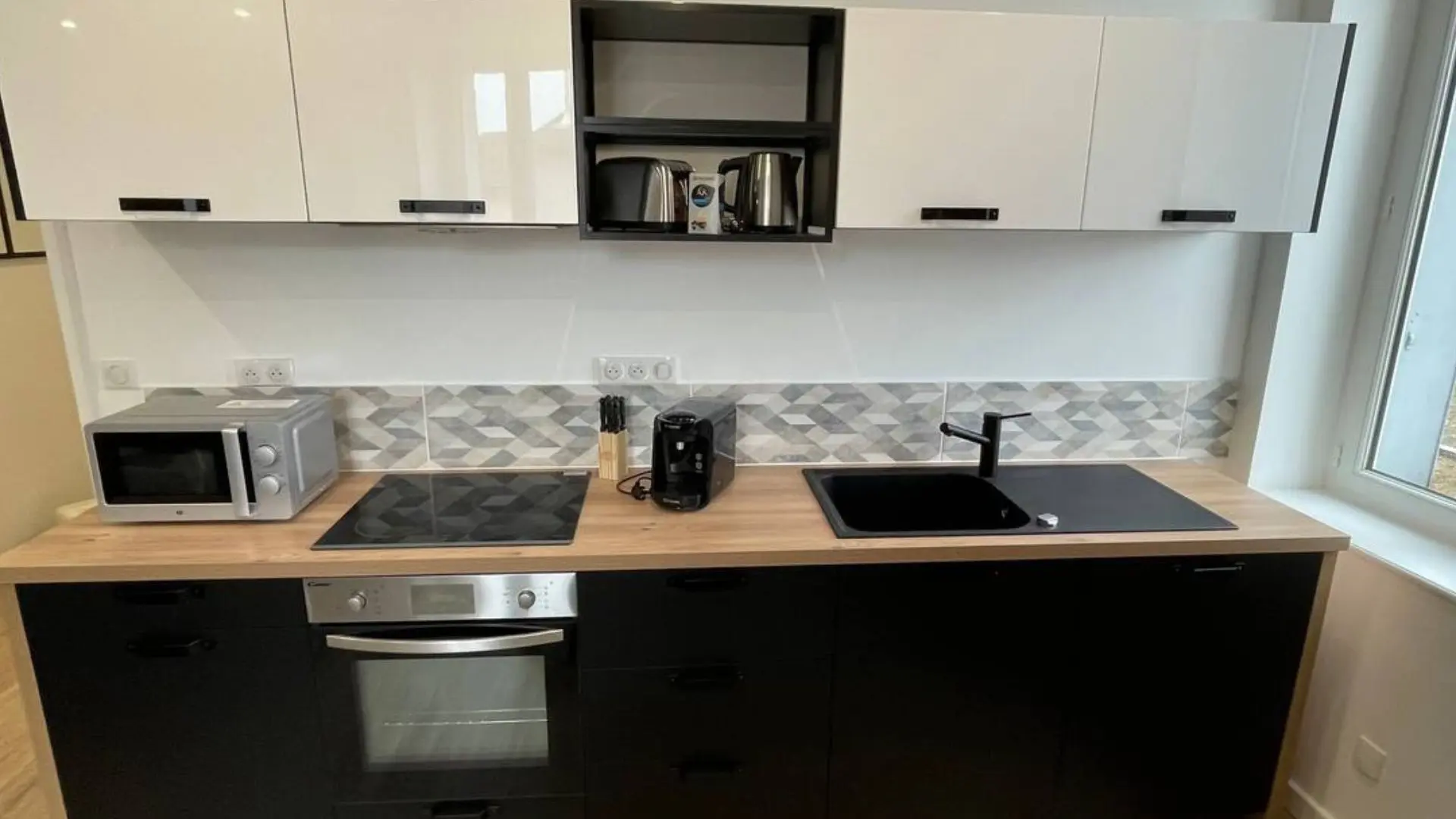 - d'une cuisine équipée (four, micro-ondes, lave vaisselle, frigo, plaque induction, machine à café, vaisselle, ustensiles de cuisine,...)