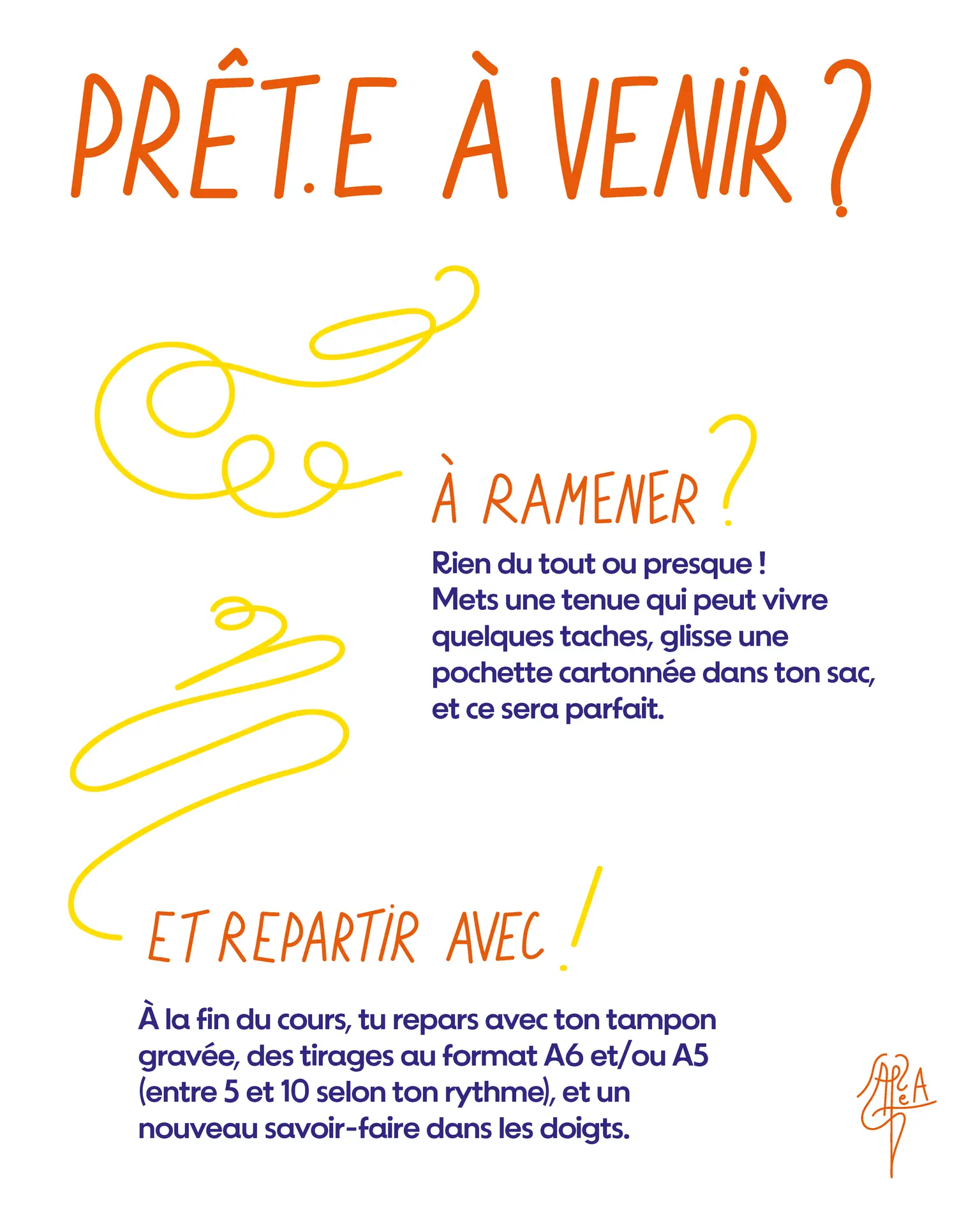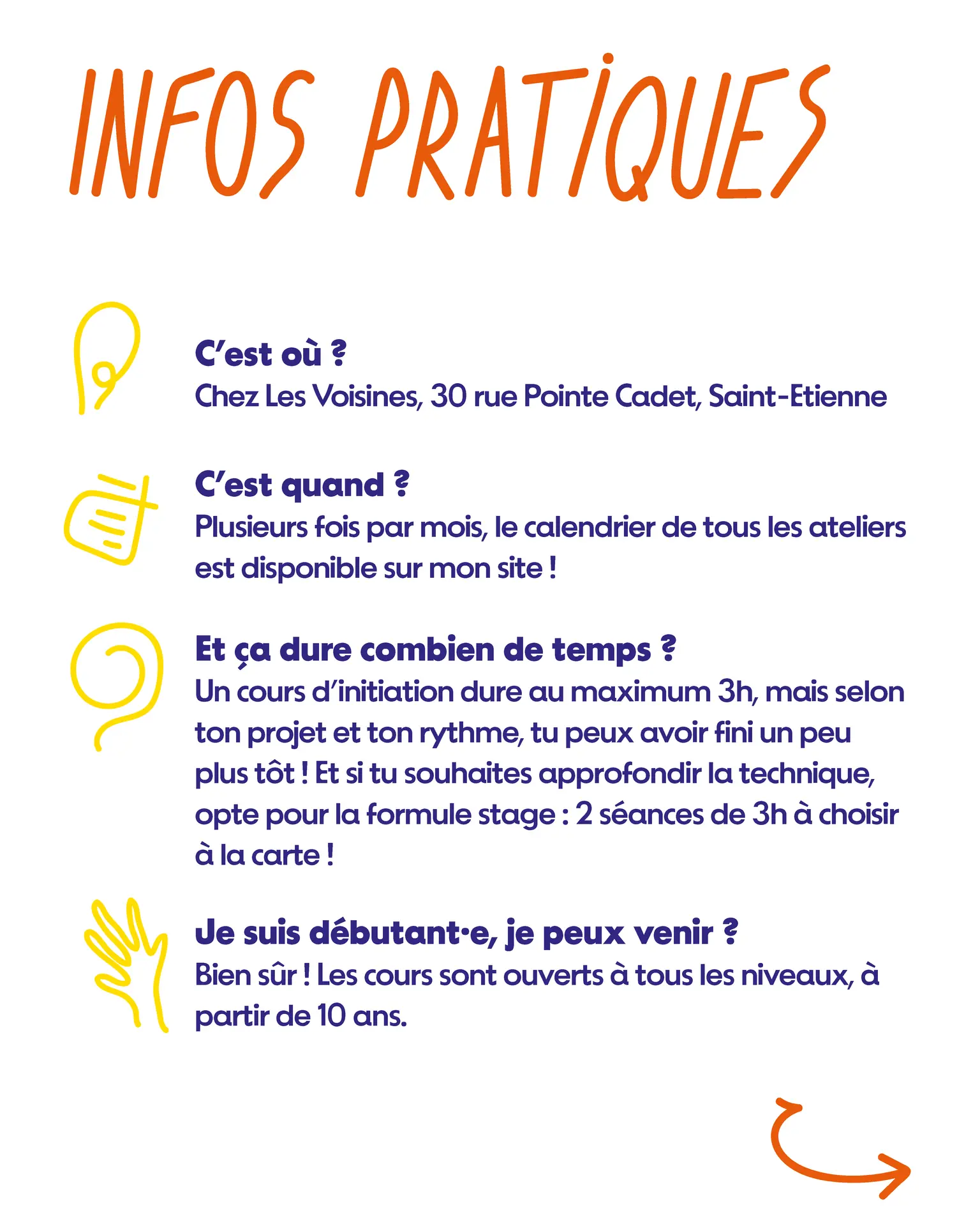 Avant de réserver ici, choisis les dates de ton/tes atelier(s) dans le formulaire : https://forms.gle/8C1Pi8ByEAGoCxKD6 et finalise ta réservation en achetant l’option atelier ou stage en haut de page.