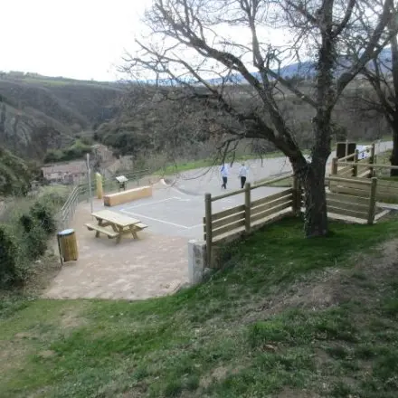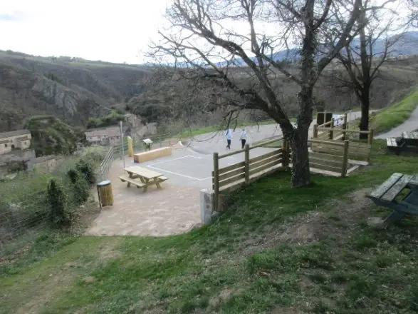 Une table de pique-nique est accessible par une allée en dur avec une pente inférieure à 5%. Deux autres tables en hauteur, sont accessibles par un escalier.