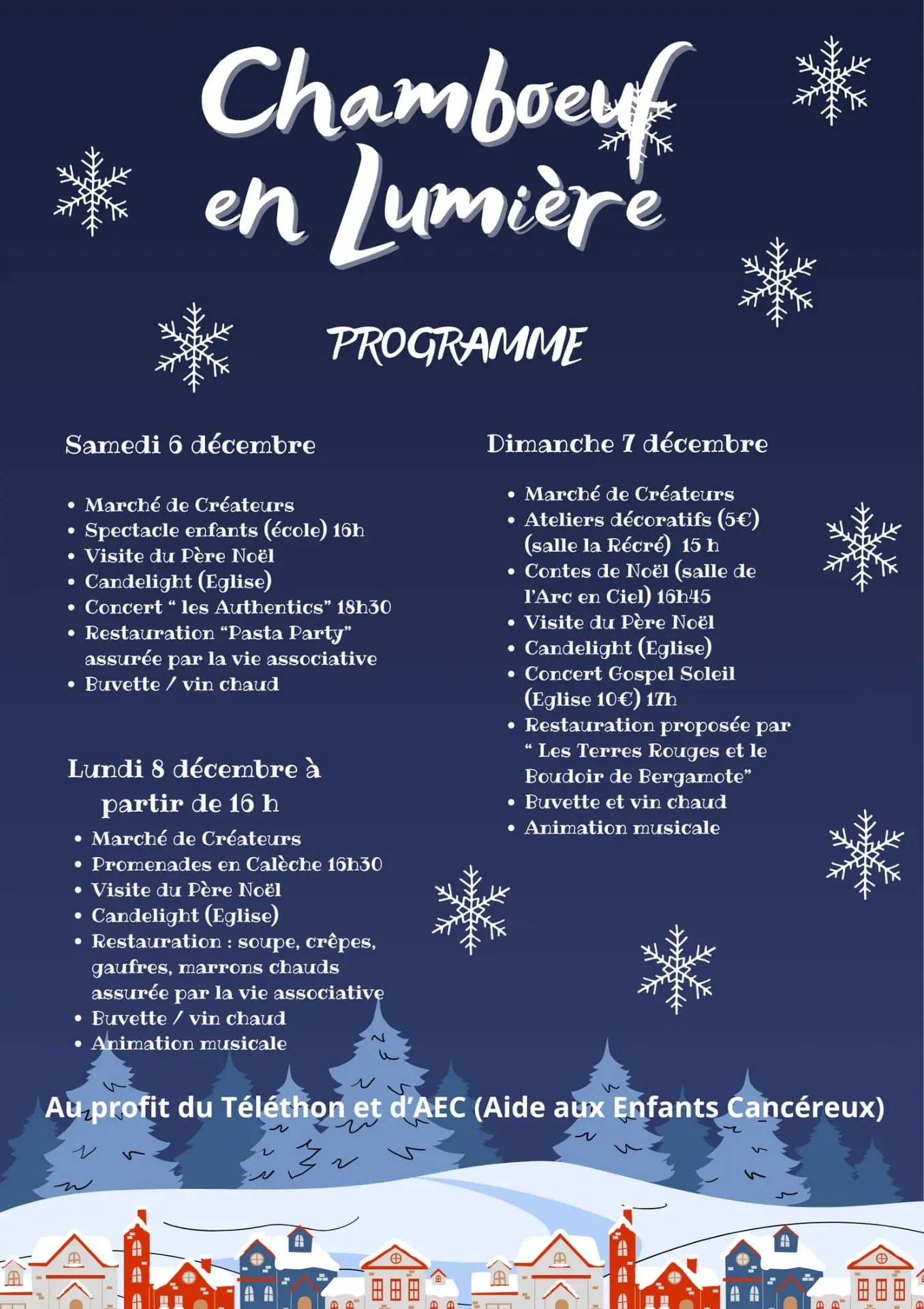 Visite du Père Noël, Candelight à l' église, Concert avec les Authentics, Restauration, Vin chaud assurés par la vie associative.