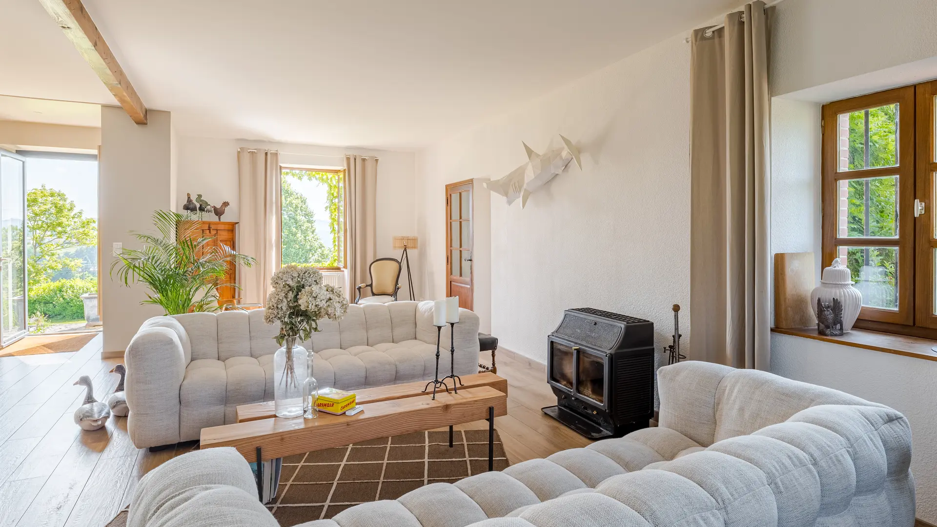 La maison (250m²) est composé au rez-de-chaussée d'une grande cuisine, une salle a manger, un grand salon confortablement décoré autour d'un poêle à bois et de deux grands canapés.