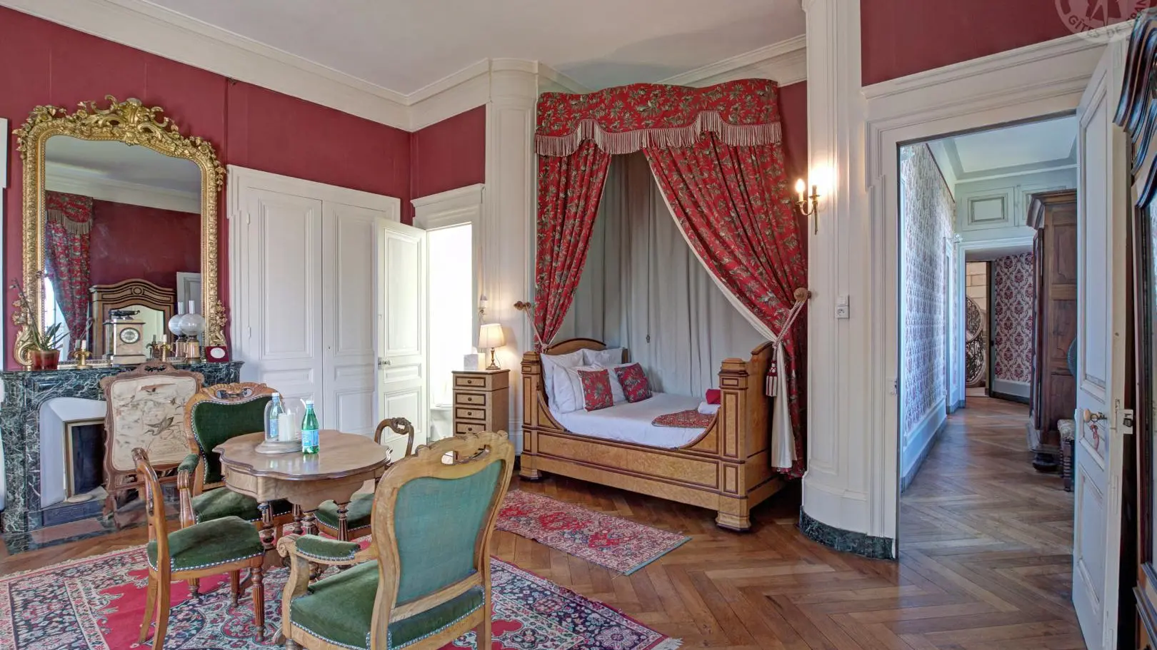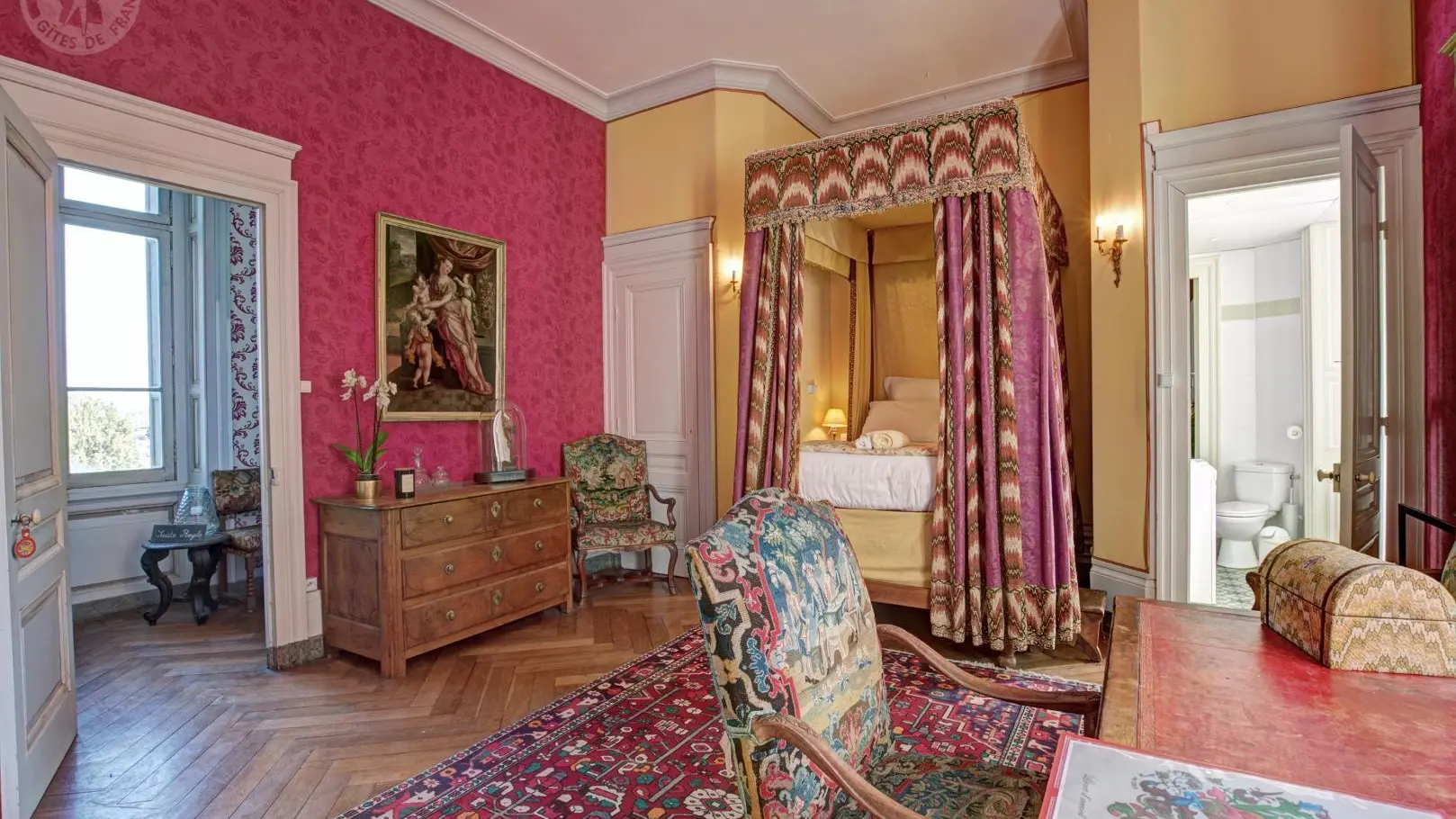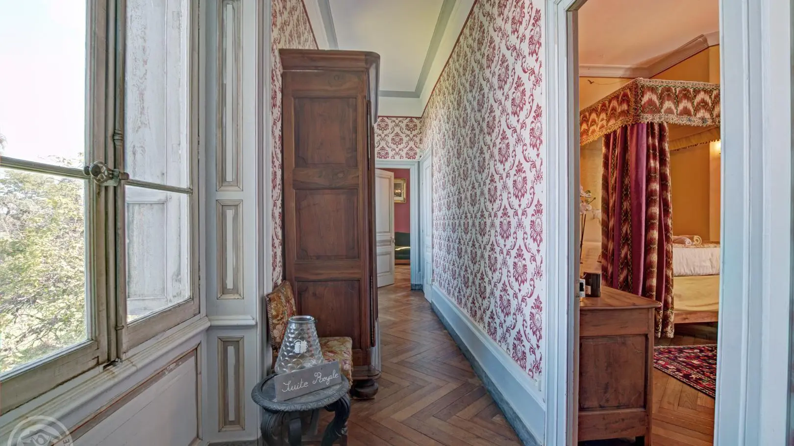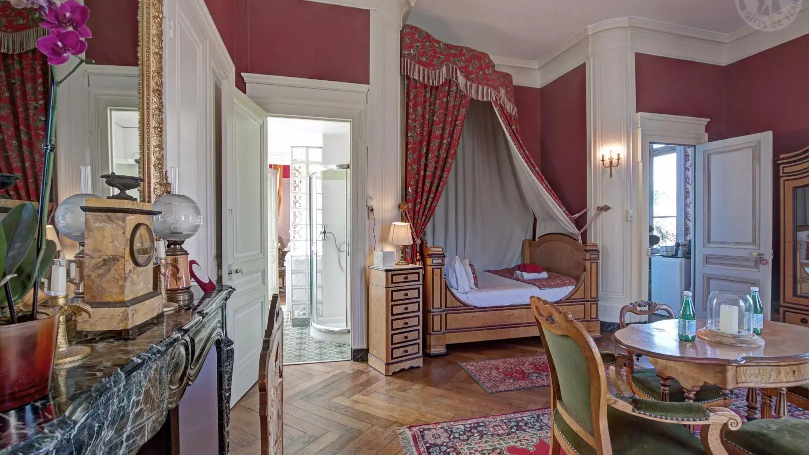 Suite Royale : composée de deux chambres communicantes – la chambre du Roi avec un lit à colonnes XVIIe et la chambre Rouge avec un lit à baldaquin – reliées par une salle de douche.