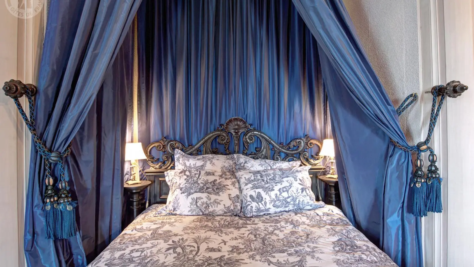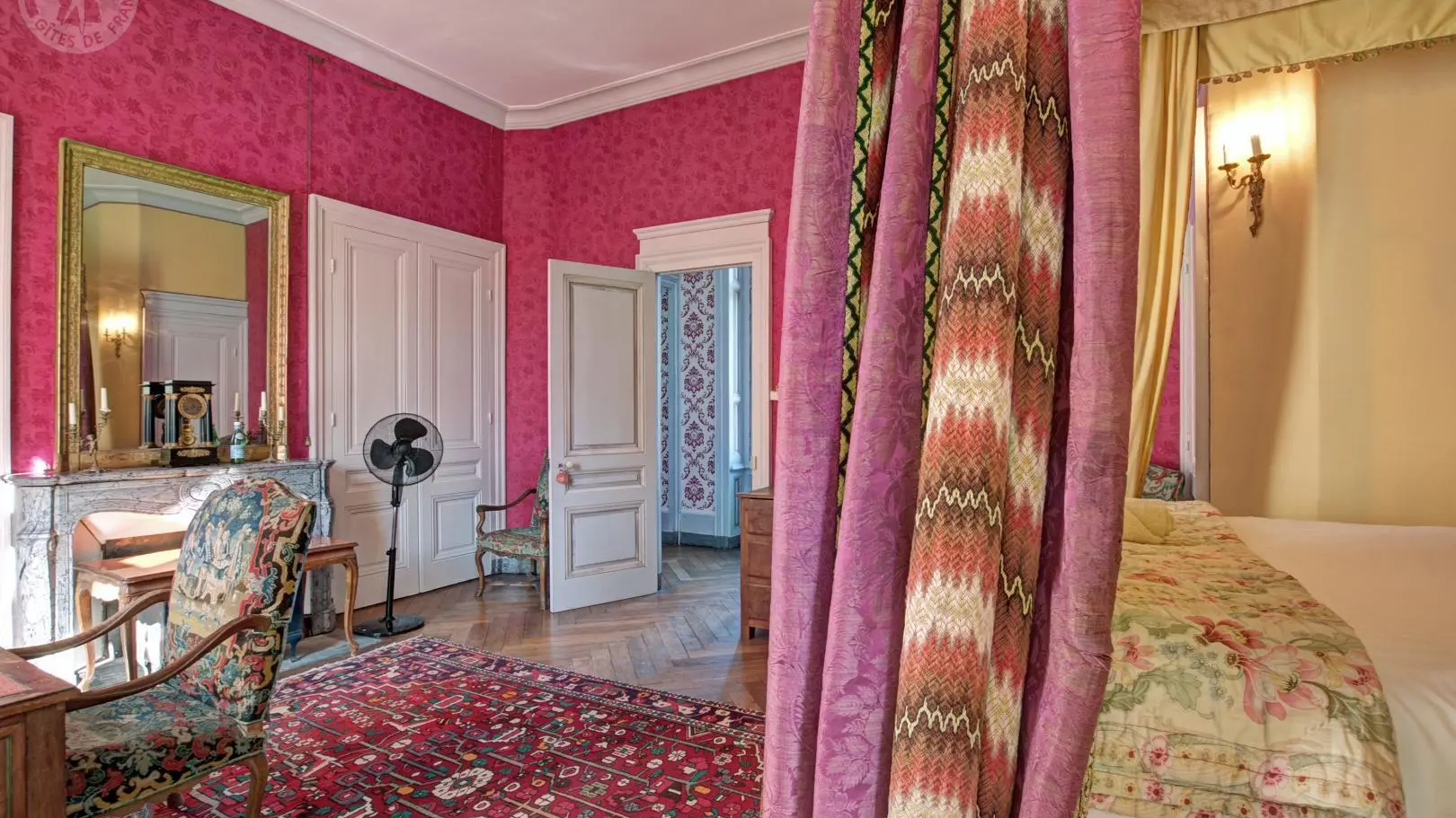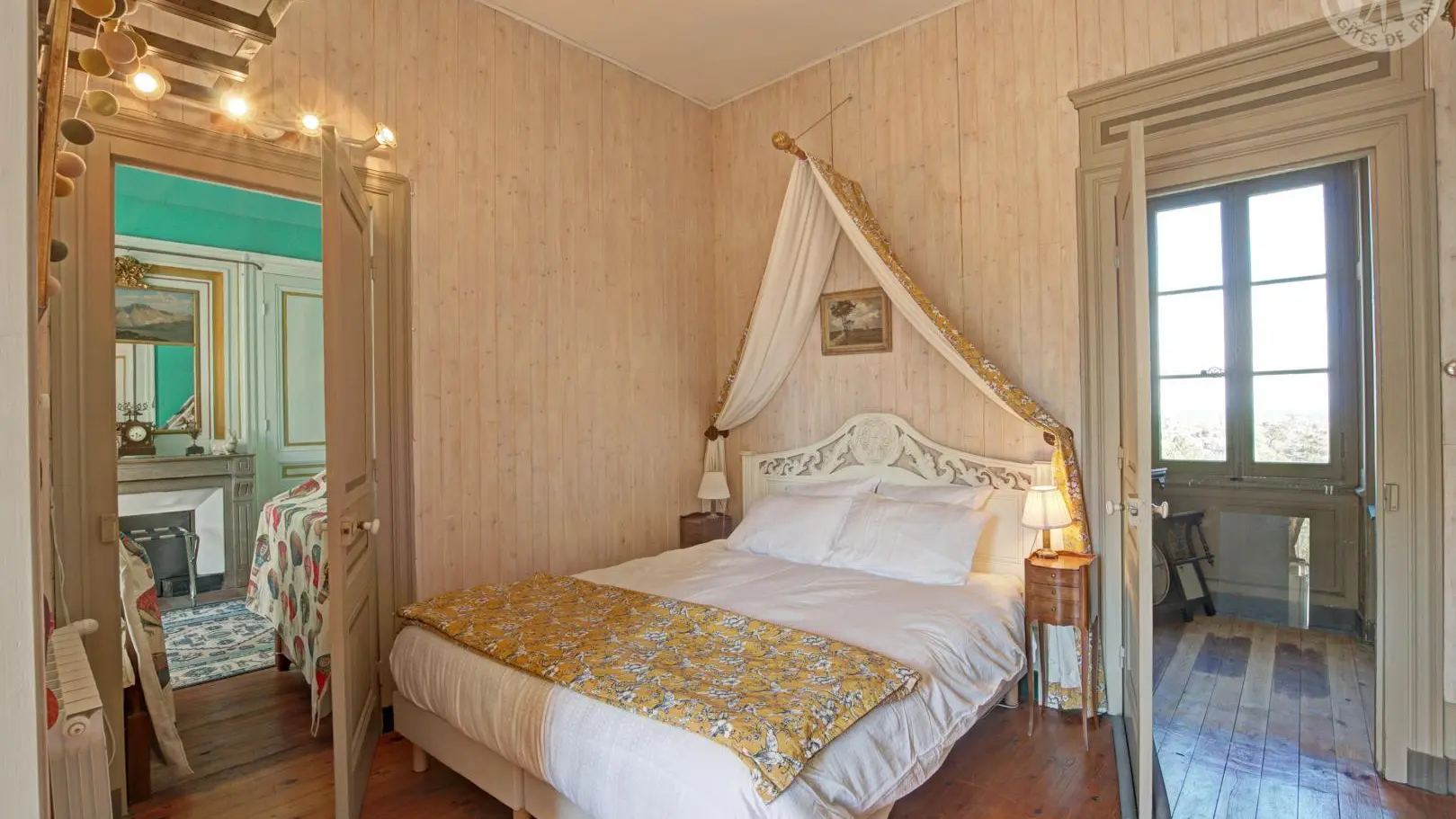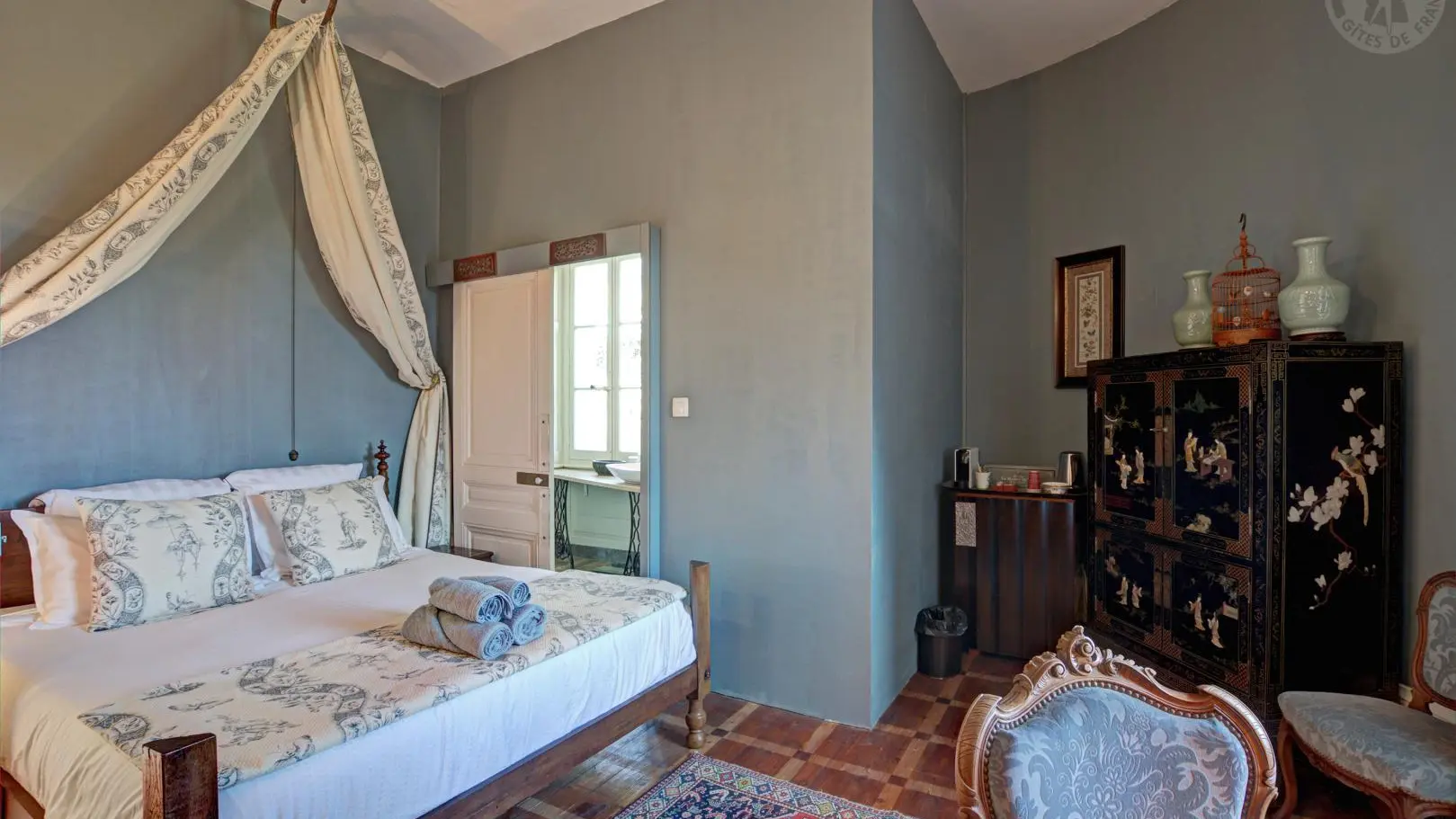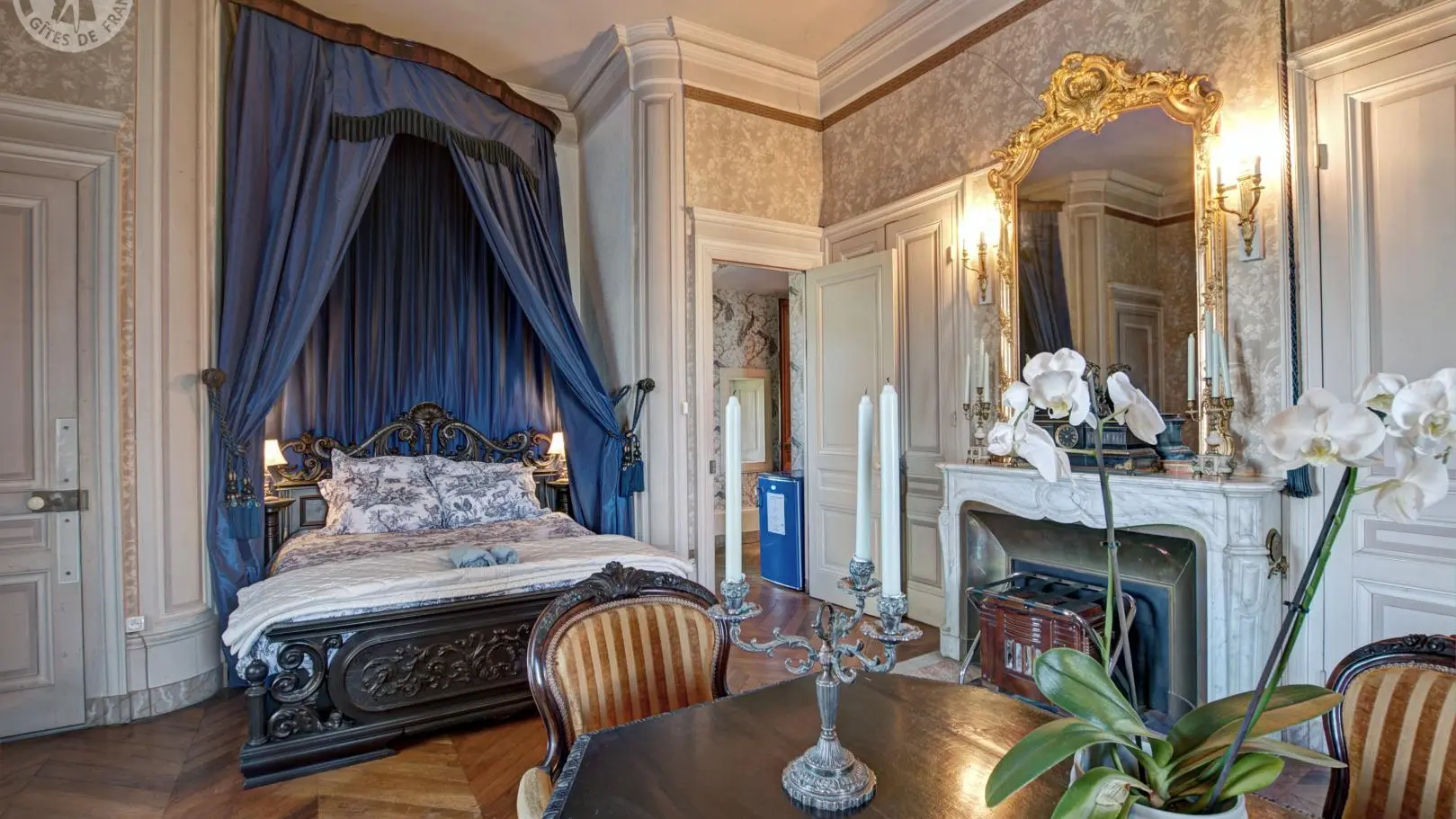 Suite Royale : composée de deux chambres communicantes – la chambre du Roi avec un lit à colonnes XVIIe et la chambre Rouge avec un lit à baldaquin – reliées par une salle de douche.