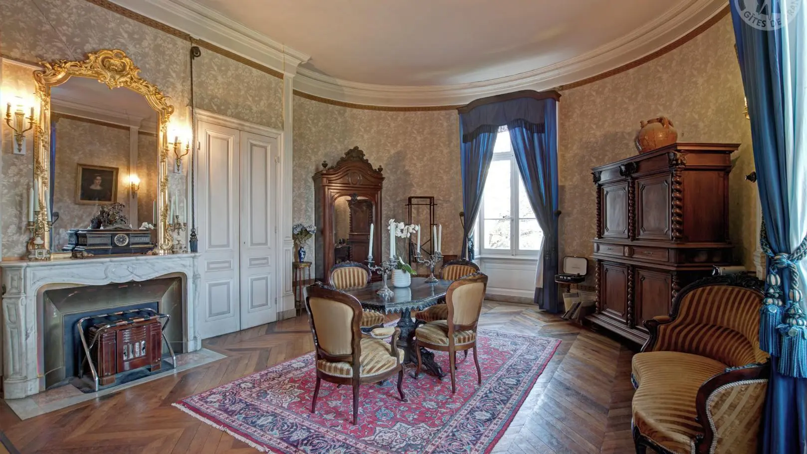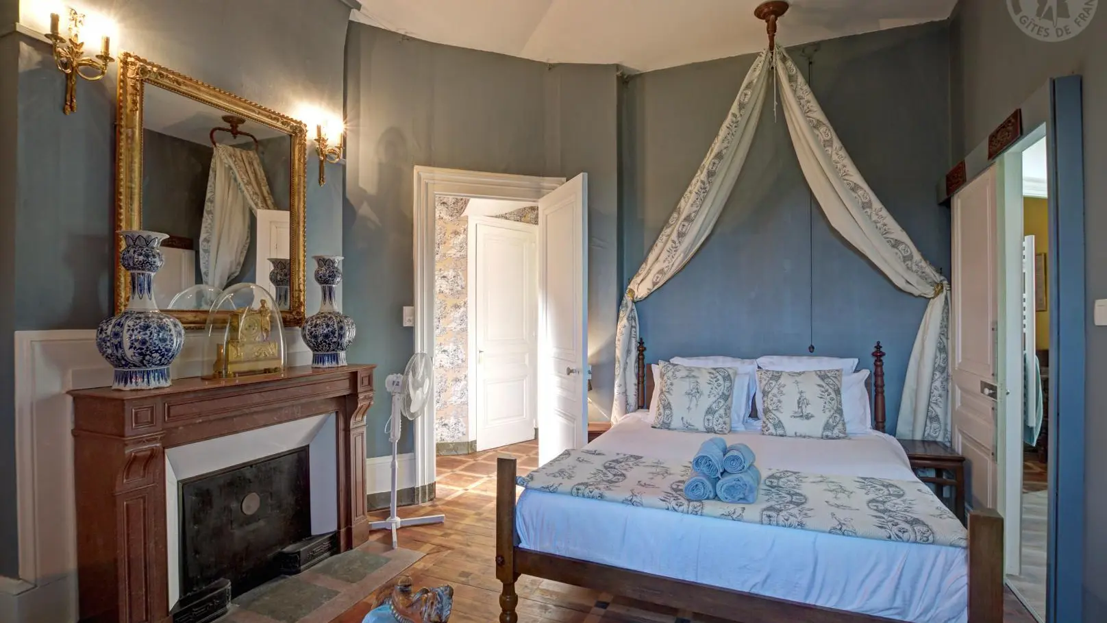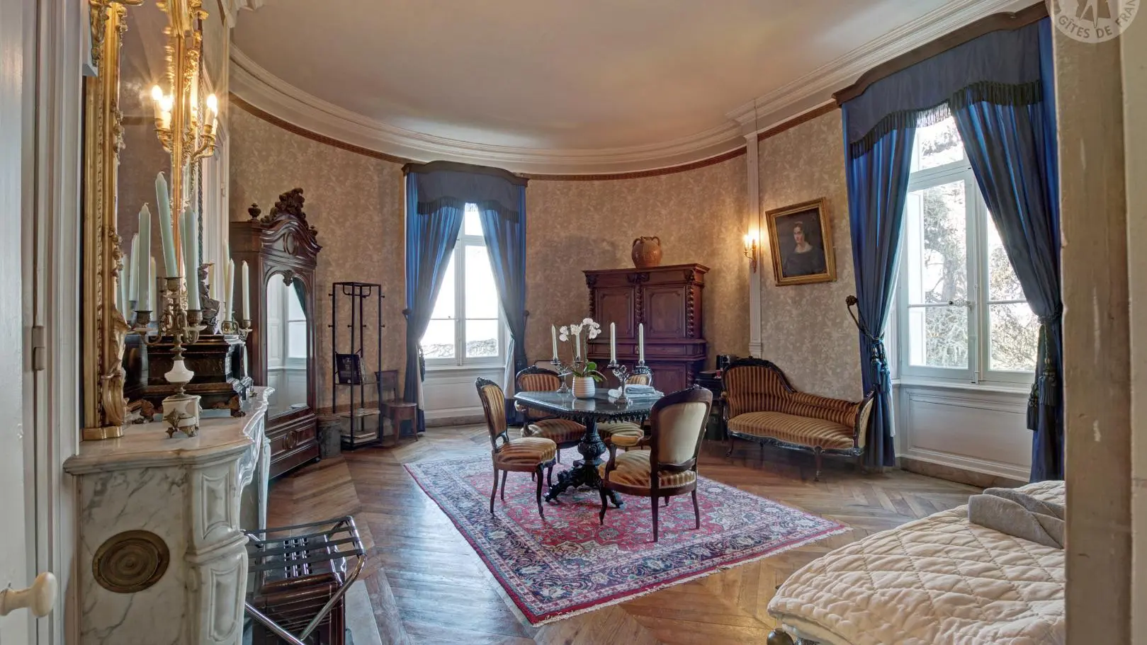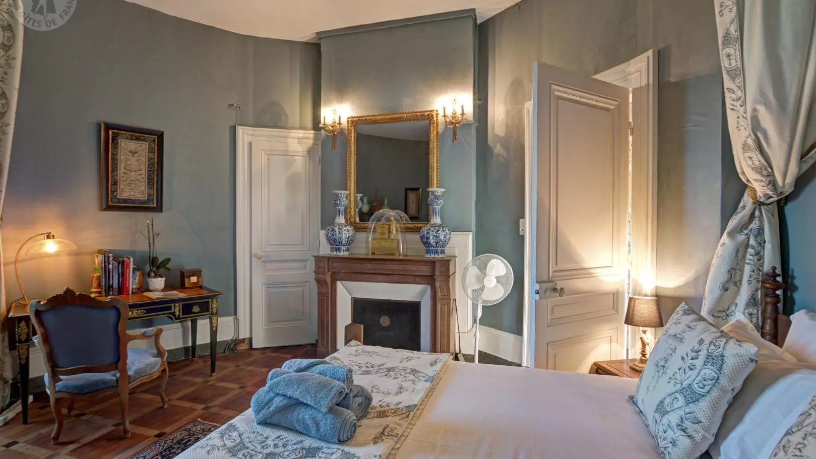 Chambre Bleue : 60 m², lit Queen-size pour 2 personnes, mobilier d'origine Napoléon III et vue imprenable sur la plaine du Forez.