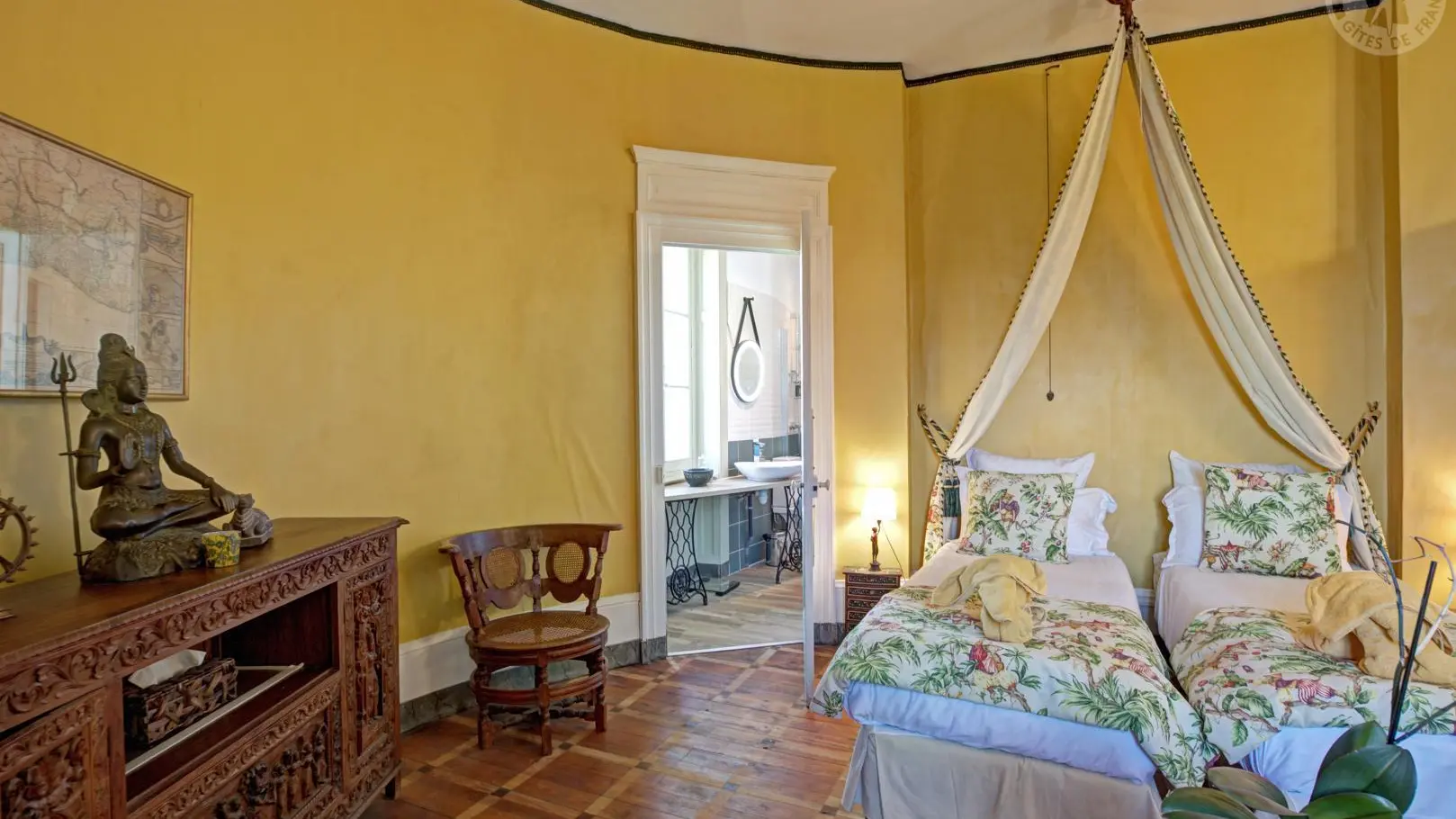 Suite Coloniale : 60 m², deux chambres communicantes avec salle de douche – la chambre Malaisienne avec lit Queen-size et la chambre Pondichérienne pouvant accueillir un lit Queen-size ou deux lits simples, idéale pour 4 personnes.