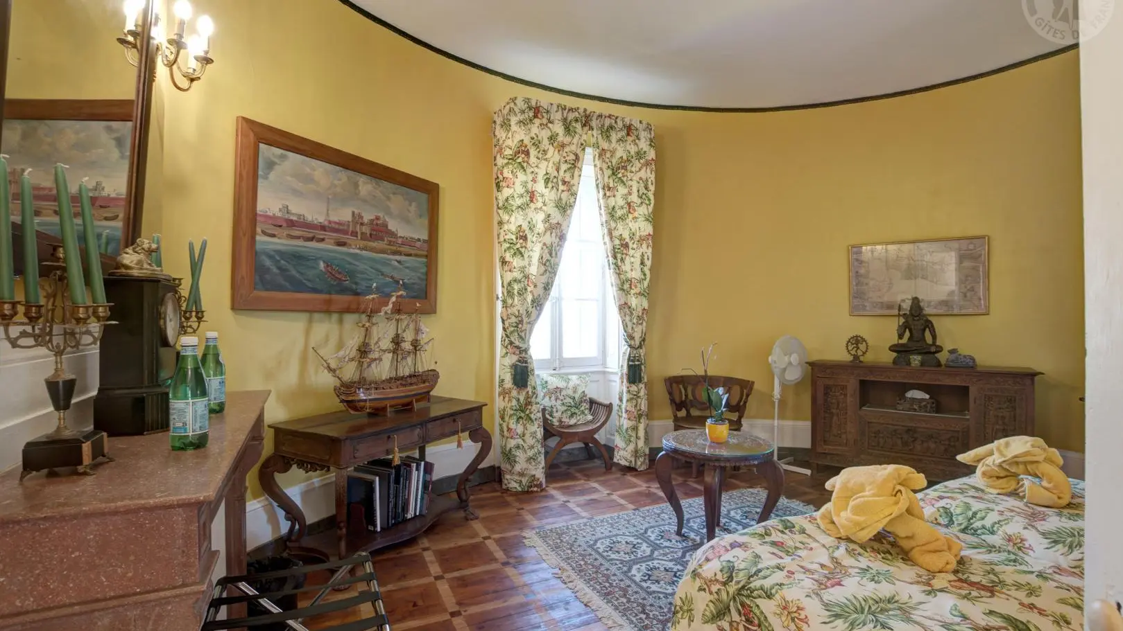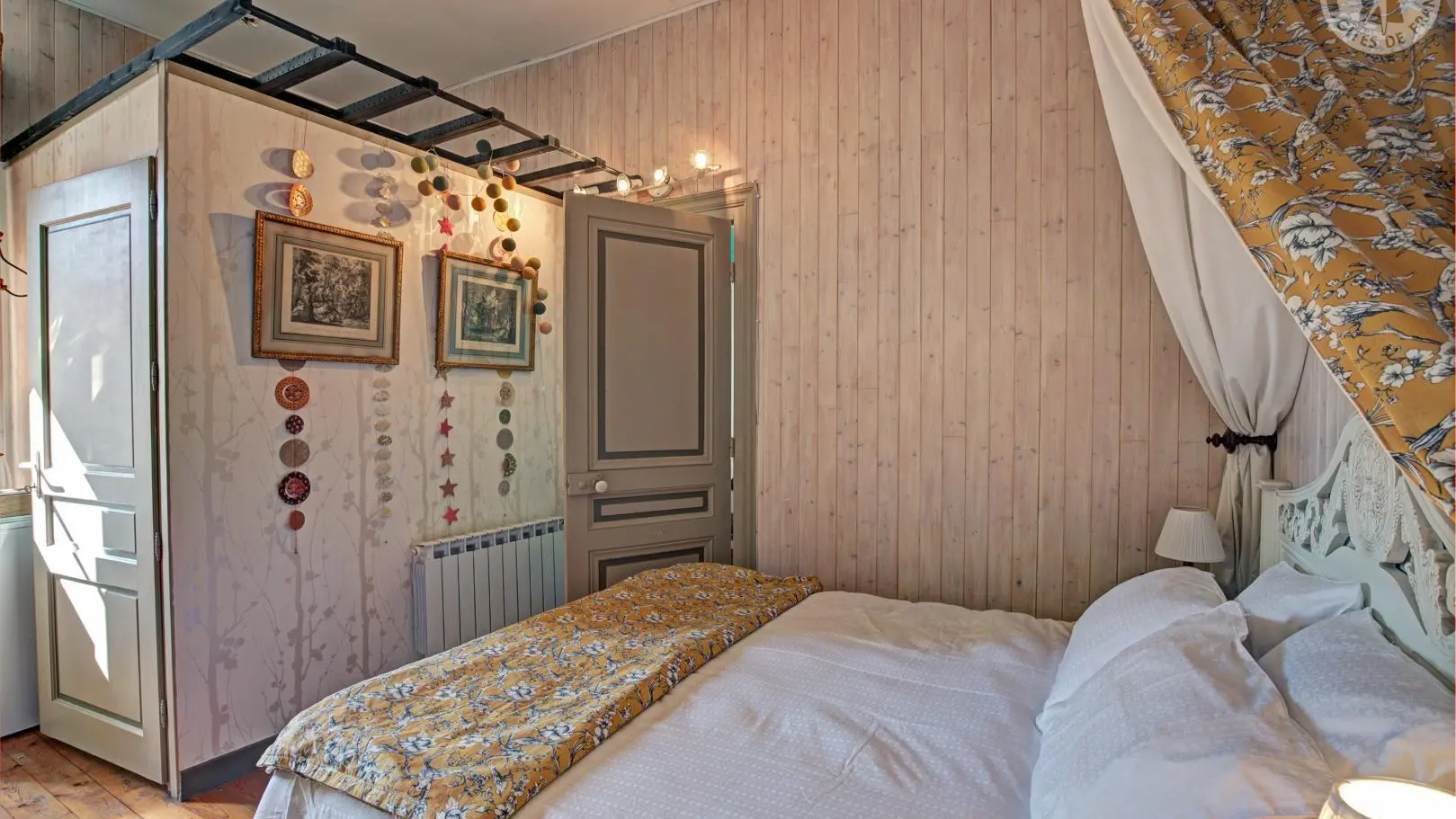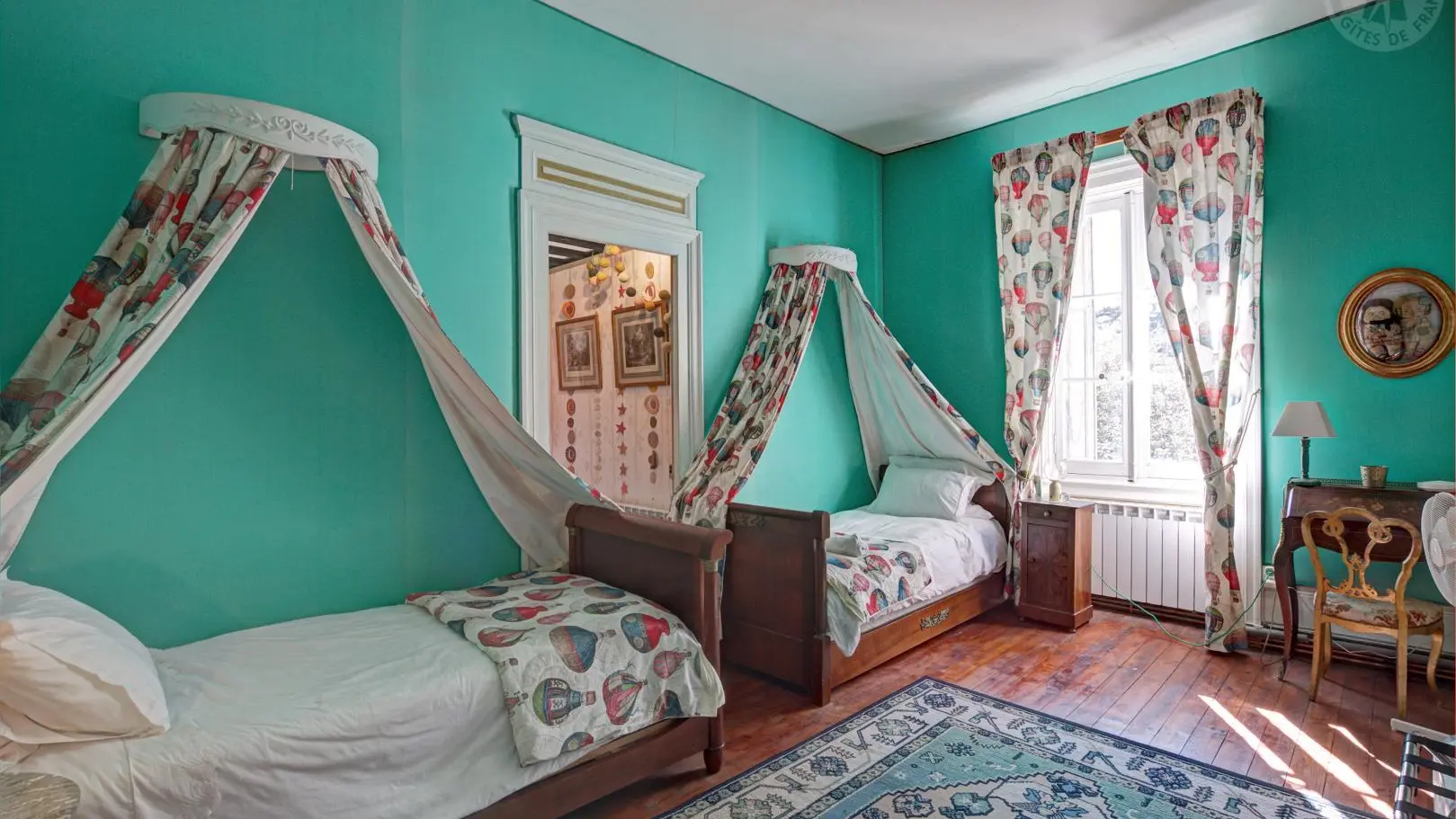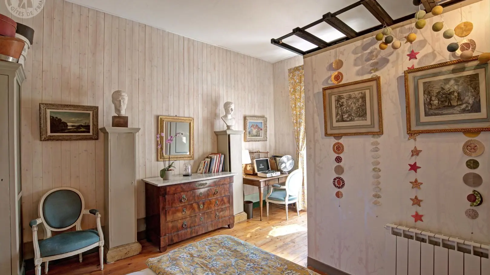 Suite Céleste : 40 m², ancienne chambre de la gouvernante et des enfants, équipée d'un lit Queen-size et de deux lits simples, parfaite pour un couple avec enfants ou 4 personnes. Offrez-vous un séjour unique dans ce château d'exception pouvant accueillir jusqu'à 14 personnes. Situé au cœur du bourg, dans une propriété d'un hectare, il propose un cadre paisible avec une vue sur la plaine du Forez et les monts du Lyonnais, pour une parenthèse ressourçante au cœur de l'histoire.