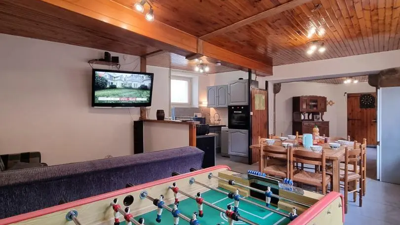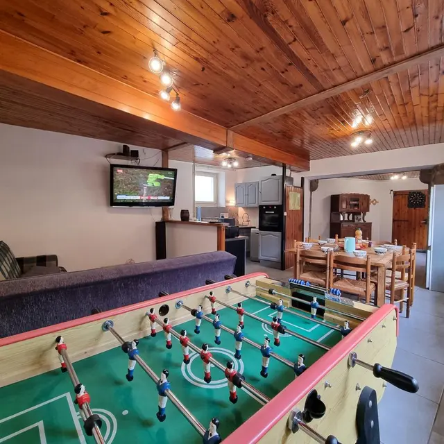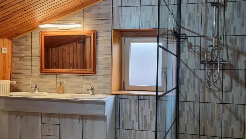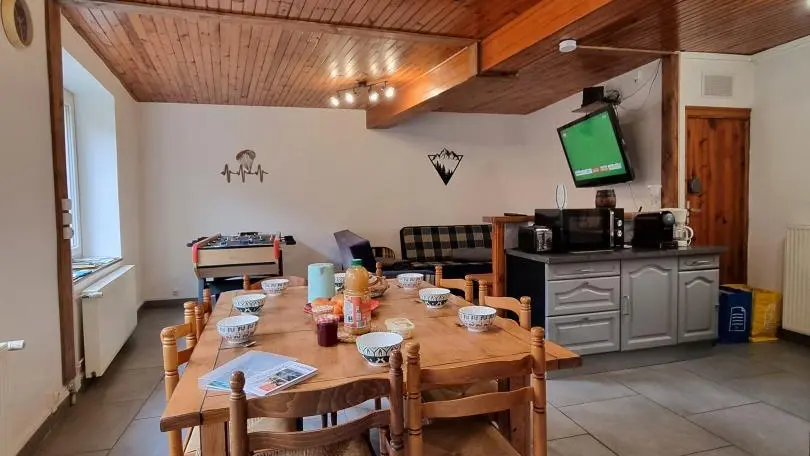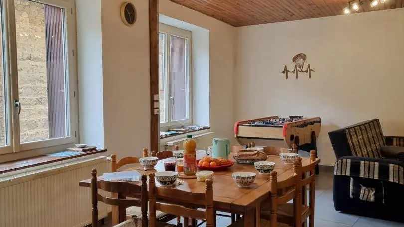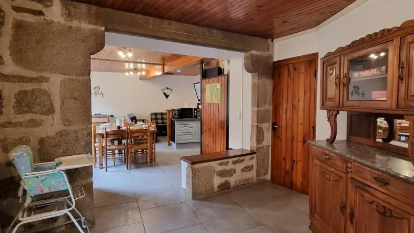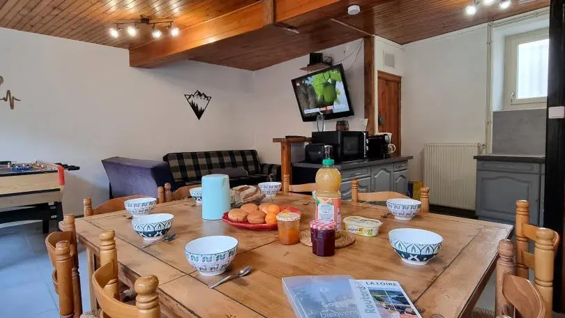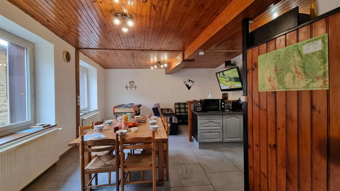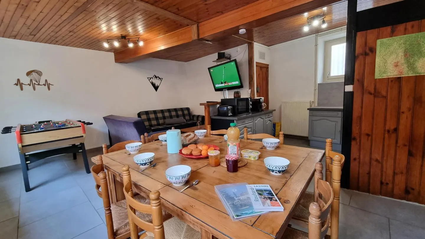 Chez Feufeu est une maison de village en pierres de 1848, aménagée en maison de vacances de 77 m² sur deux niveaux. La pièce de vie chaleureuse réunit une cuisine équipée ouverte, une salle à manger et un salon lumineux. Le hall d’entrée, pensé pour votre confort, permet de ranger skis et matériels de plein air. À l’étage, trois chambres accueillent des lits 140x190 et 90x190, ainsi qu’une salle d’eau dotée d’une douche, d’une double vasque et d’un WC. Le niveau 2 épis assure un séjour soigné, pratique et parfaitement adapté aux séjours en famille ou entre amis. Une location de vacances avec nature et grands espaces à Chalmazel dans la Loire !