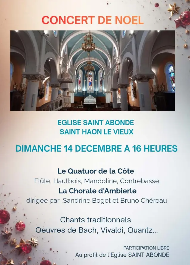 Un concert de Noël sera donné en l’église Saint Abonde à Saint-Haon-le-Vieux. Le Quatuor de la Côte et la Chorale d’Ambierle, dirigée par Sandrine Boget et Bruno Chéreau, interpréteront chants traditionnels et œuvres de Bach, Vivaldi et Quantz.
