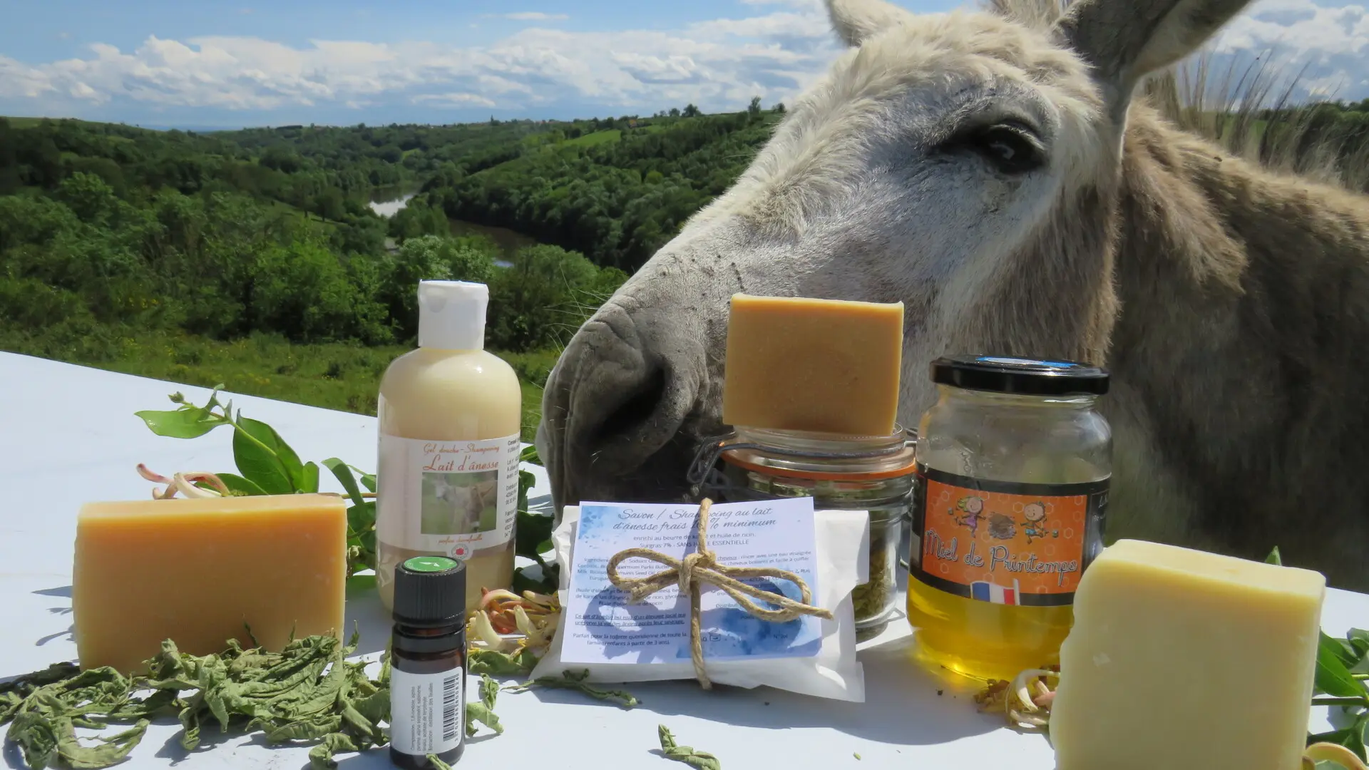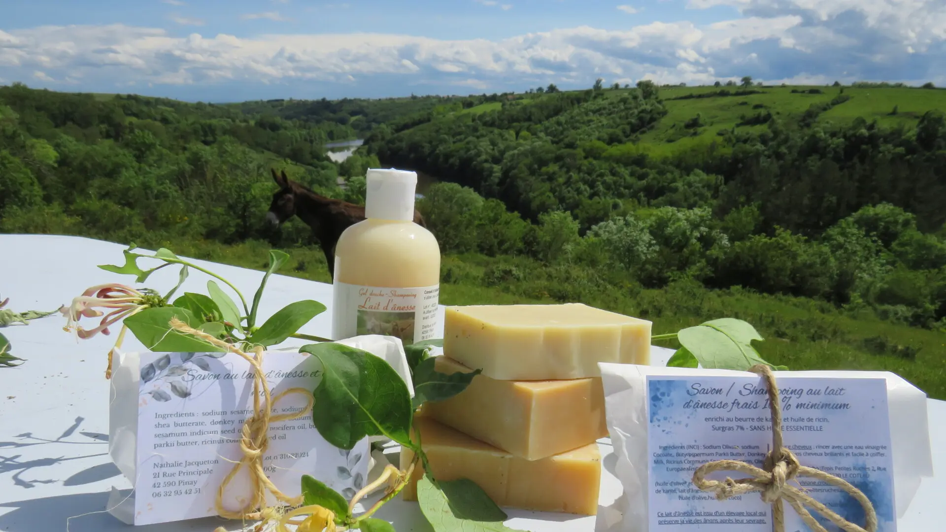 Savons et gel douche fabriqués avec du lait d'ânesse - Vente à la propriété et visite de l'exploitation possible sur rendez-vous minimum 48h à l'avance. Produits en vente dans les Offices de Tourisme de Forez-Est.