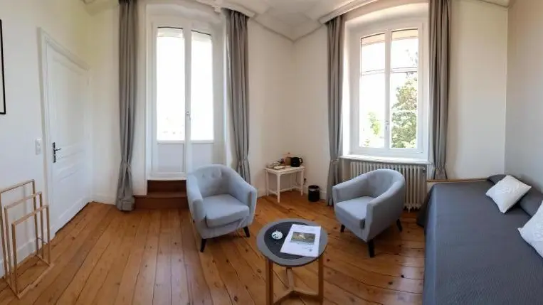 Cette maison d'hôtes est composée de trois chambres. Elles ont toutes été restaurées avec goût et confort, et possèdent chacune une ambiance cosy et chaleureuse. Le copieux petit déjeuner sera servi dans la spacieuse et lumineuse salle à manger avec vue sur le parc de la propriété.