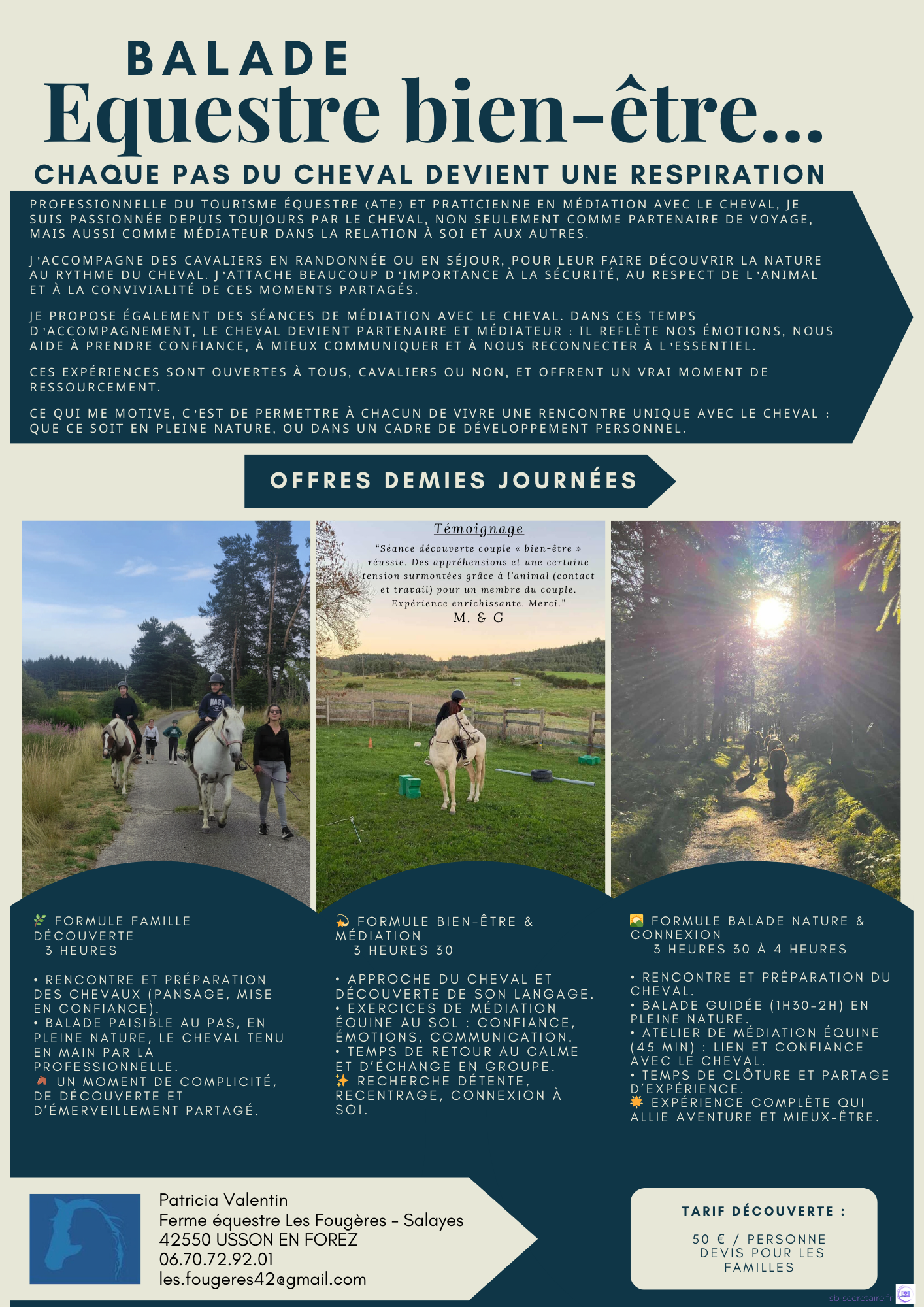 Patricia Valentin (diplômée Accompagnateur de Tourisme Équestre - en préparation du BP JEPS et Equipraticienne Relationnelle) vous propose :
