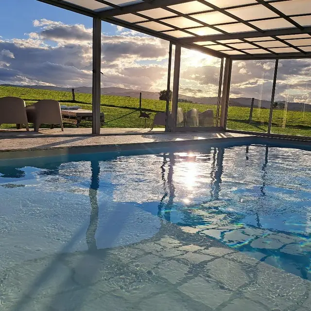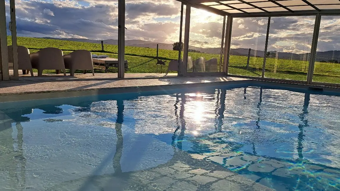 Au milieu du domaine de 33 hectares, gîte de 80 m² : grand séjour avec larges baies vitrées offrant des vues superbes sur la campagne environnante. Étang privé, piscine chauffée toute l'année, spa sauna-hammam, pour 14 personnes.