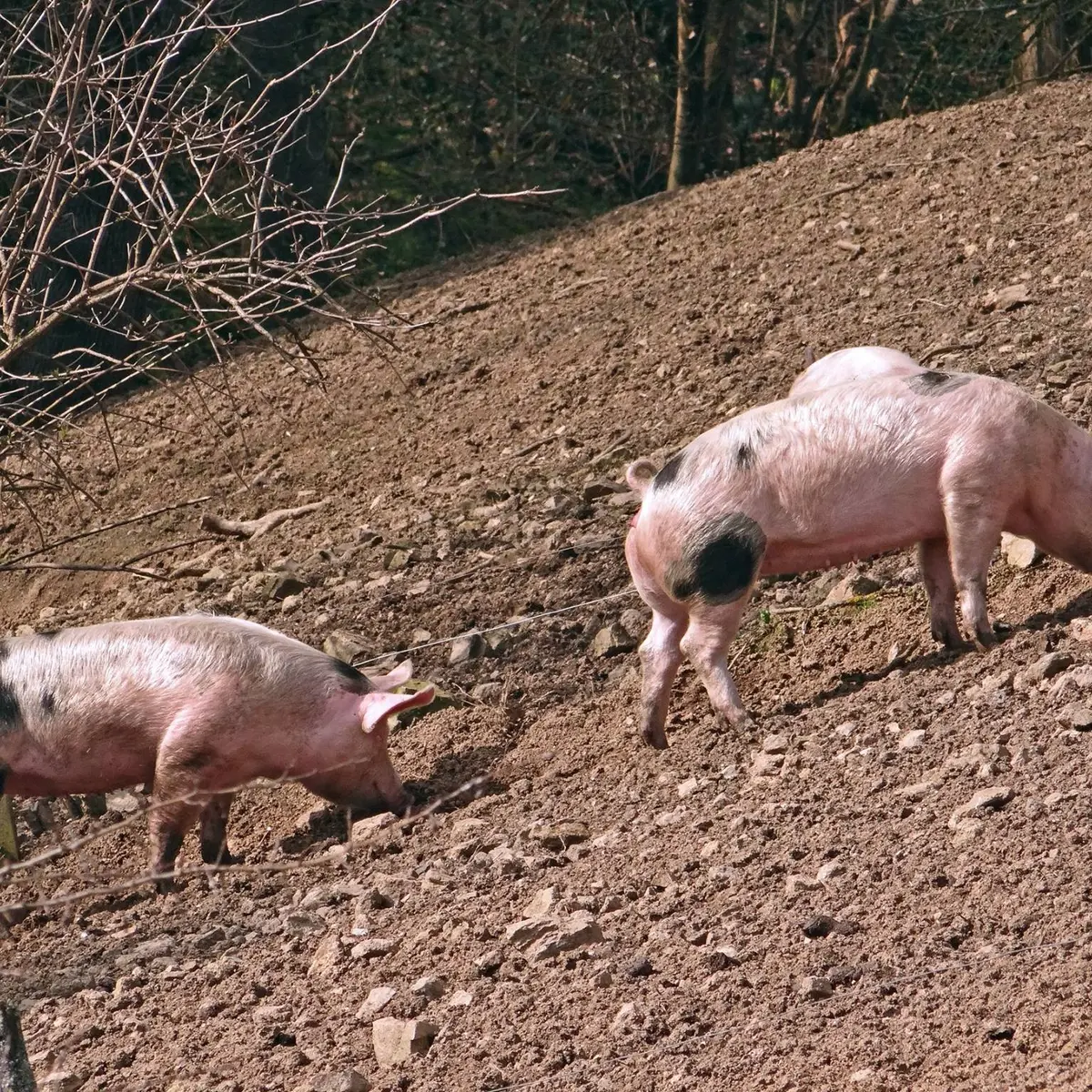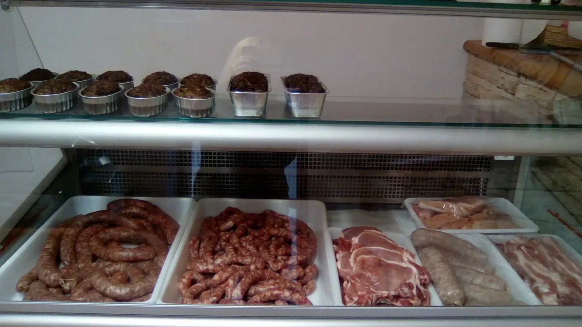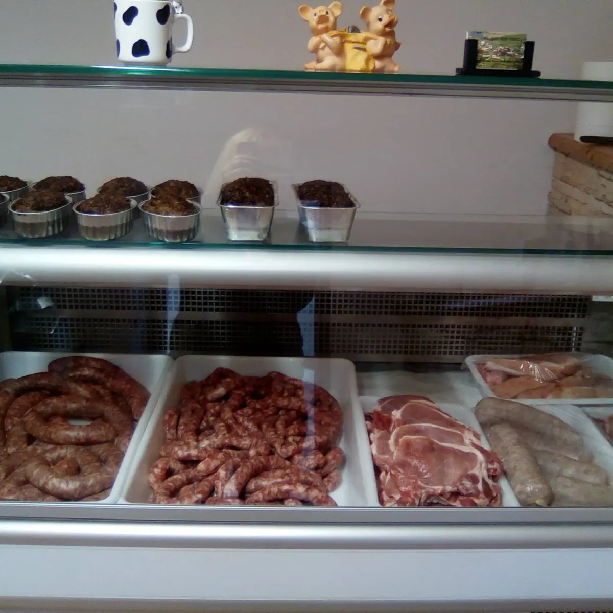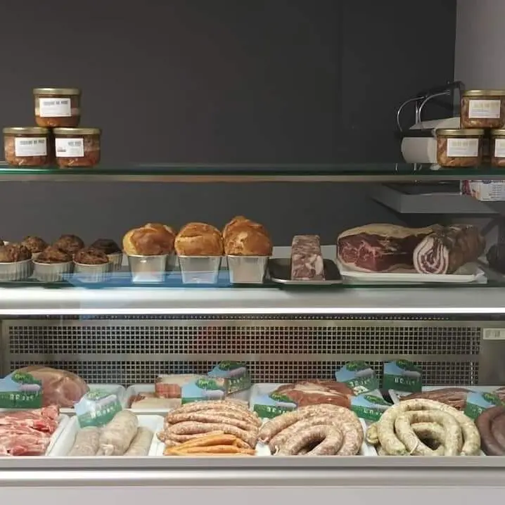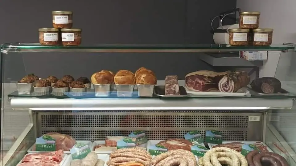 A la vente saucisses fraîches, de chou, de couenne, saucissons à cuire, godiveaux, porguez, côtes de porc, rôtis, rouelles, boudin, poitrine fraîche, sabardin, terrines au four, saucissons briochés, jambon blanc et cru, bocaux de terrines, pâtés de tête.
