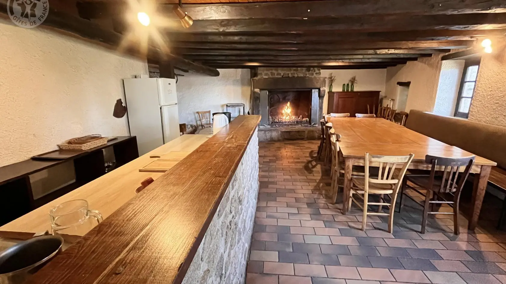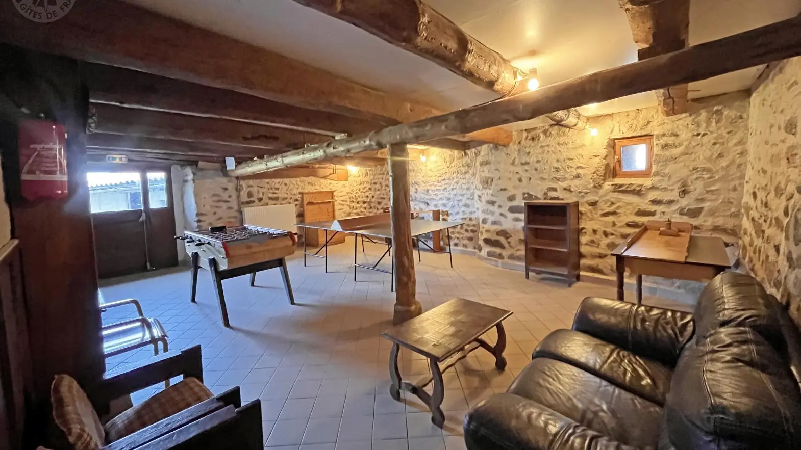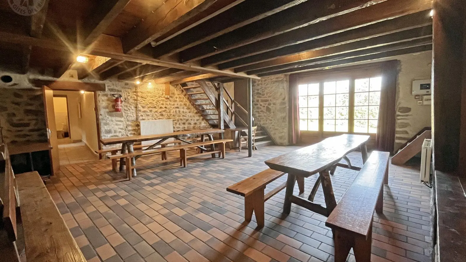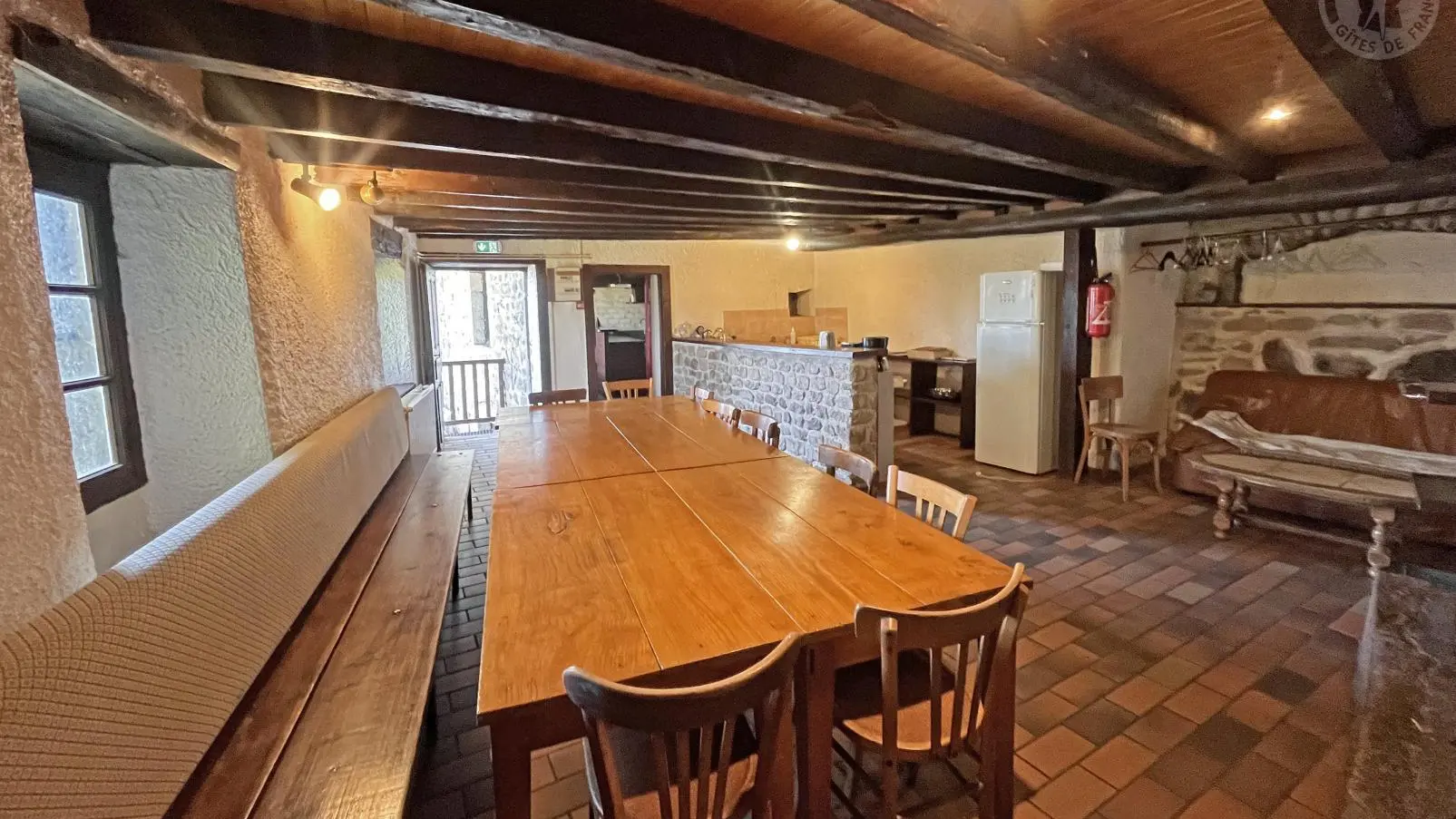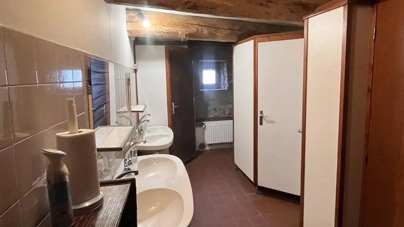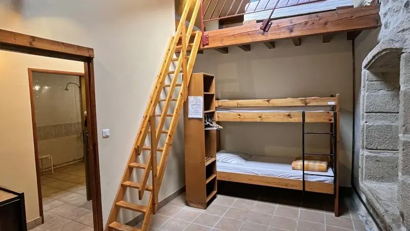 Gîte de groupe sur rez de chaussée et étage, 2 pièces à vivre dont 1 avec cheminée, cuisine, salle de jeux (ping-pong,baby-foot), 4 chambres (de 4 à 1 pers), dortoirs (de 11 à 6 pers), 9 lavabos, 5 wc, 6 douches (1 sanitaire accès handicapés). Partie étape accès indépendant : cuisine, 1 chambre (2 pers), sanitaires.