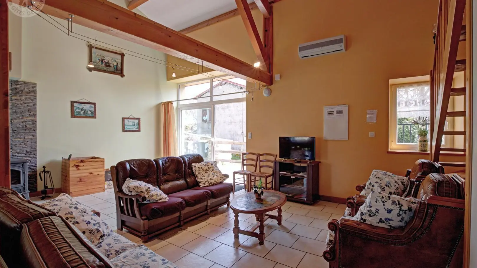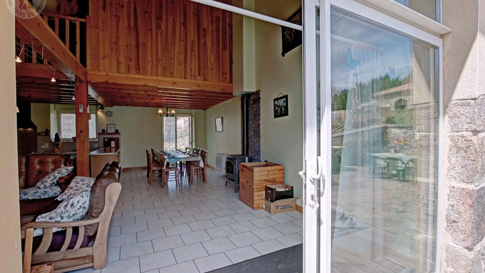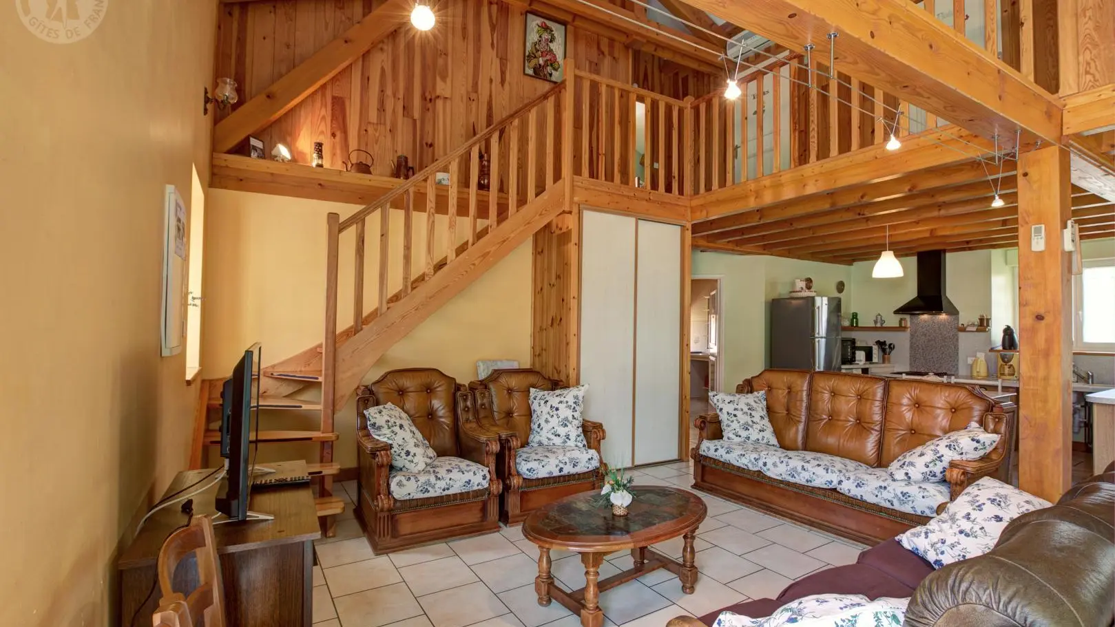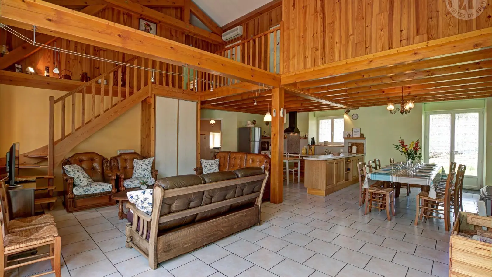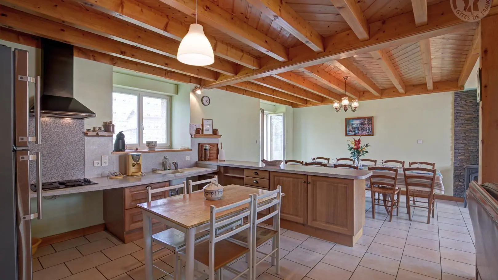 Gîte en pierres de 130 m² sur rez de chaussée + étage. Vaste séjour avec cuisine équipée, espace repas, coin salon (poêle à bois), baie vitrée, toute hauteur jusqu'au toit. 1 chambre + 1 salle d'eau avec wc au rez de chaussée, 3 chambres + salle d'eau + wc à l'étage. Chauffage aérothermie.