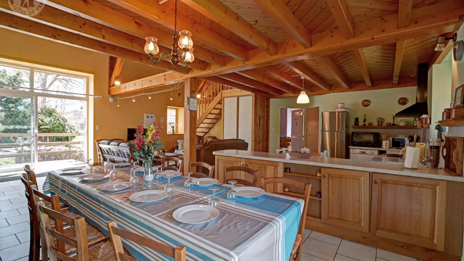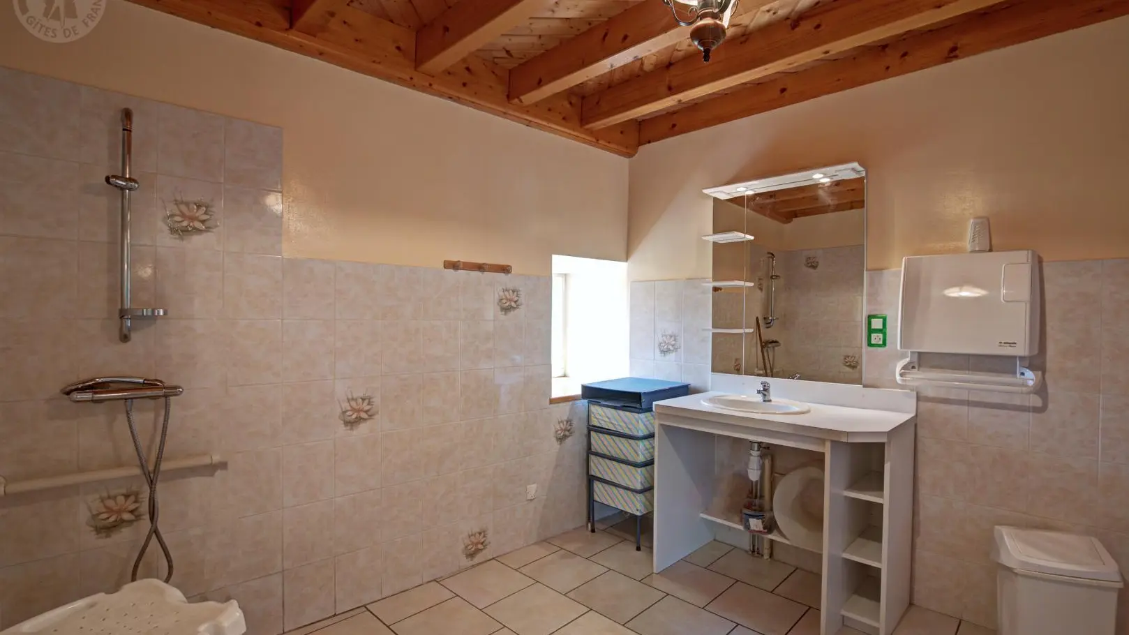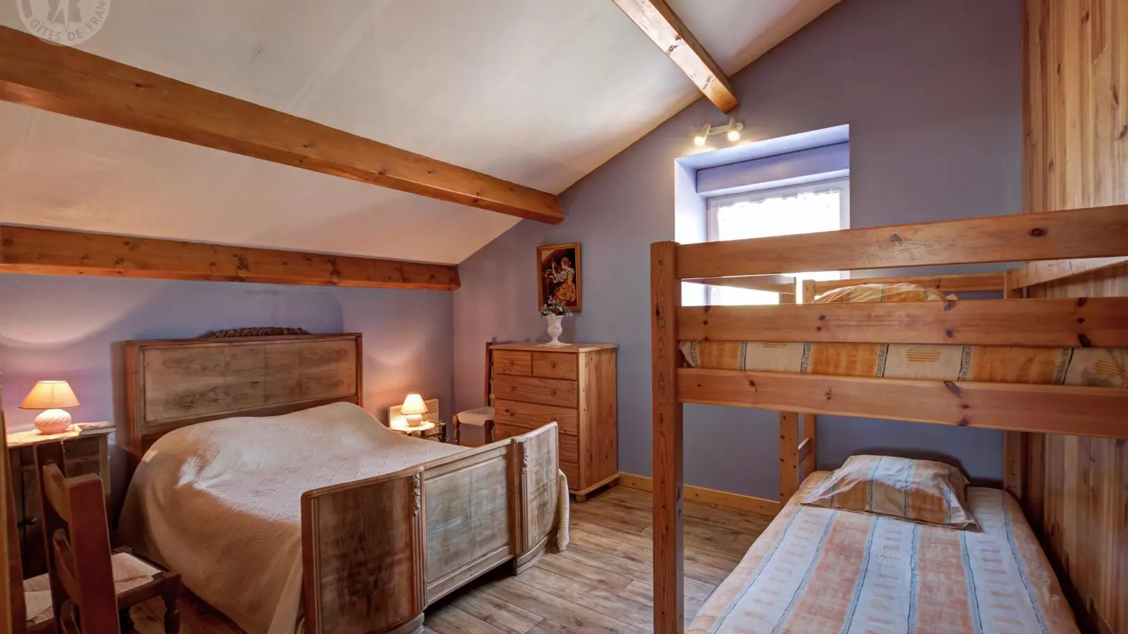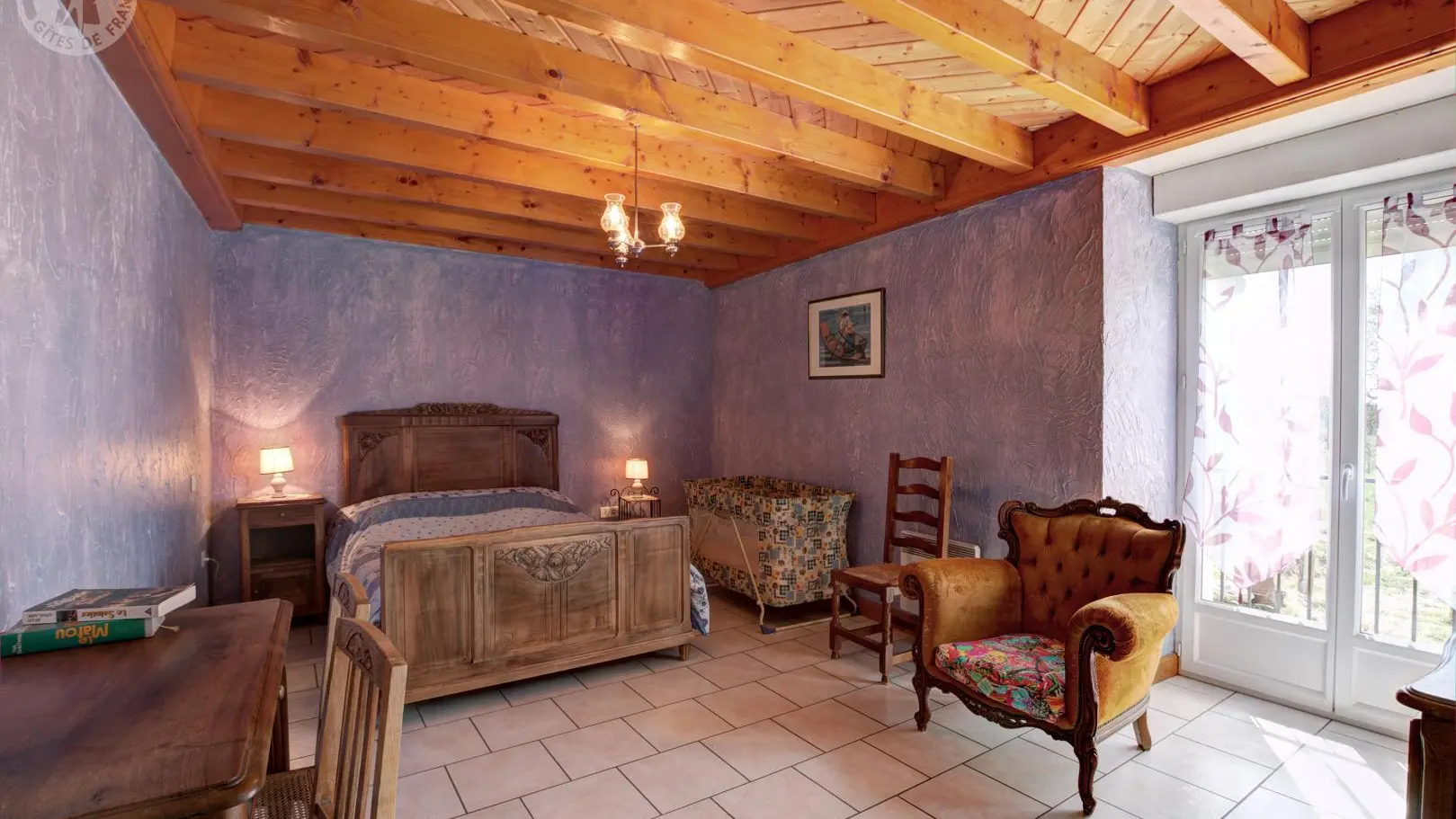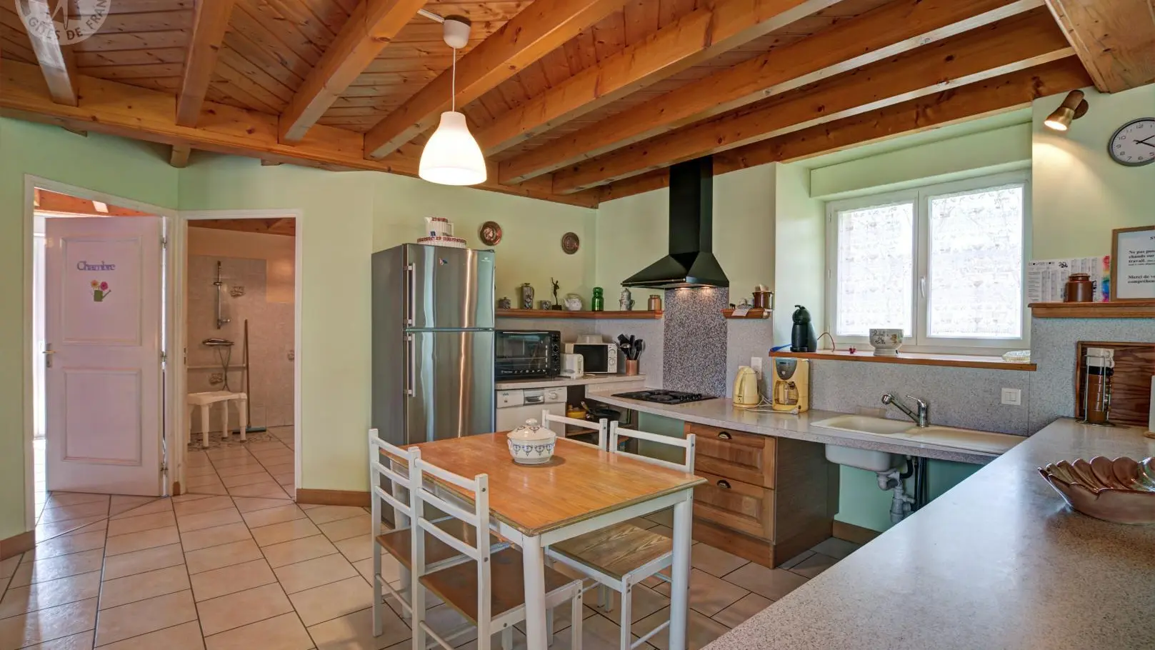 Gîte en pierres de 130 m² sur rez de chaussée + étage. Vaste séjour avec cuisine équipée, espace repas, coin salon (poêle à bois), baie vitrée, toute hauteur jusqu'au toit. 1 chambre + 1 salle d'eau avec wc au rez de chaussée, 3 chambres + salle d'eau + wc à l'étage. Chauffage aérothermie.