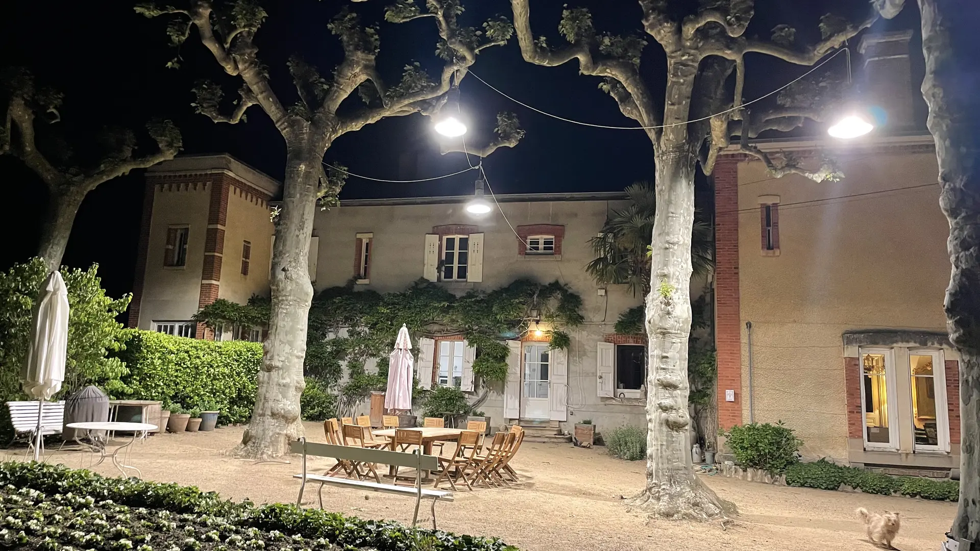 Une grande terrasse ombragée sous les platanes (barbecue, pétanque, Mölkky),