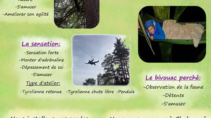 - Journée perchée : corde voyageuse (avec pique-nique perché) + moulinette + atelier sensationnel (tyrolienne chute libre, catapulte ou pendule)