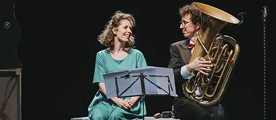 Un jour, Stella et Octave se retrouvent propulsés dans un lieu non identifié, qu’ils ne connaissent pas. Là où la foule, épuisée par toutes ses vocalises, a confiné notre chanteuse. Là où notre tubiste, exténué par une peur panique du monde extérieur, a voulu trouver refuge. Nous comprenons petit à petit avec eux qu’ils sont confinés sur un plateau de théâtre, dans ce laboratoire merveilleux qu’est la scène...