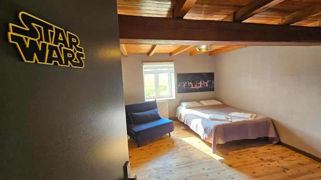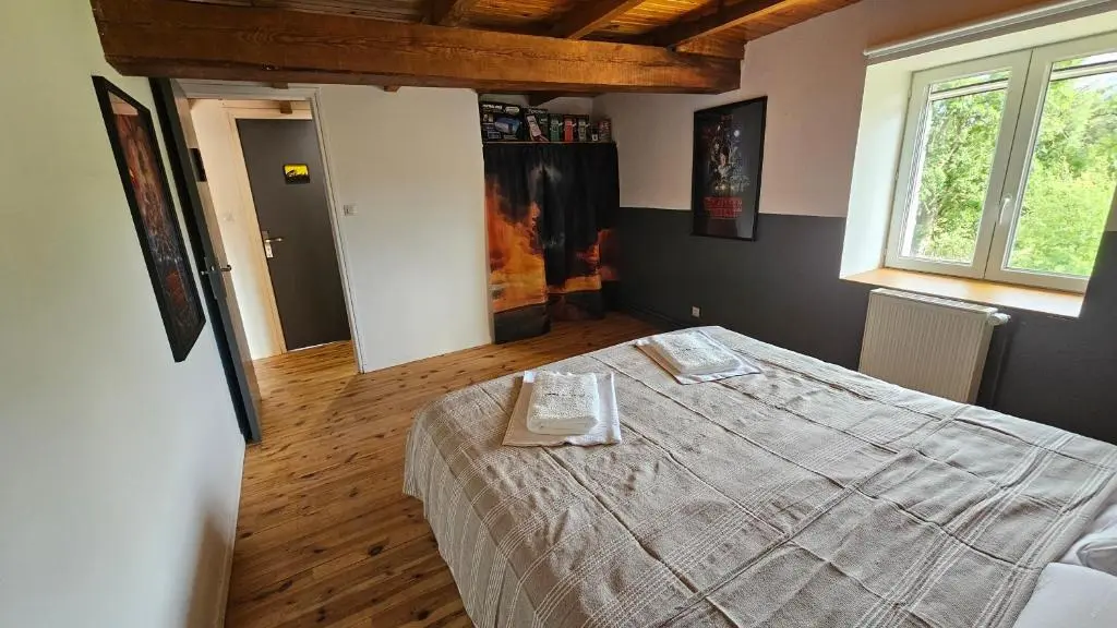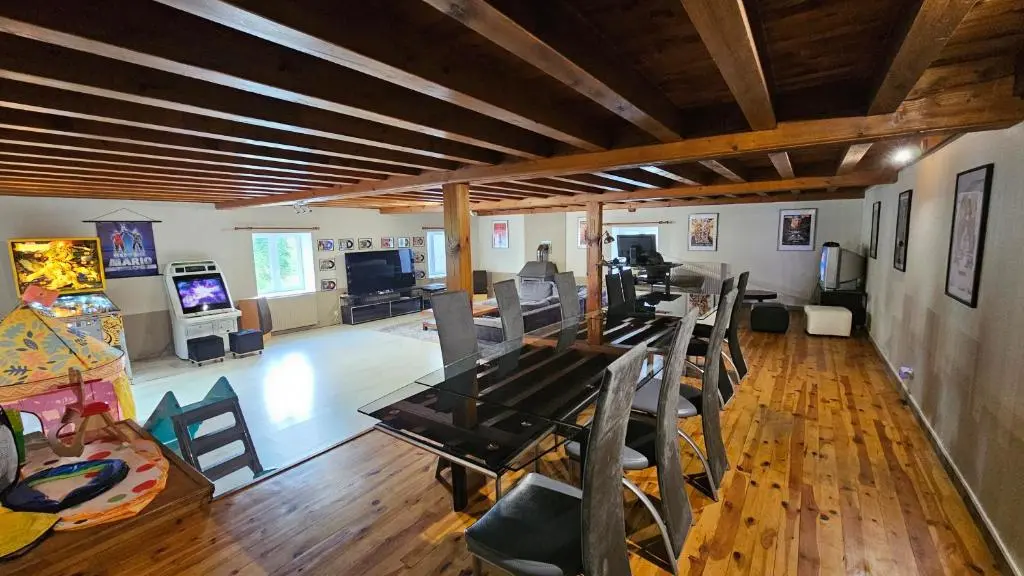 Grande ferme rénovée pouvant accueillir 12 personnes, à la campagne et non loin du centre-bourg d'Usson-en-Forez. Retrouvez des éléments de décor liés au cinéma pour un séjour original.